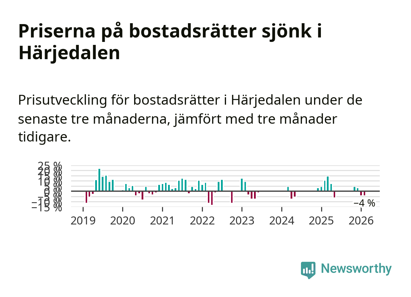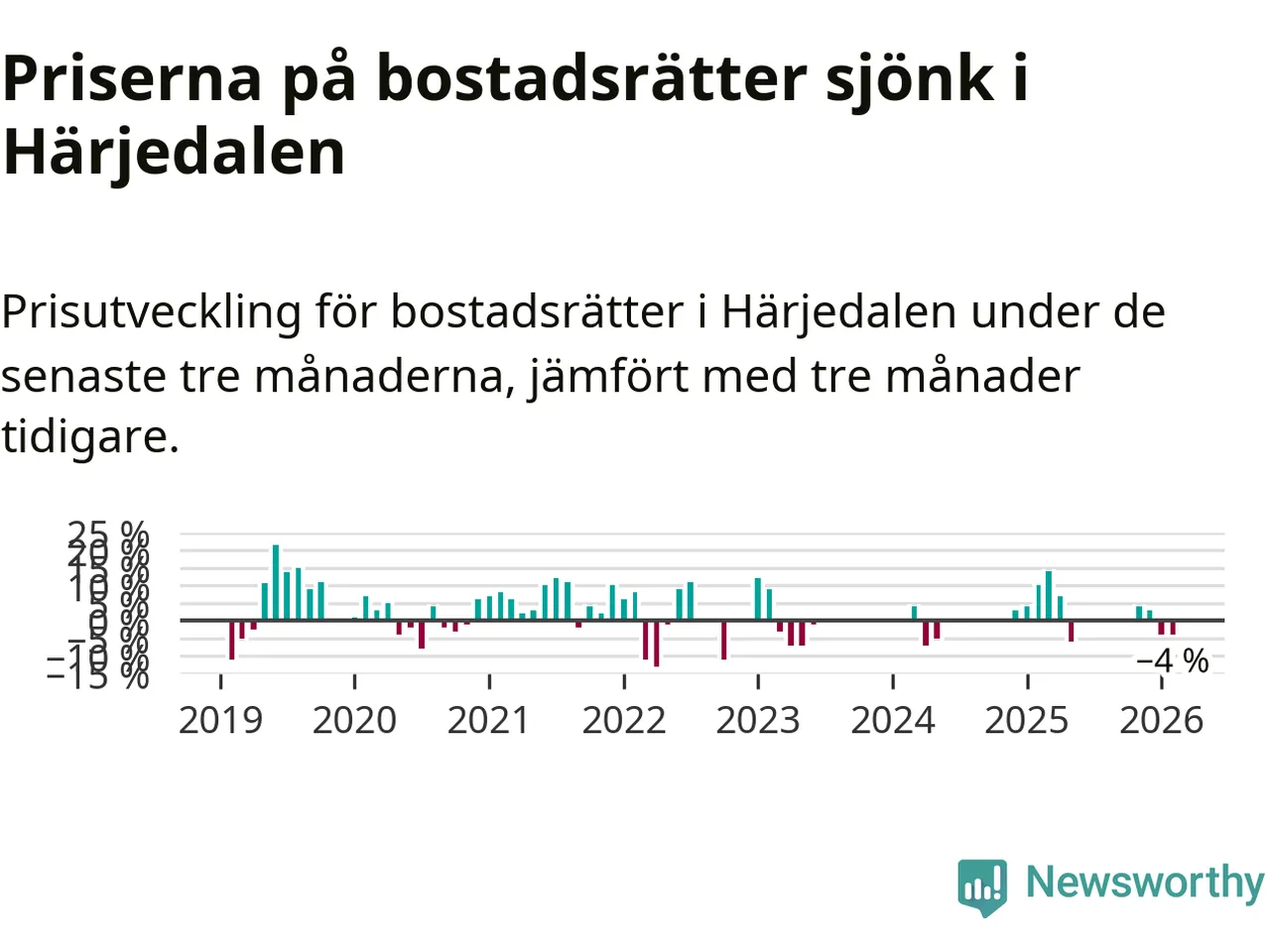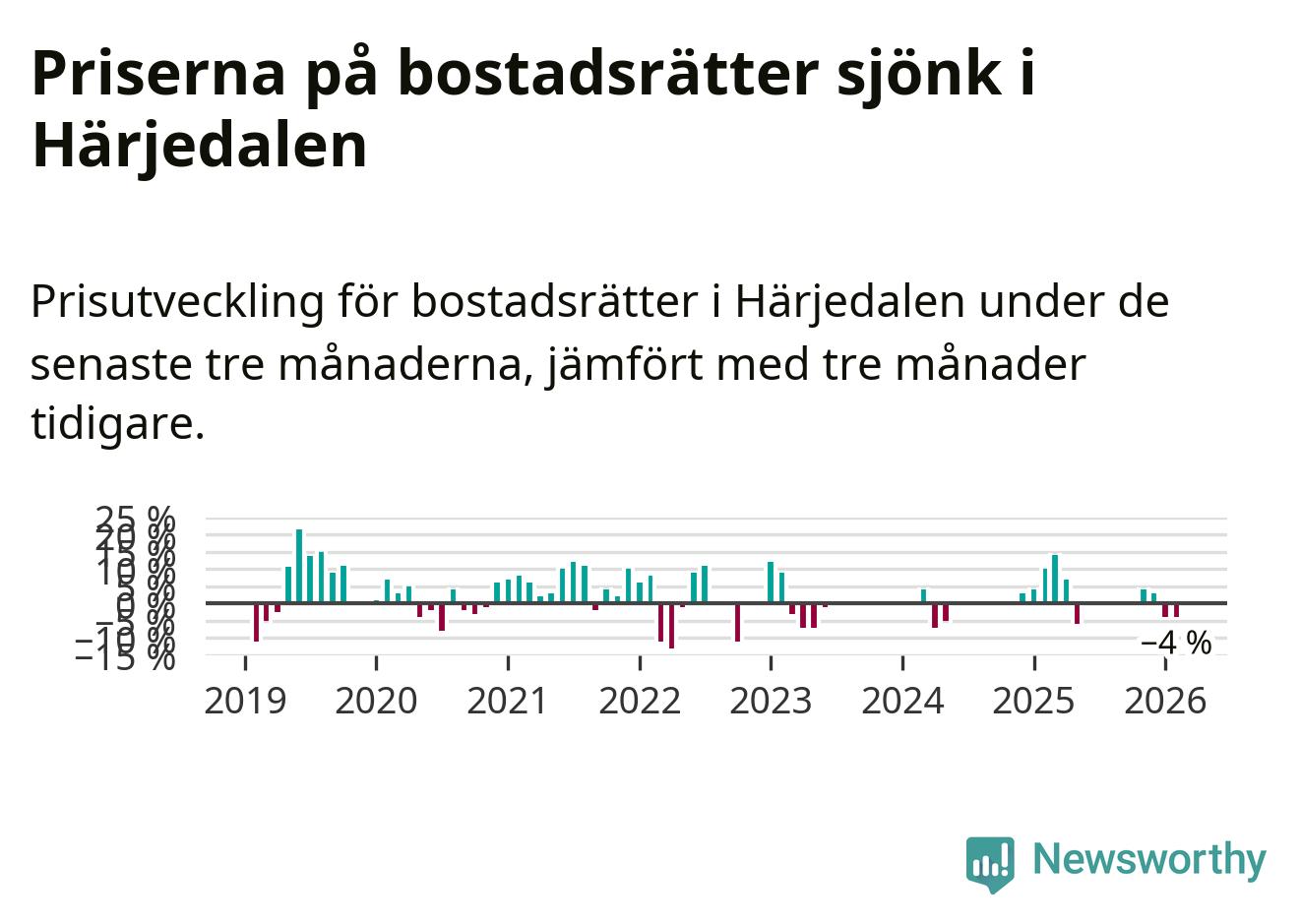 Priserna på bostadsrätter har gått ner i Härjedalens kommun. Medelpriset på försäljningarna under de senaste tre månaderna visar på en nedgång med 4 procent.