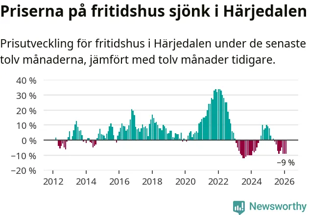 Priserna på fritidshus har gått ner i Härjedalens kommun. Medelpriset på försäljningarna under de senaste tolv månaderna visar på en nedgång med 9 procent.