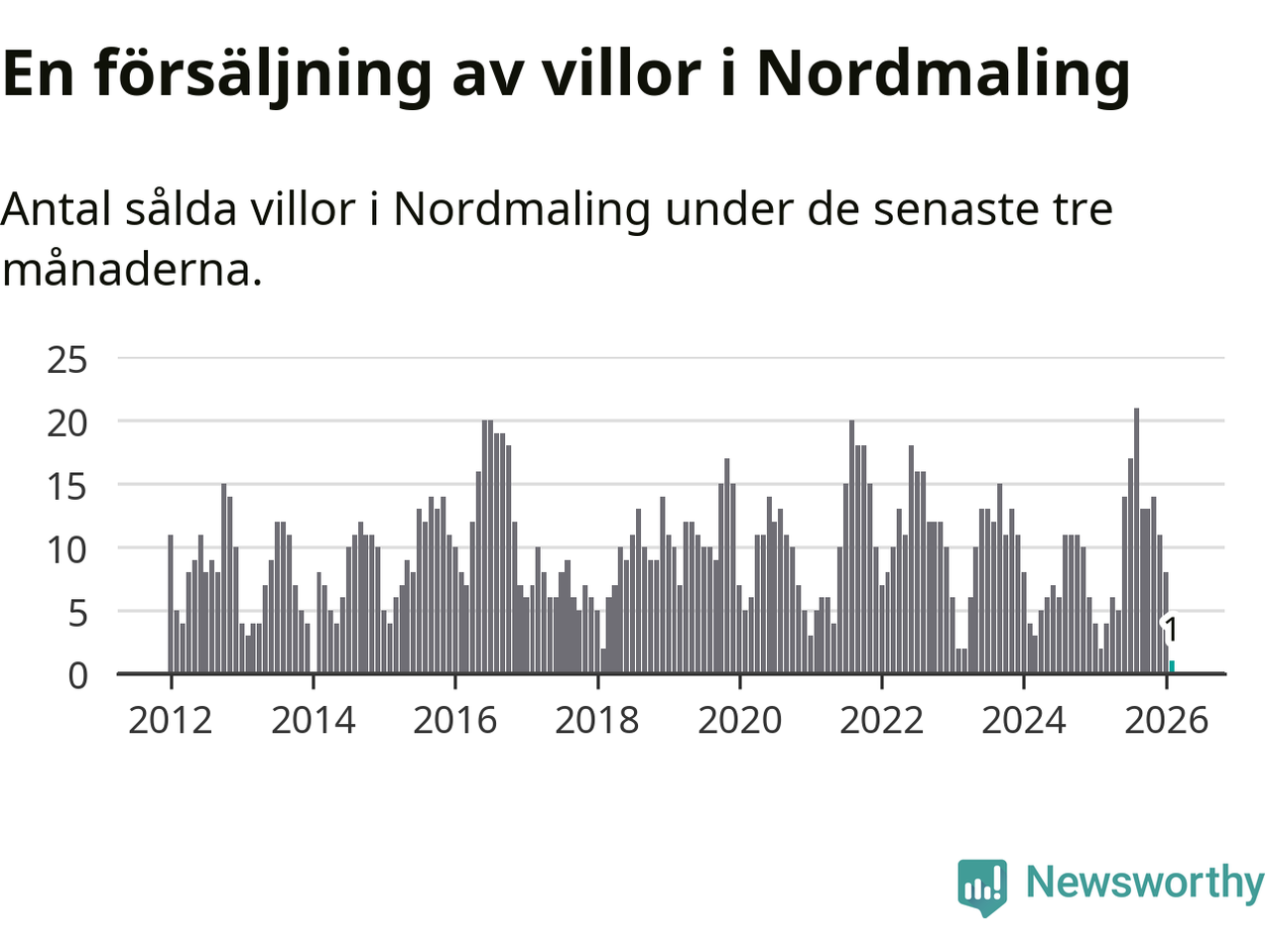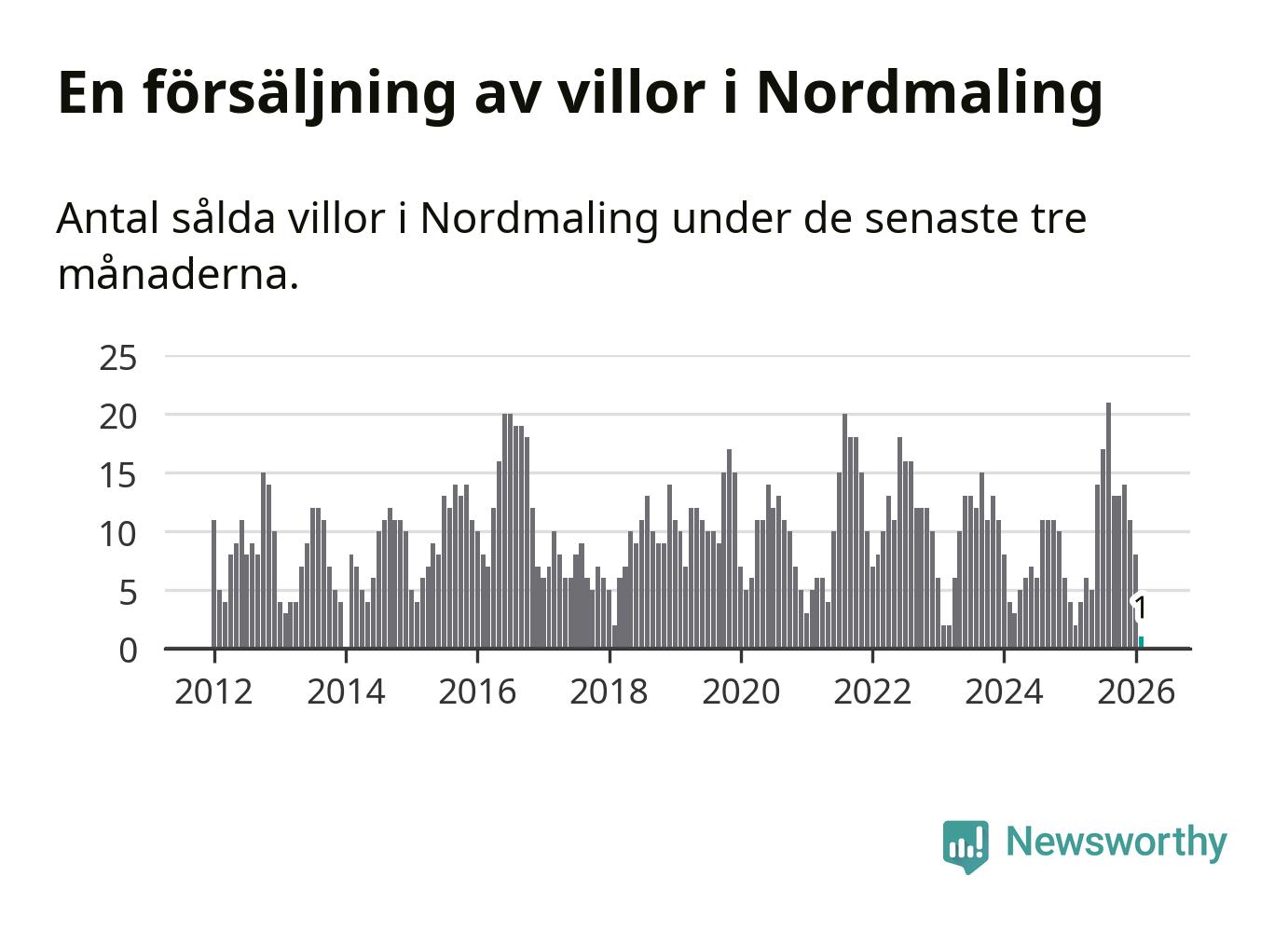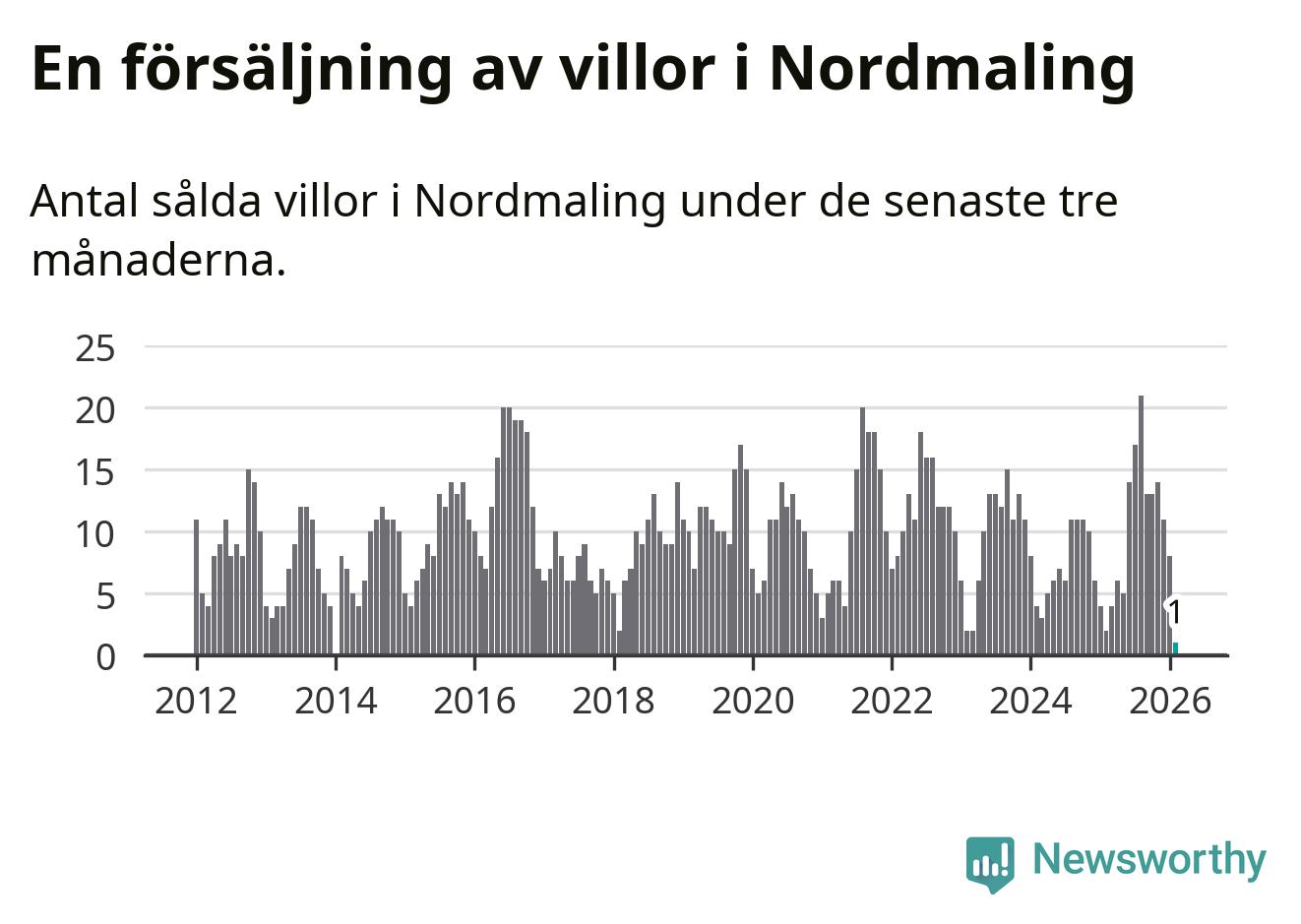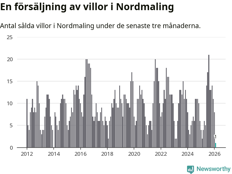 Mellan december och februari gjordes sammanlagt en affär med villor i Nordmalings kommun. Det kan jämföras med två vid motsvarande tid i fjol.