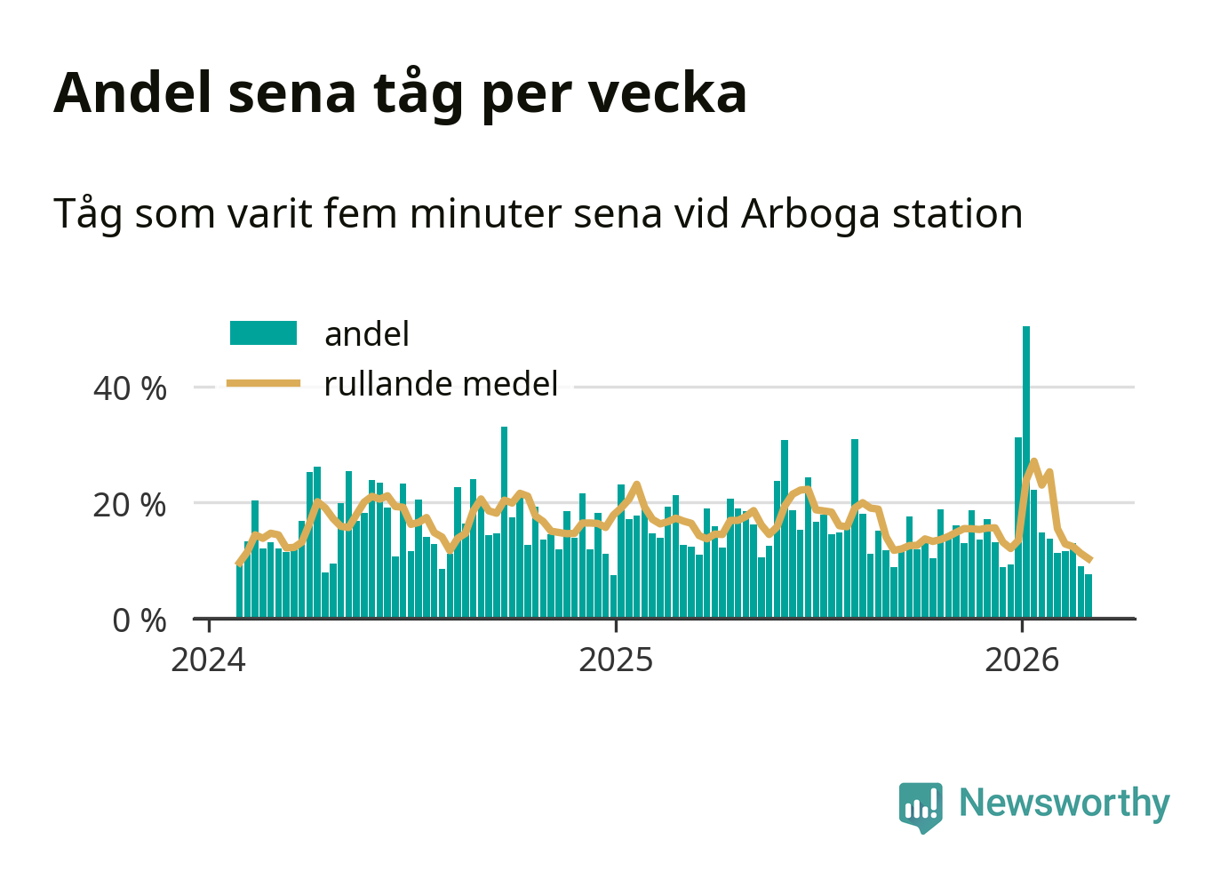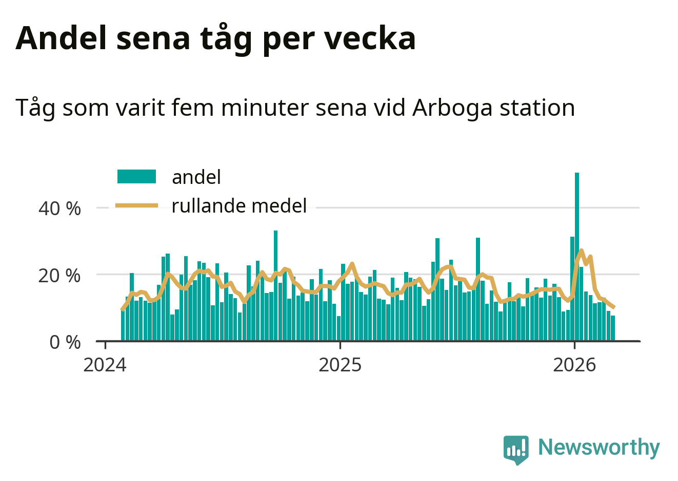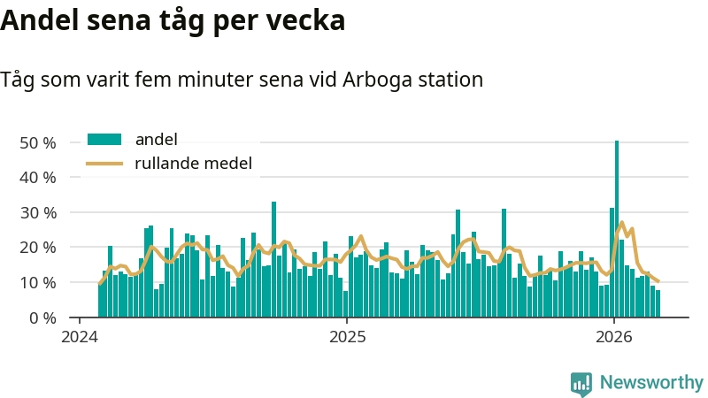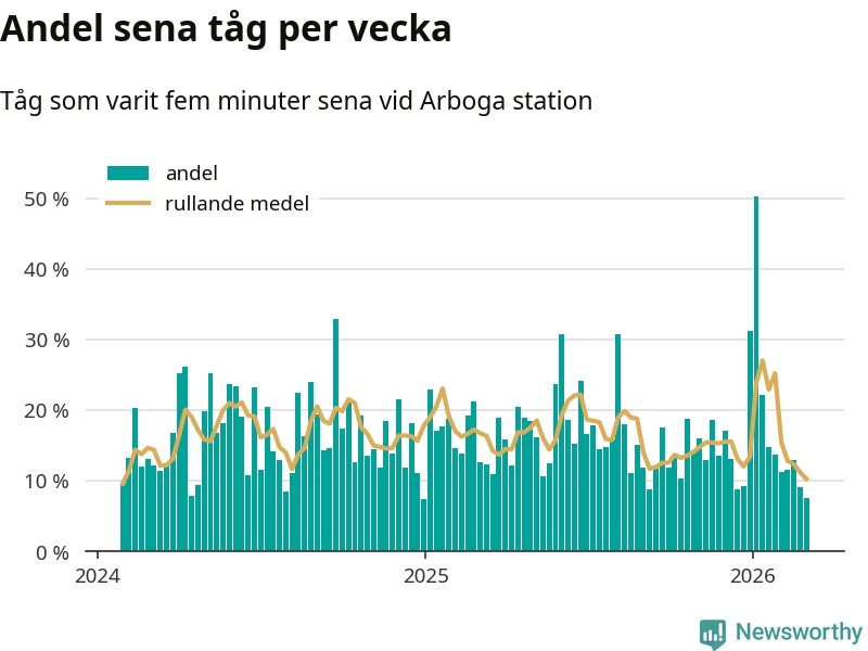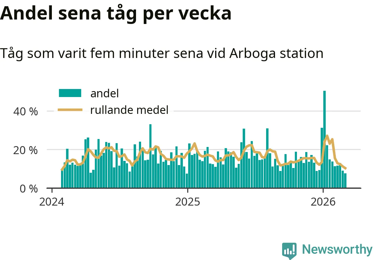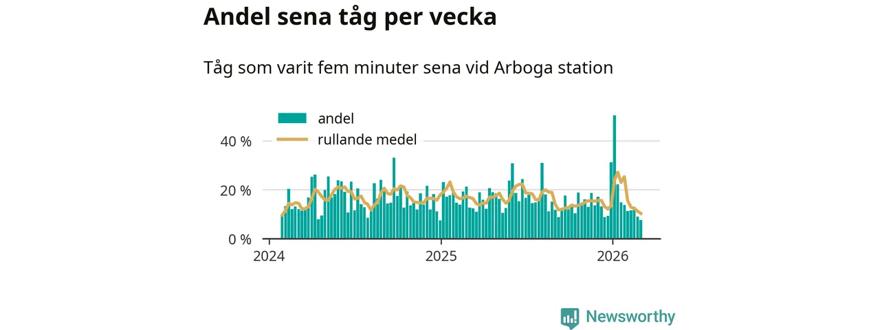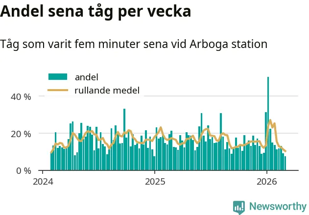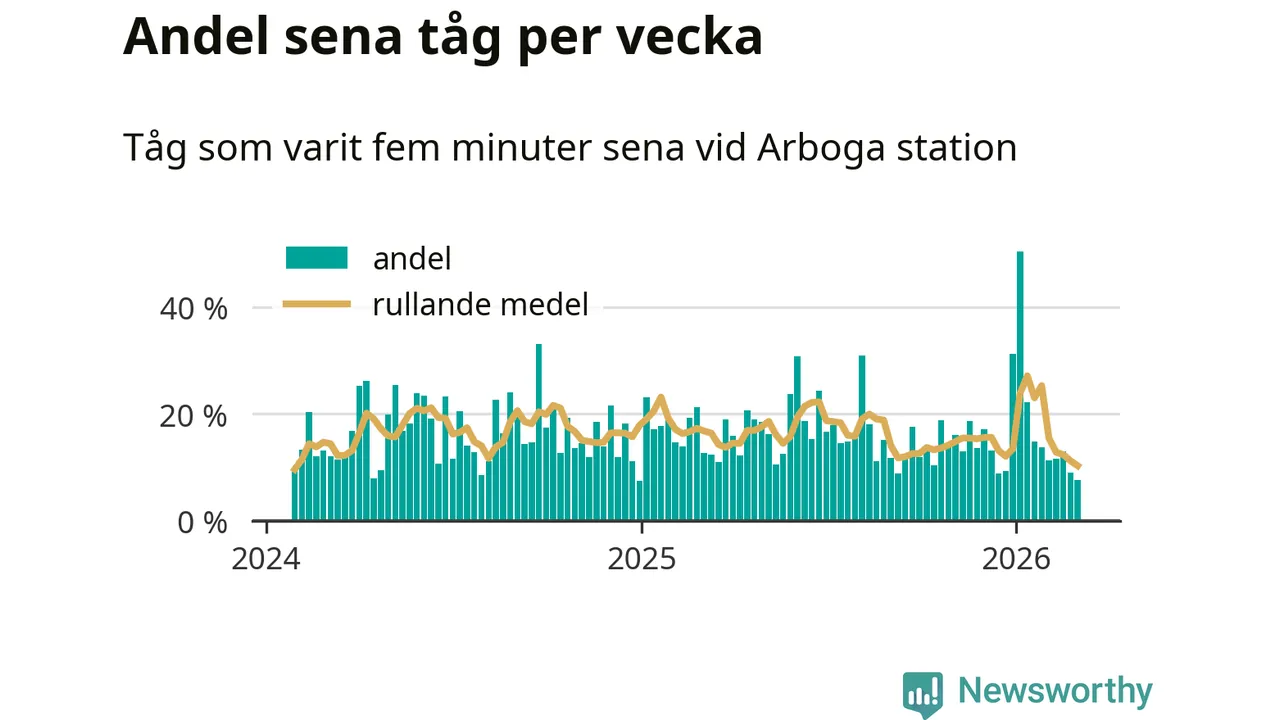Bara åtta procent av tågen var sena när de passerade Arboga station under vecka 10. Det är en ovanligt låg siffra. En genomsnittlig vecka är motsvarande siffra 17 procent, baserat på data som Newsworthy har samlat in sedan början av 2024.