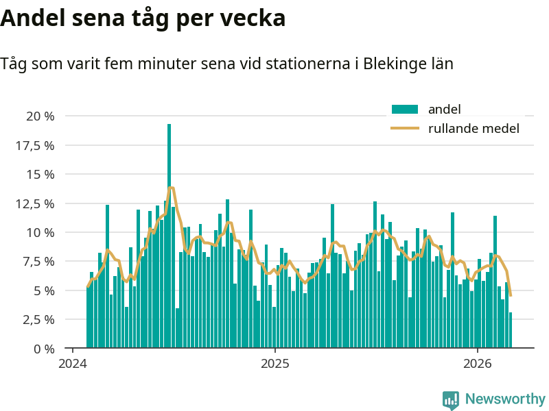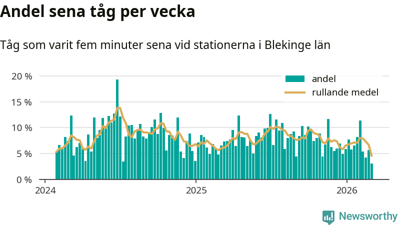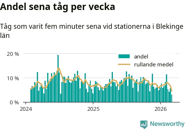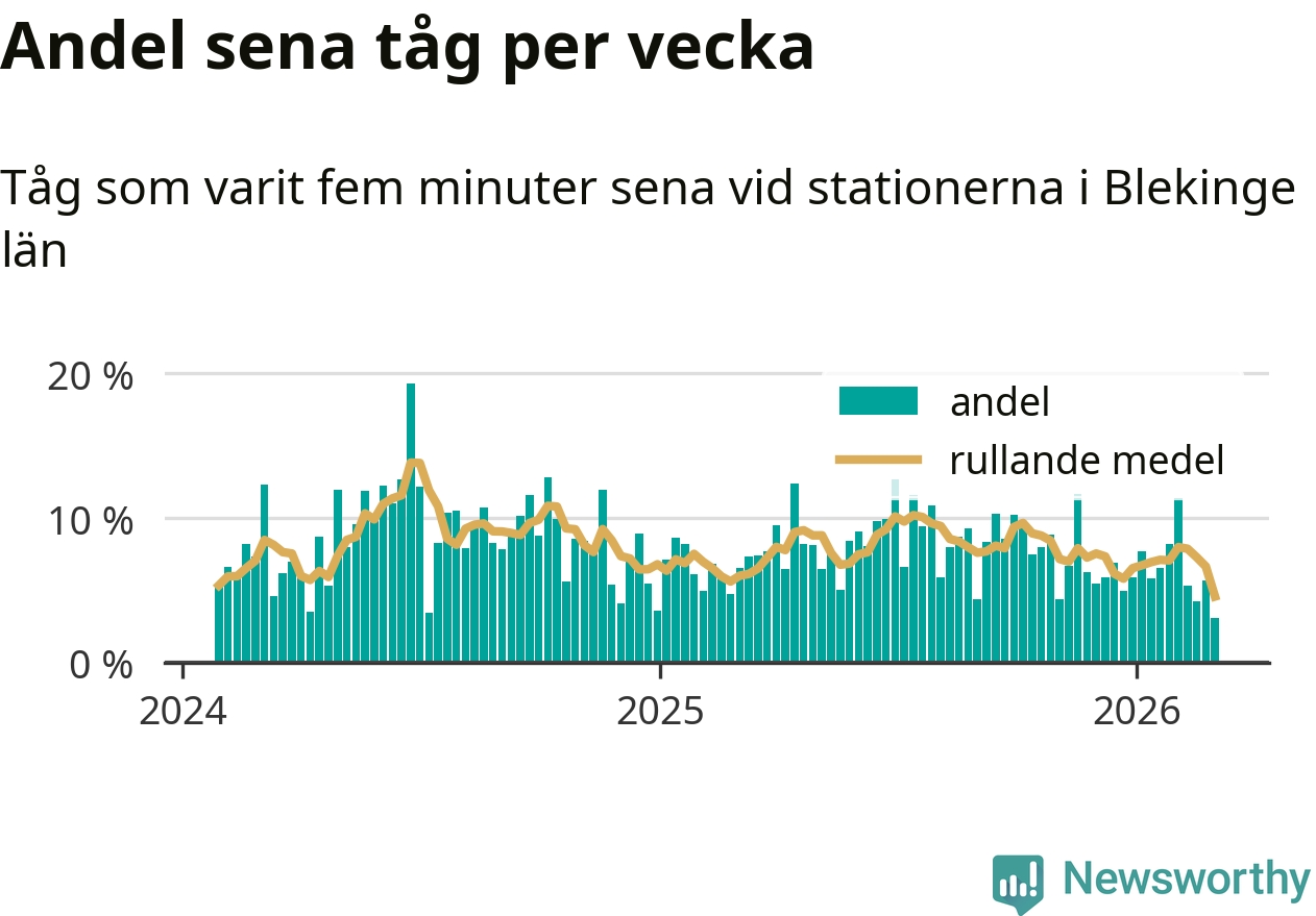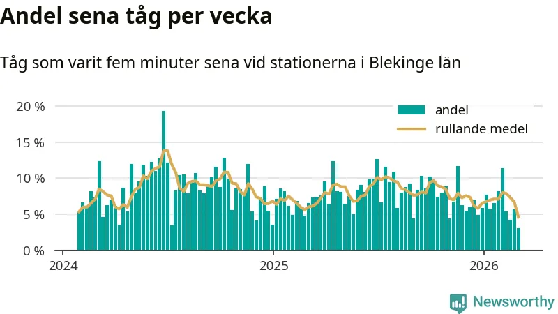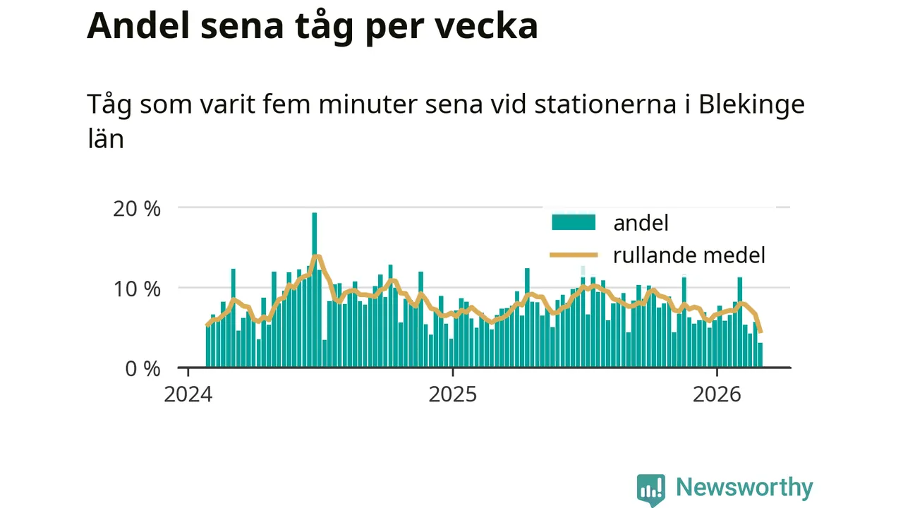 Bara tre procent av tågen var sena när de passerade någon av de 8 stationerna i Blekinge under vecka 10. Det är en ovanligt låg siffra. En genomsnittlig vecka är motsvarande siffra åtta procent,
