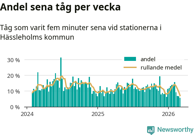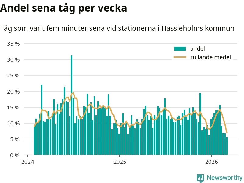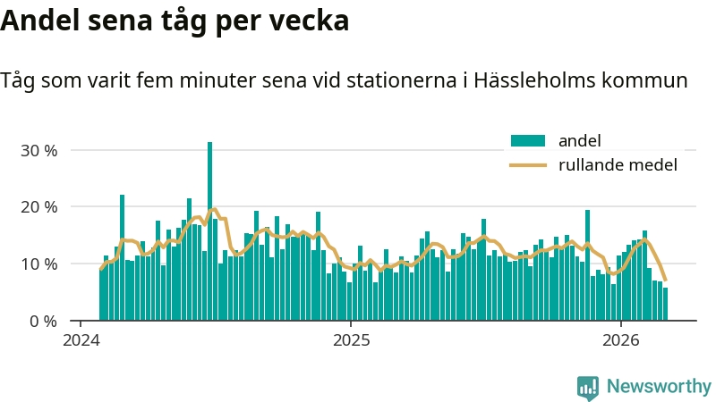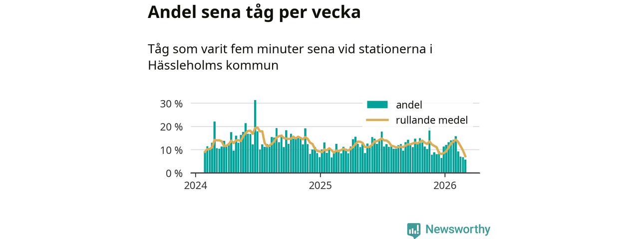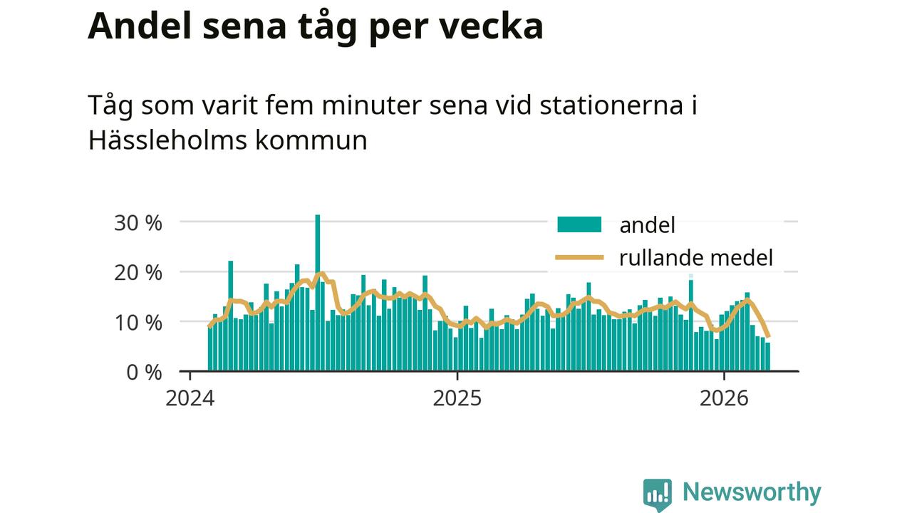 Bara sex procent av tågen var sena när de passerade någon av de 8 stationerna i Hässleholm under vecka 10. Det är en ovanligt låg siffra. En genomsnittlig vecka är motsvarande siffra 13 procent,