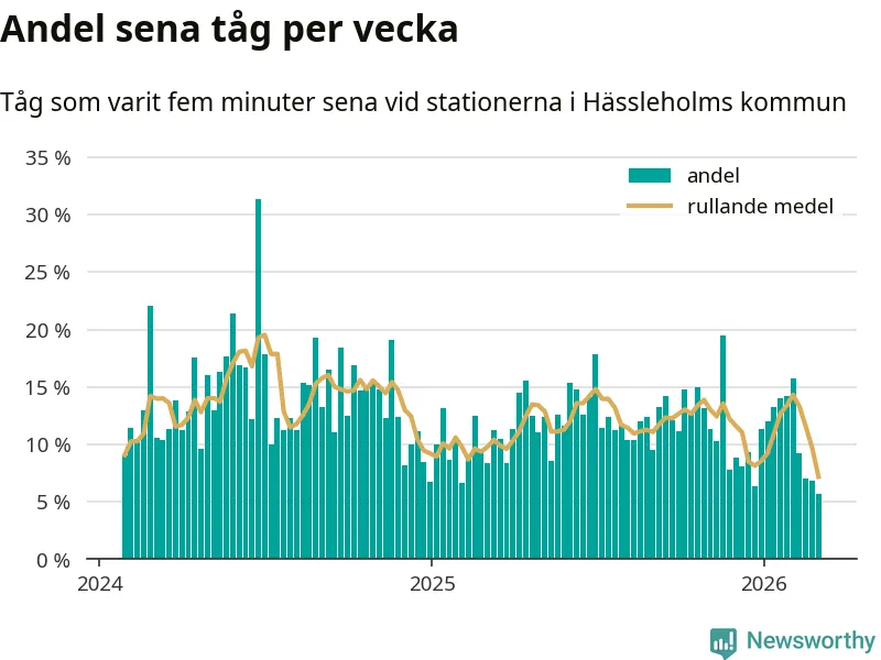 Förra veckan var andelen sena tåg den lägsta vid stationerna i Hässleholms kommun på åtminstone två år. Bara sex procent av tågen var sena.
