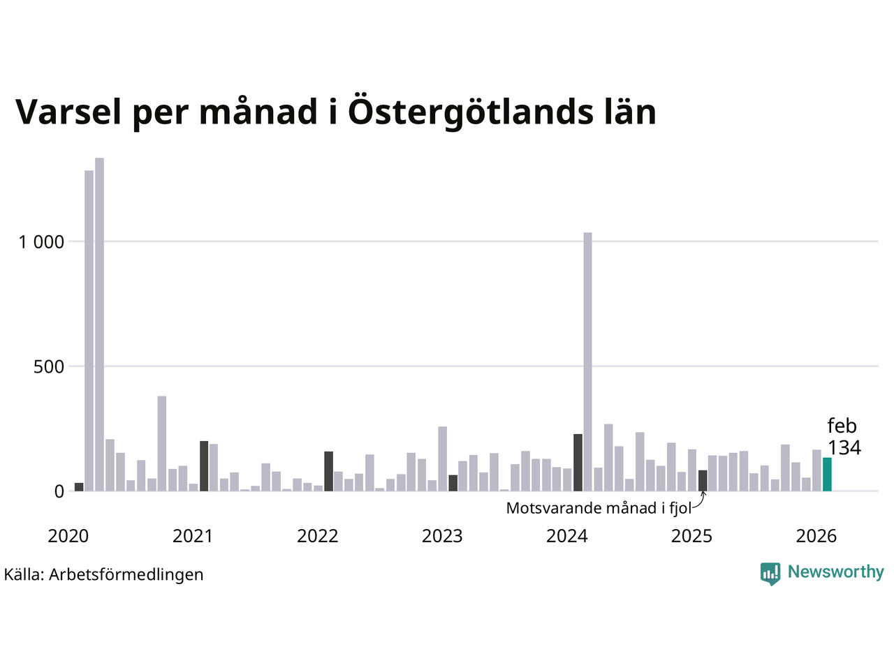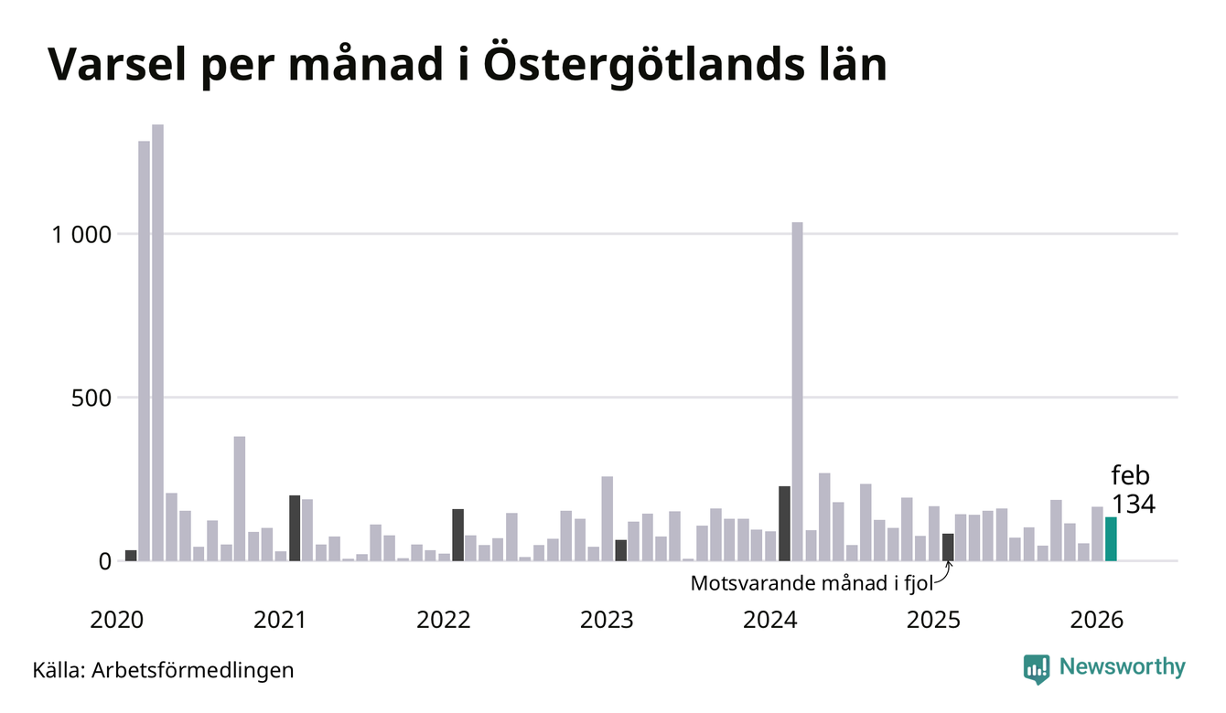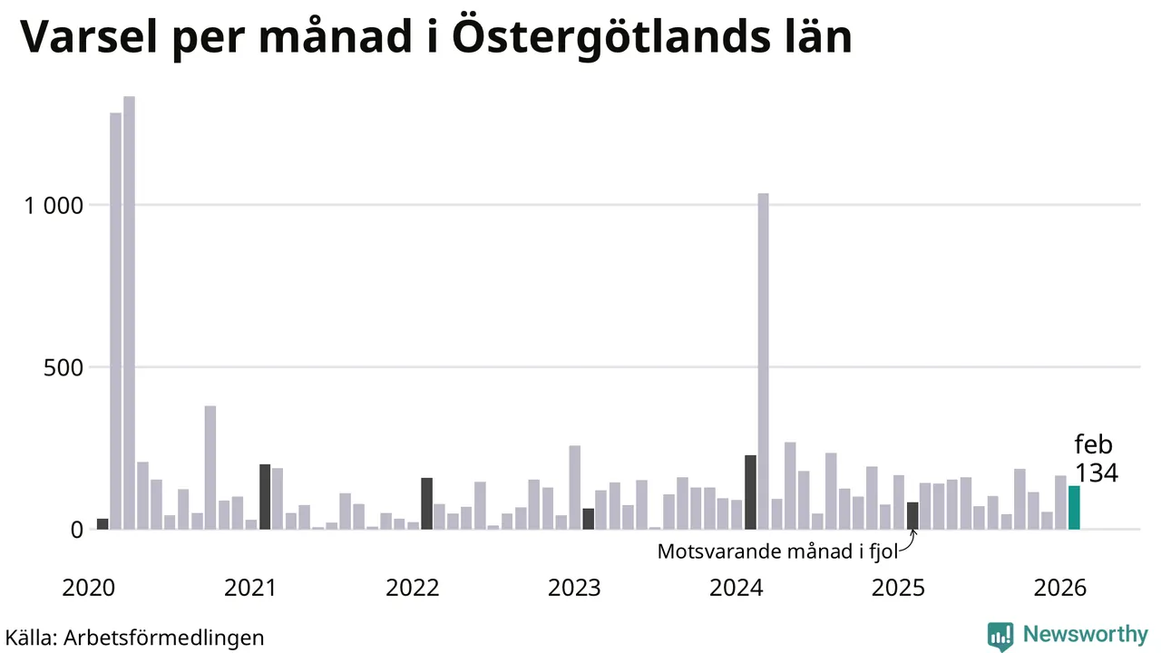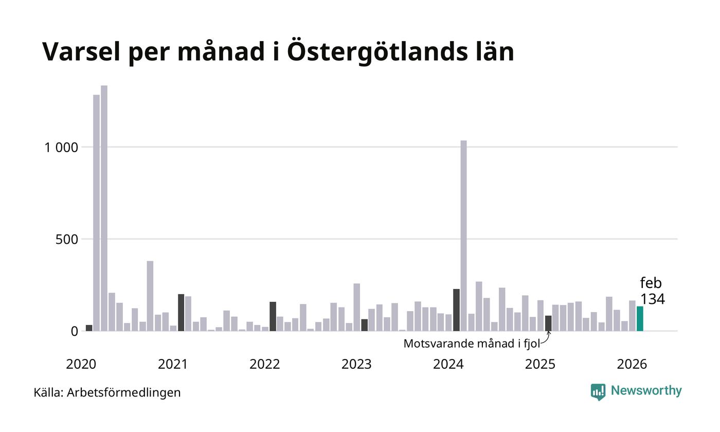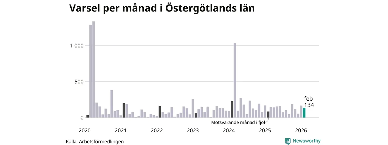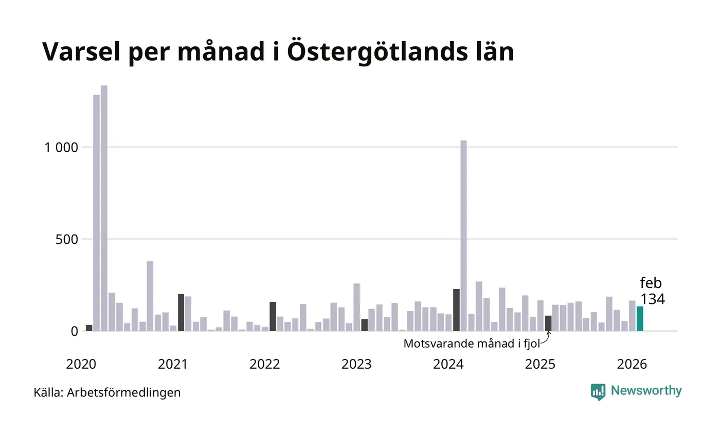 134 personer varslades om uppsägning i Östergötland under februari 2026. Det är 31 färre än i januari. För ett år sedan var antalet varsel 83 i länet. Sett över de tre senaste månaderna har totalt 352 varsel rapporterats i Östergötland, vilket är 24 fler än motsvarande period 2025. I början av pandemin, i april 2020, varslades som mest 1 333 personer under en månad i Östergötland.