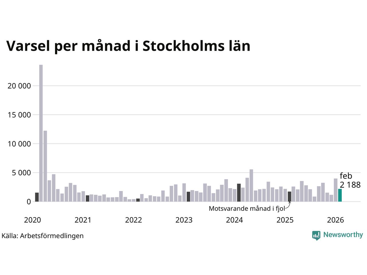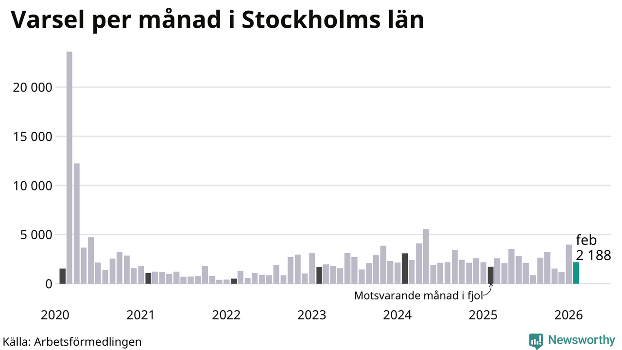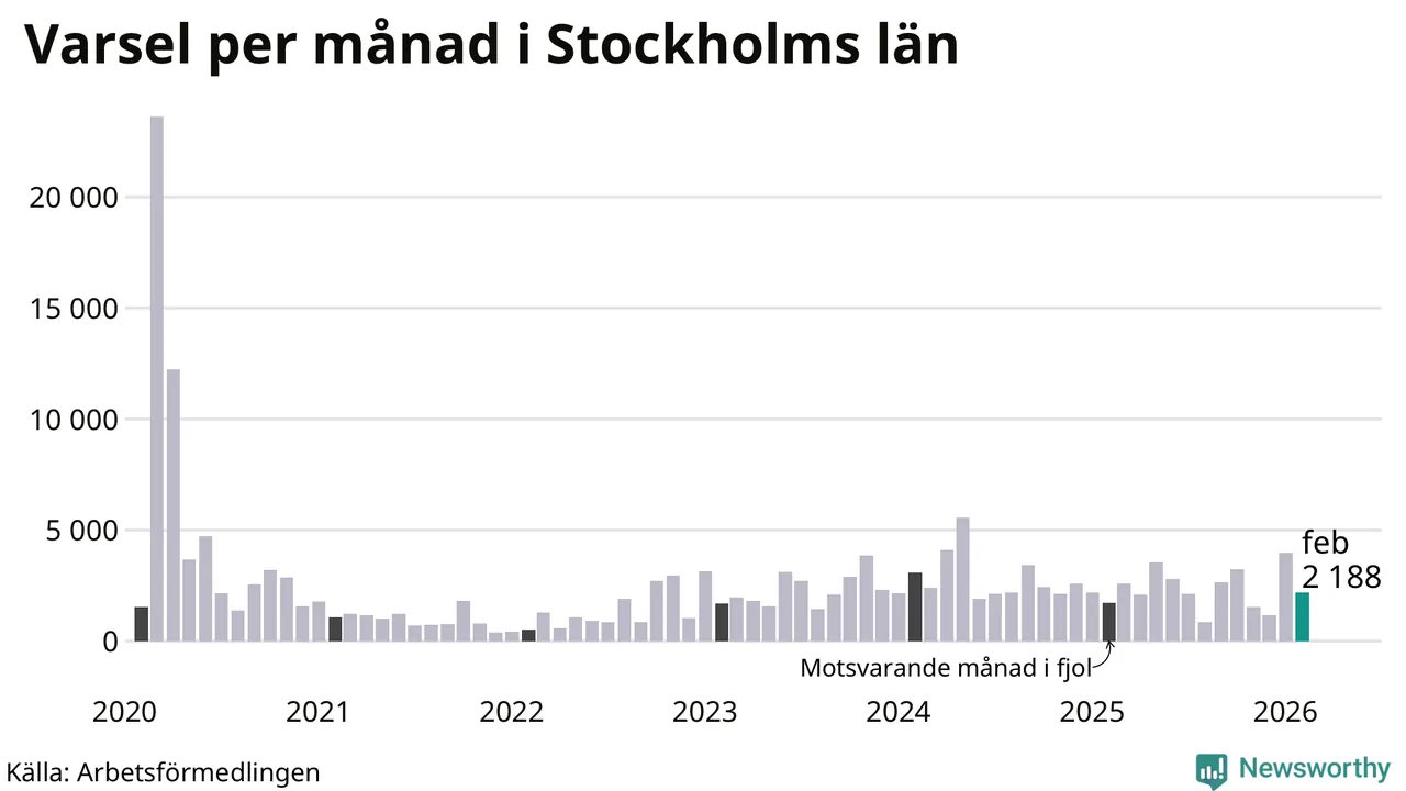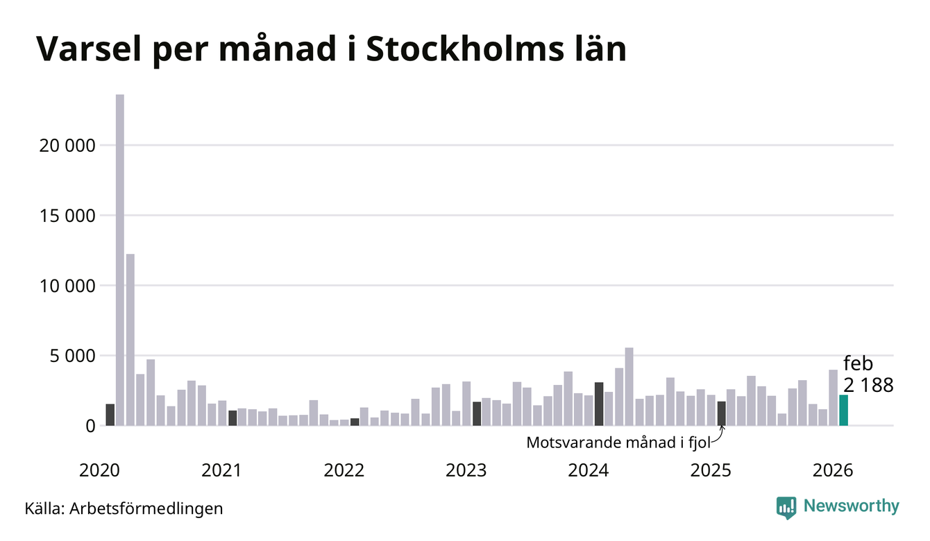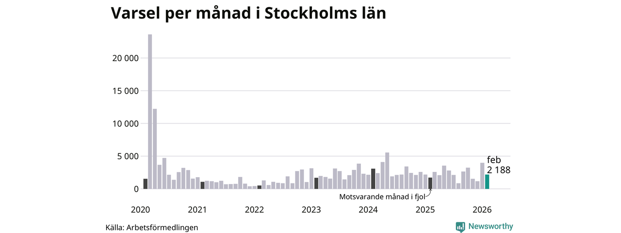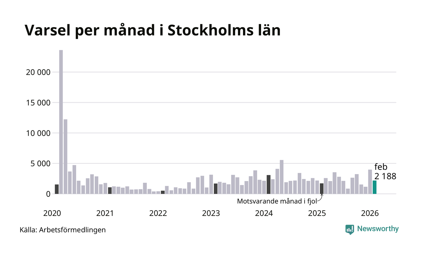 2 188 personer varslades om uppsägning i Stockholms län under februari 2026. Det är 1 797 färre än i januari. För ett år sedan var antalet varsel 1 715 i länet. Sett över de tre senaste månaderna har totalt 7 325 varsel rapporterats i Stockholms län, vilket är 816 fler än motsvarande period 2025. I början av pandemin, i mars 2020, varslades som mest 23 595 personer under en månad i Stockholms län.