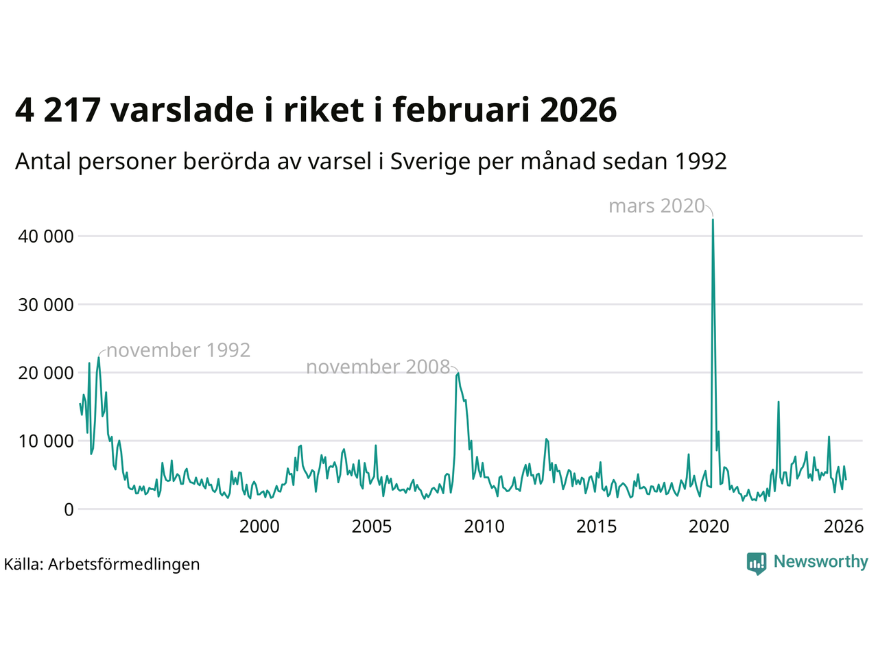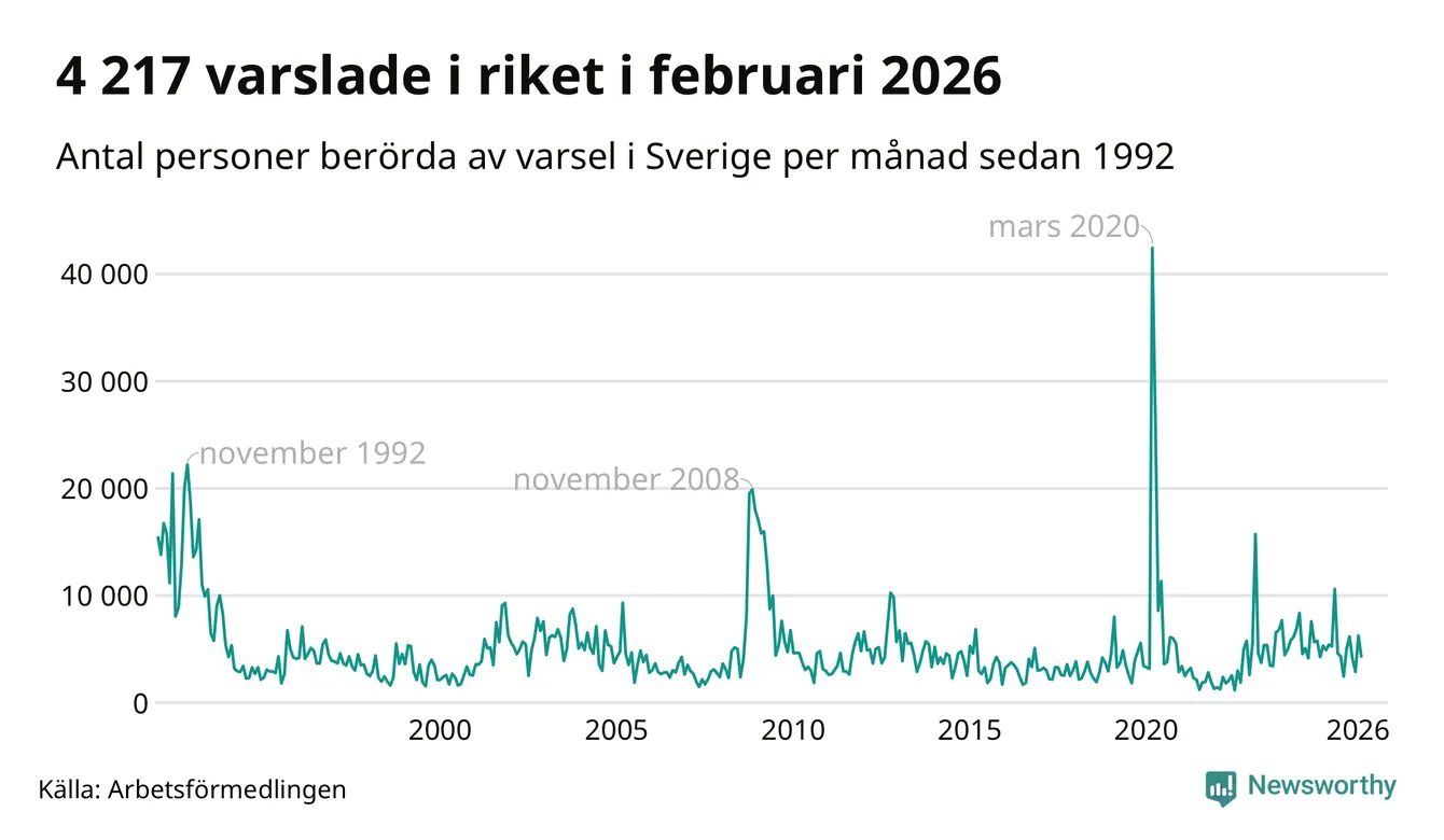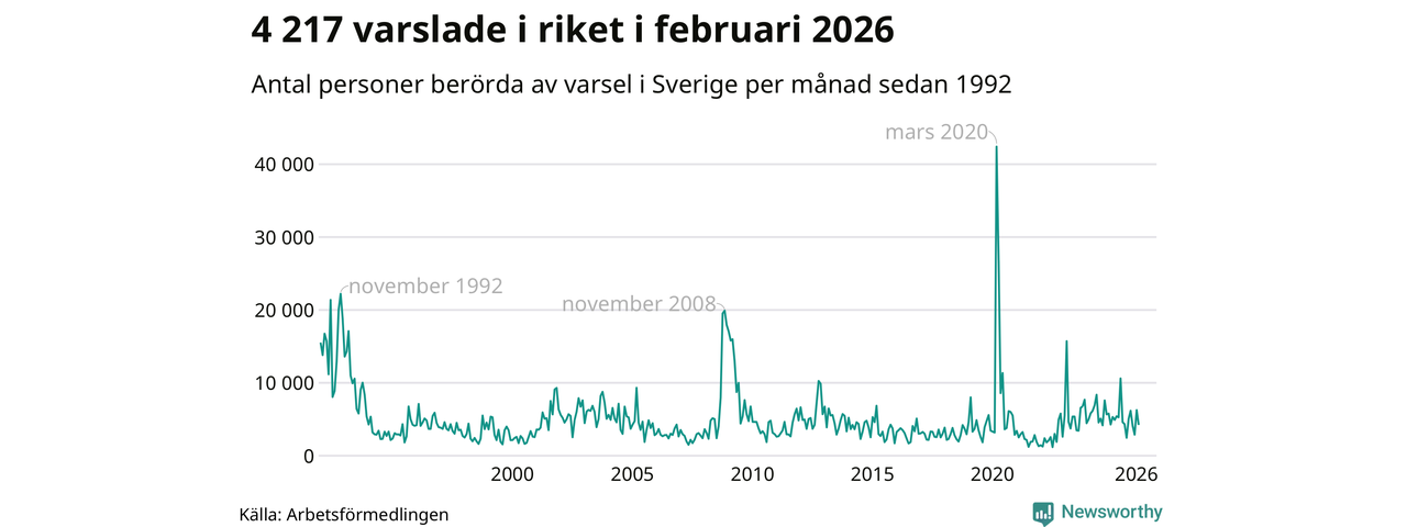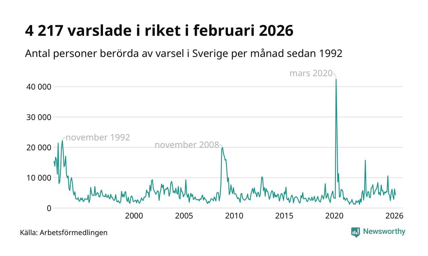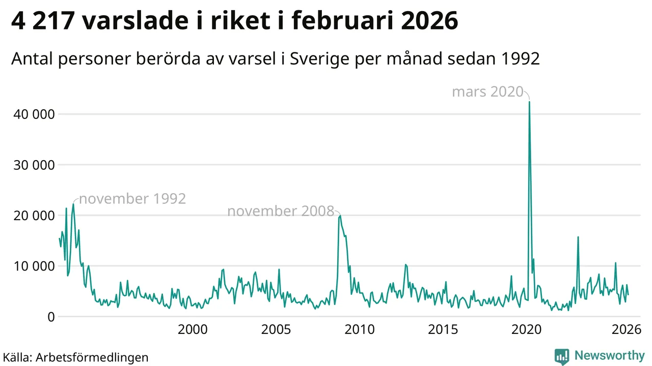 I hela riket varslades 4 217 personer under februari 2026, vilket är drygt 2 000 färre än i januari och omkring 700 färre än i februari 2025. Under de tre senaste månaderna har totalt omkring 13 400 varslats om uppsägning i Sverige. Det är drygt 1 100 färre än motsvarande period i fjol.