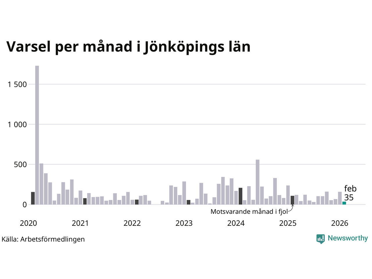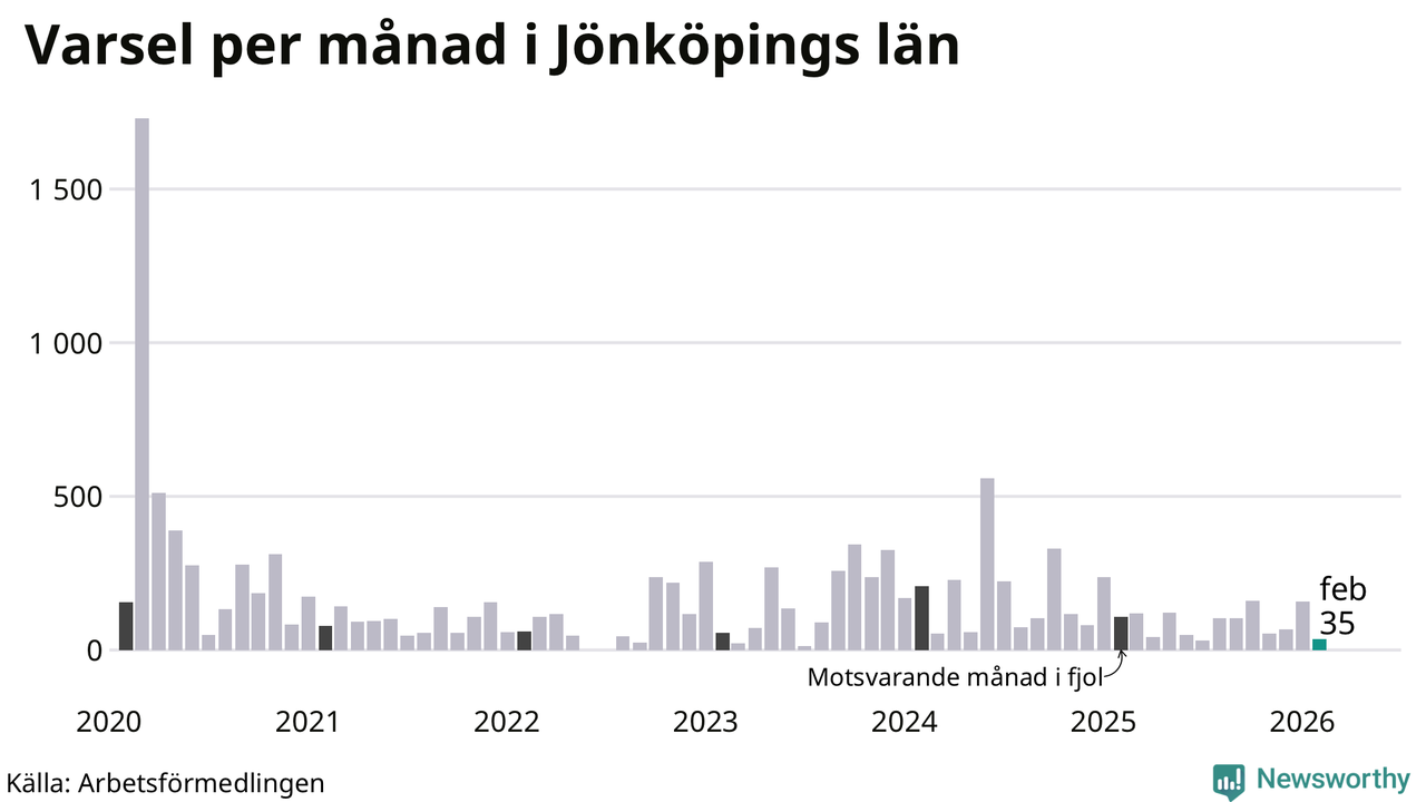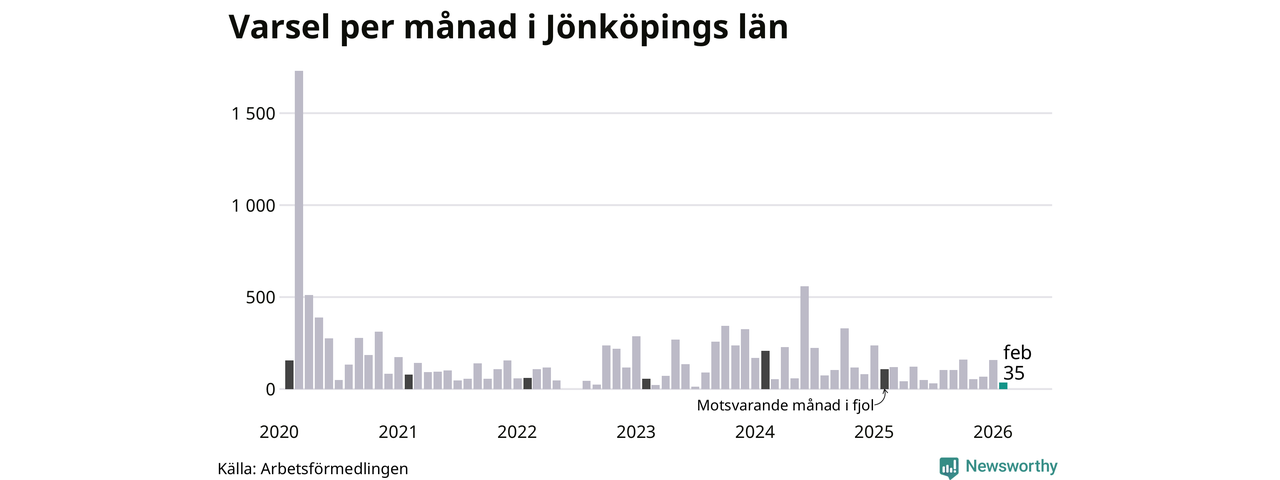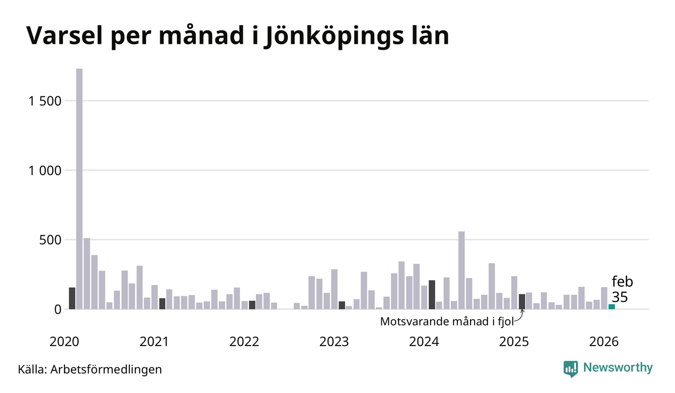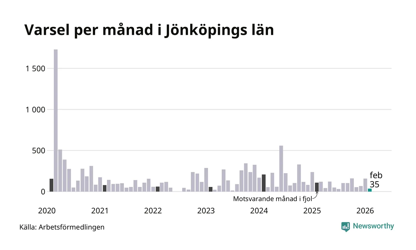 35 personer varslades om uppsägning i Jönköpings län under februari 2026. Det är 122 färre än i januari. För ett år sedan var antalet varsel 107 i länet. Sett över de tre senaste månaderna har totalt 260 varsel rapporterats i Jönköpings län, vilket är 166 färre än motsvarande period 2025. I början av pandemin, i mars 2020, varslades som mest 1 729 personer under en månad i Jönköpings län.