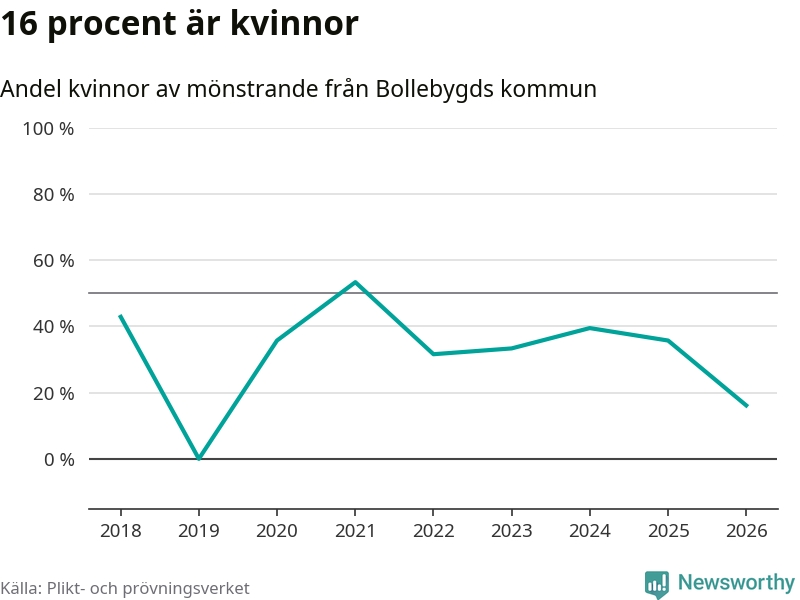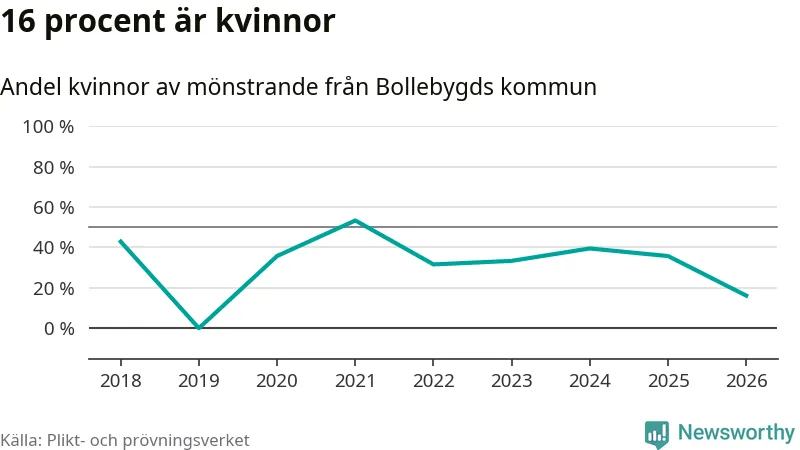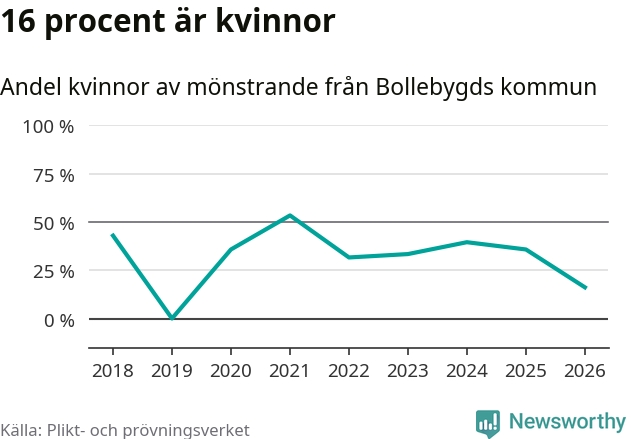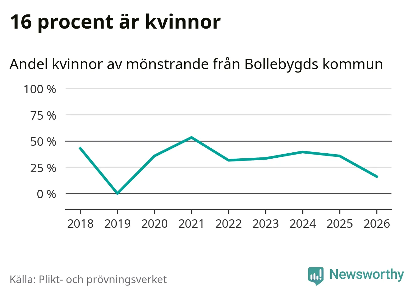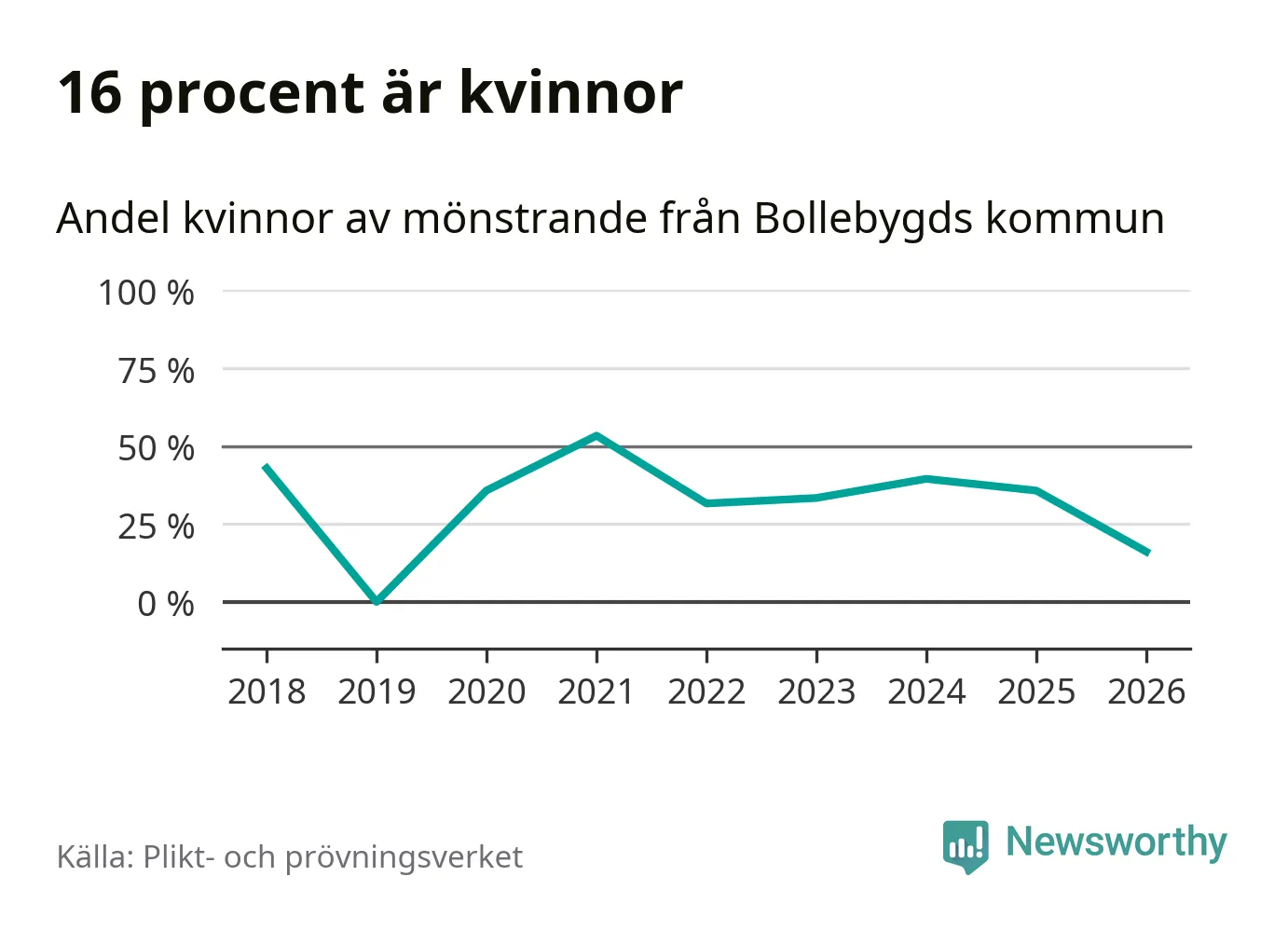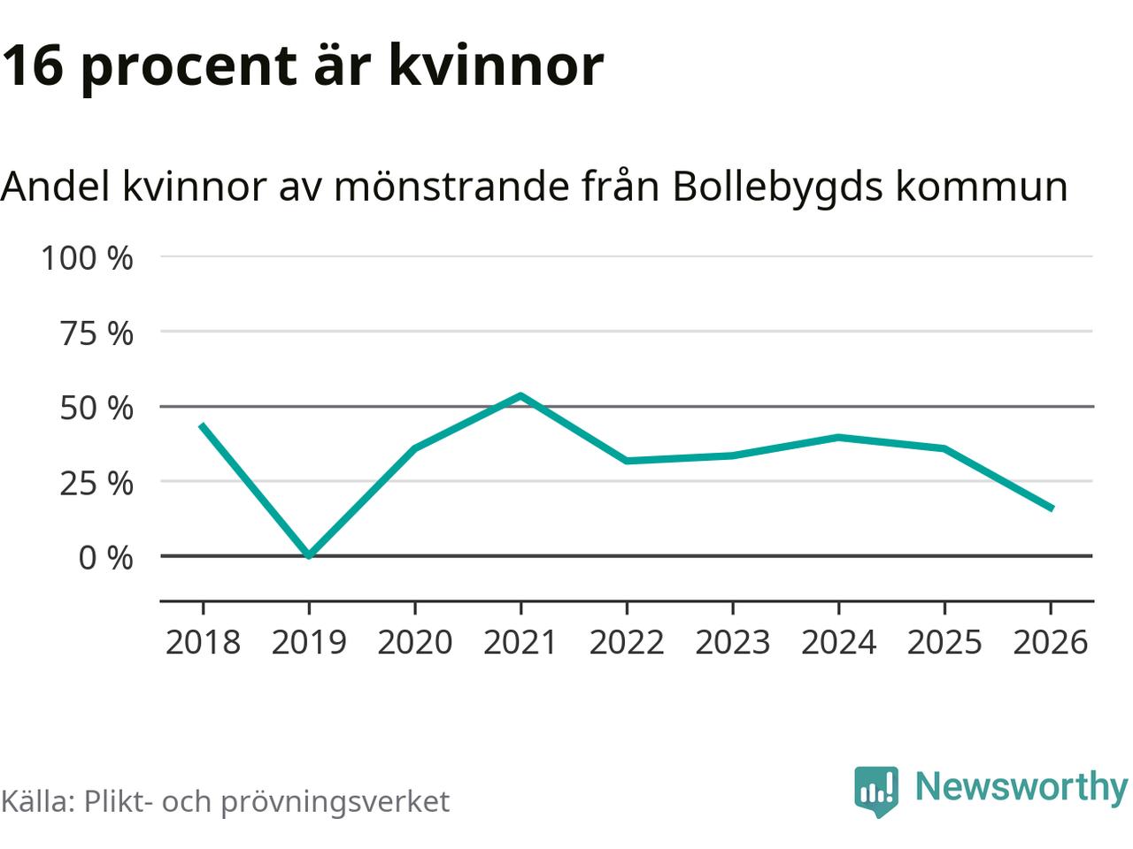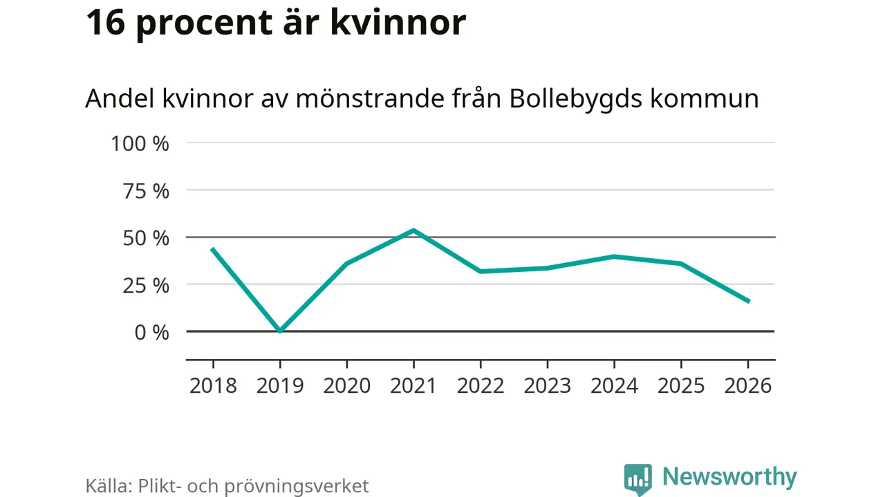 Fem av de som kallats till mönstring från Bollebygd är kvinnor, vilket motsvarar 16 procent av de mönstrande. Som mest har 15 kvinnor kallats från kommunen (2024). I riket som helhet är 28 procent av de mönstrande tjejer.