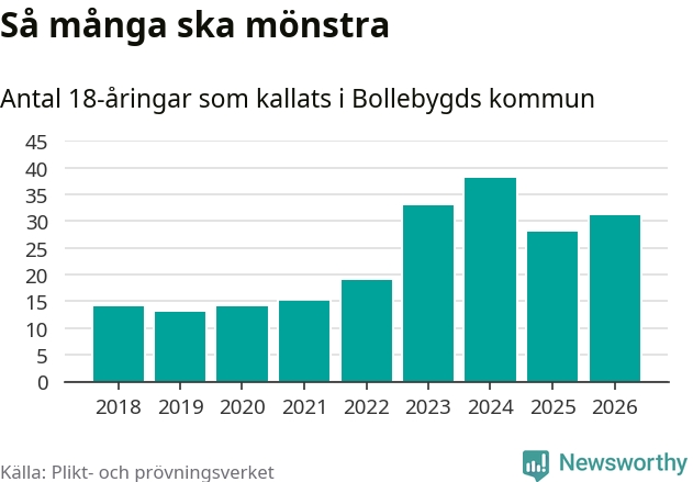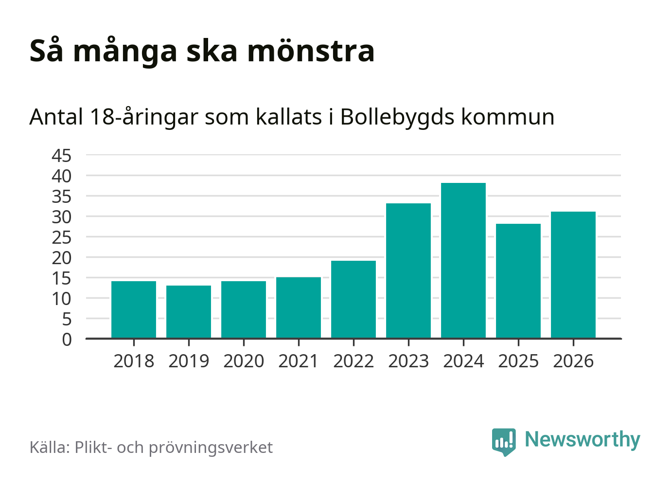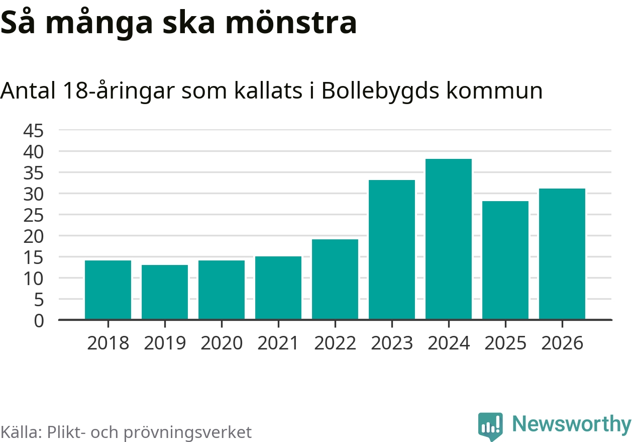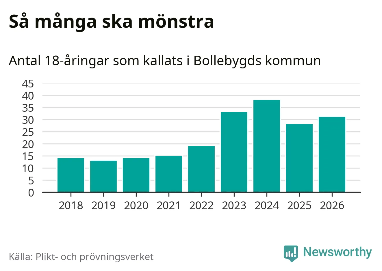 Nu kallas omkring 30 000 svenskar födda 2008 till mönstring. Och 31 av dem kommer från Bollebygd, enligt ny statistik från Plikt- och prövningsverket. Det innebär att var fjärde invånare i åldersgruppen i kommunen kallas till mönstring. Det är en högre andel än i Västra Götaland totalt. I riket som helhet kallas nästan var fjärde person i årskullen.