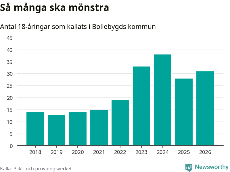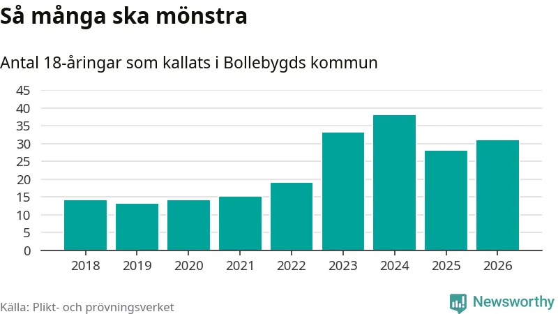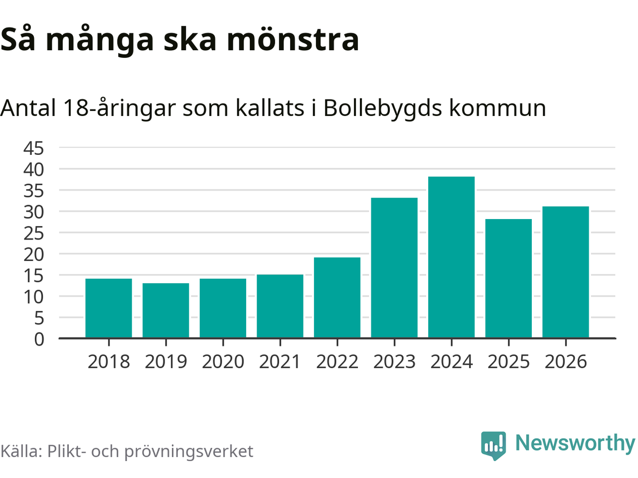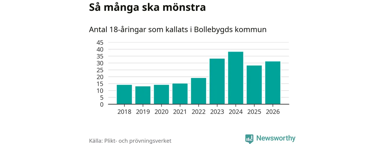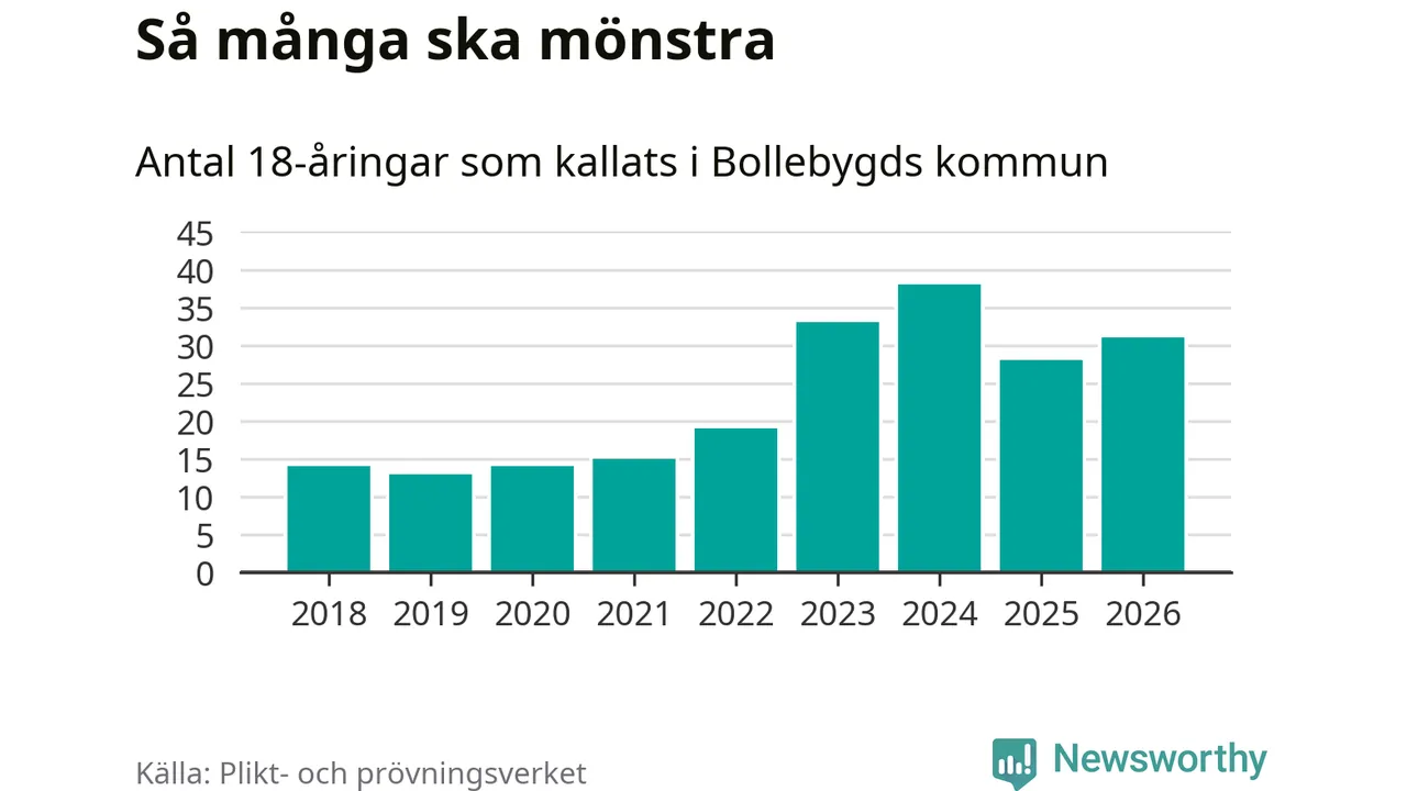 Nu kallas omkring 30 000 svenskar födda 2008 till mönstring. Och 31 av dem kommer från Bollebygd, enligt ny statistik från Plikt- och prövningsverket. Det innebär att var fjärde invånare i åldersgruppen i kommunen kallas till mönstring. Det är en högre andel än i Västra Götaland totalt. I riket som helhet kallas nästan var fjärde person i årskullen.