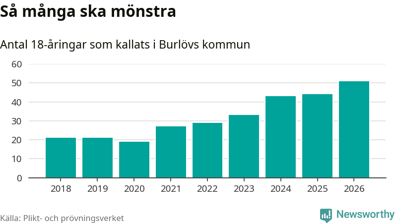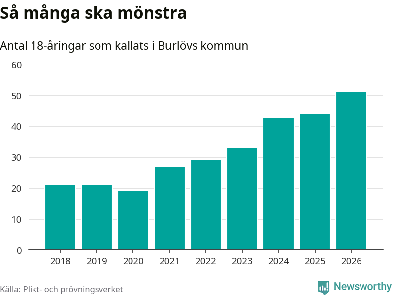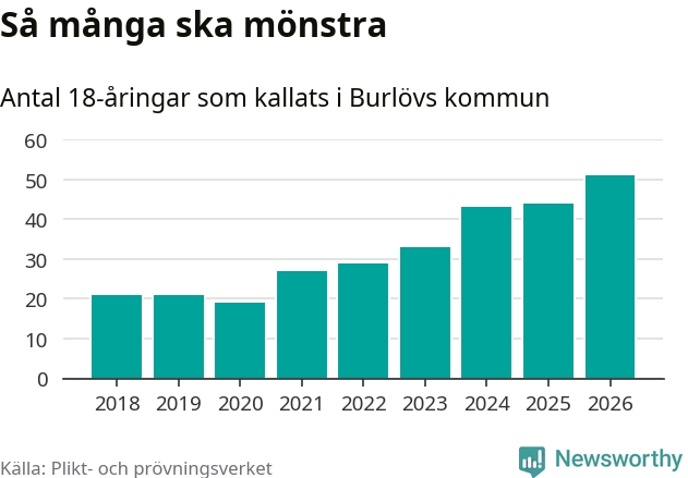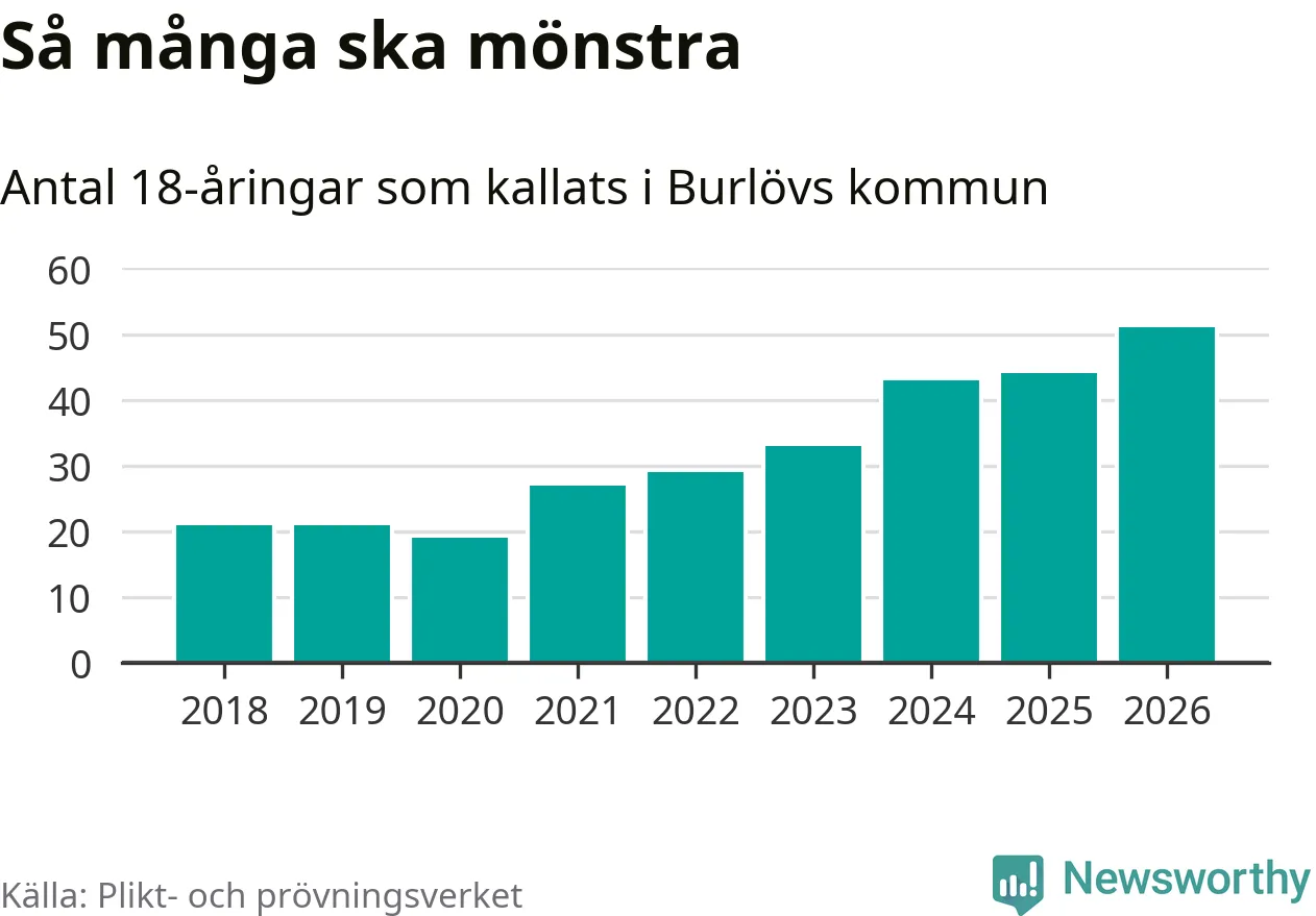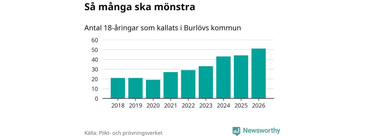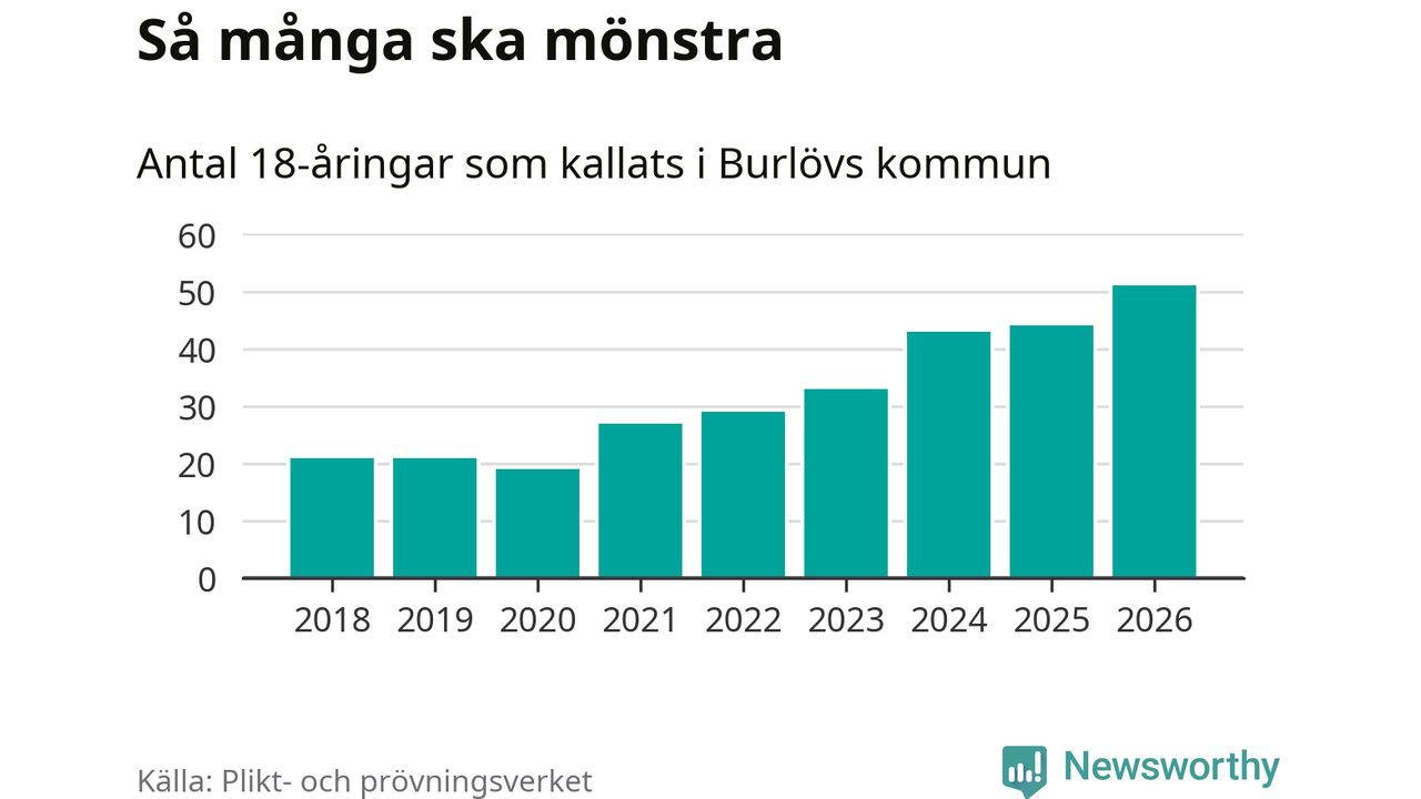 51 personer är det högsta antalet kallade i Burlöv sedan 2018, som är första året med statistik på kommunnivå (värnplikten återinfördes 2017), och sju mönstrande fler än 2025. Totalt från Skåne län kallas 3 778 personer i år.