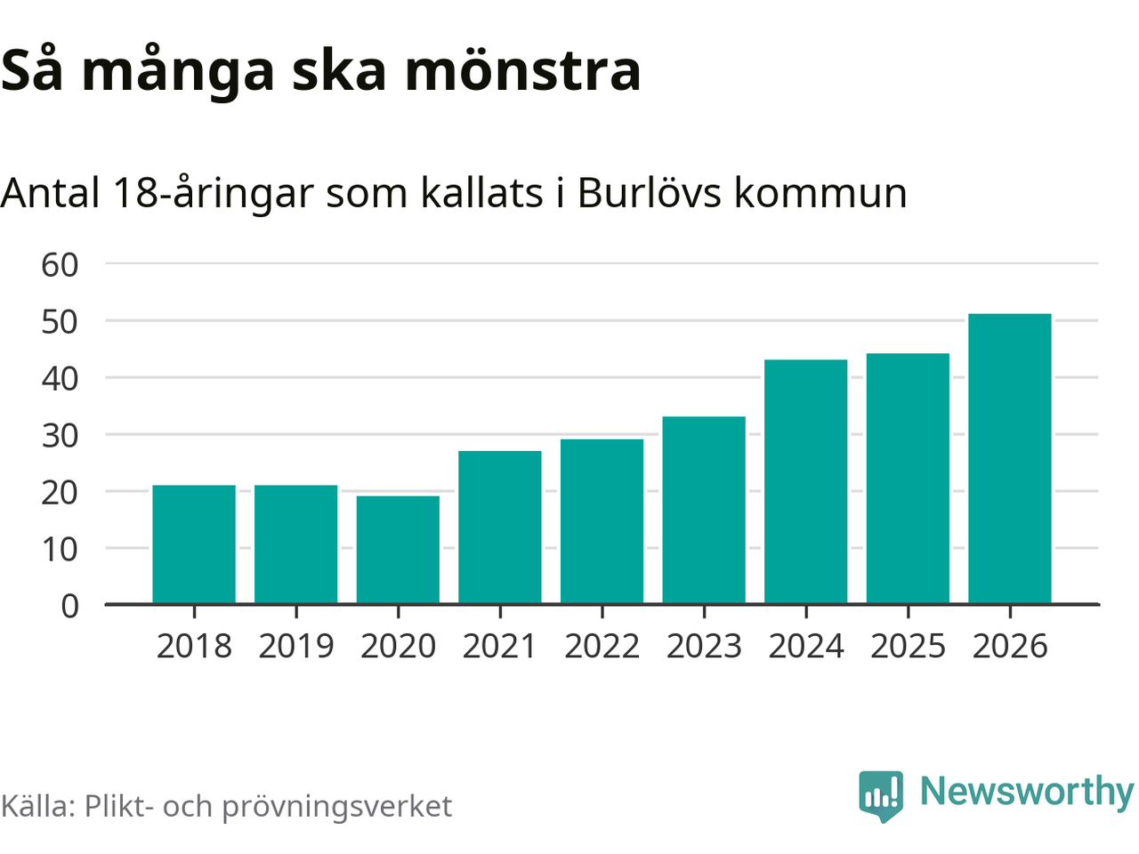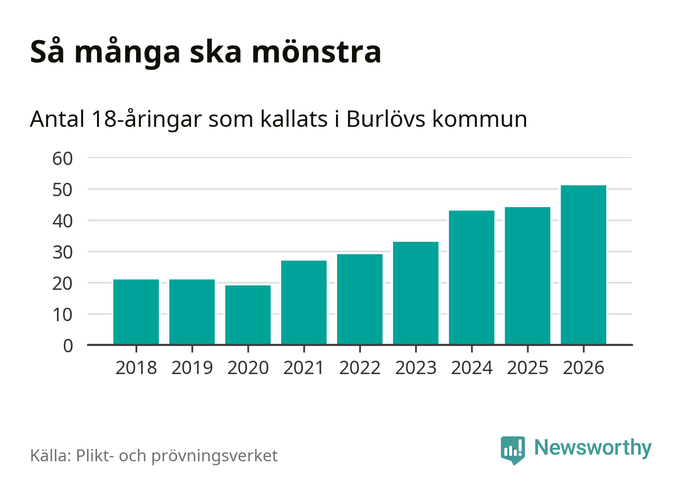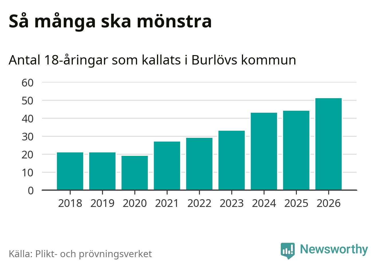 51 personer är det högsta antalet kallade i Burlöv sedan 2018, som är första året med statistik på kommunnivå (värnplikten återinfördes 2017), och sju mönstrande fler än 2025. Totalt från Skåne län kallas 3 778 personer i år.