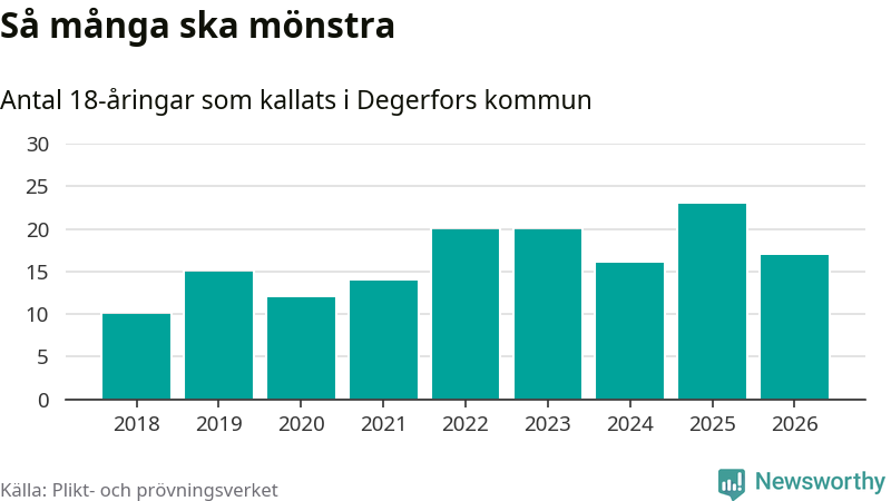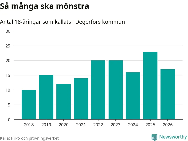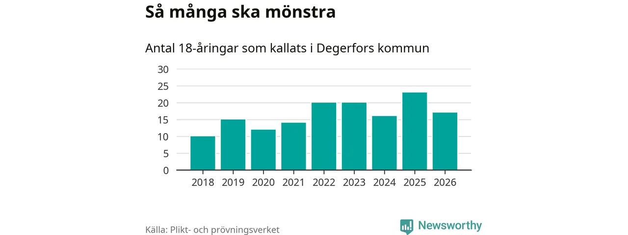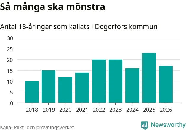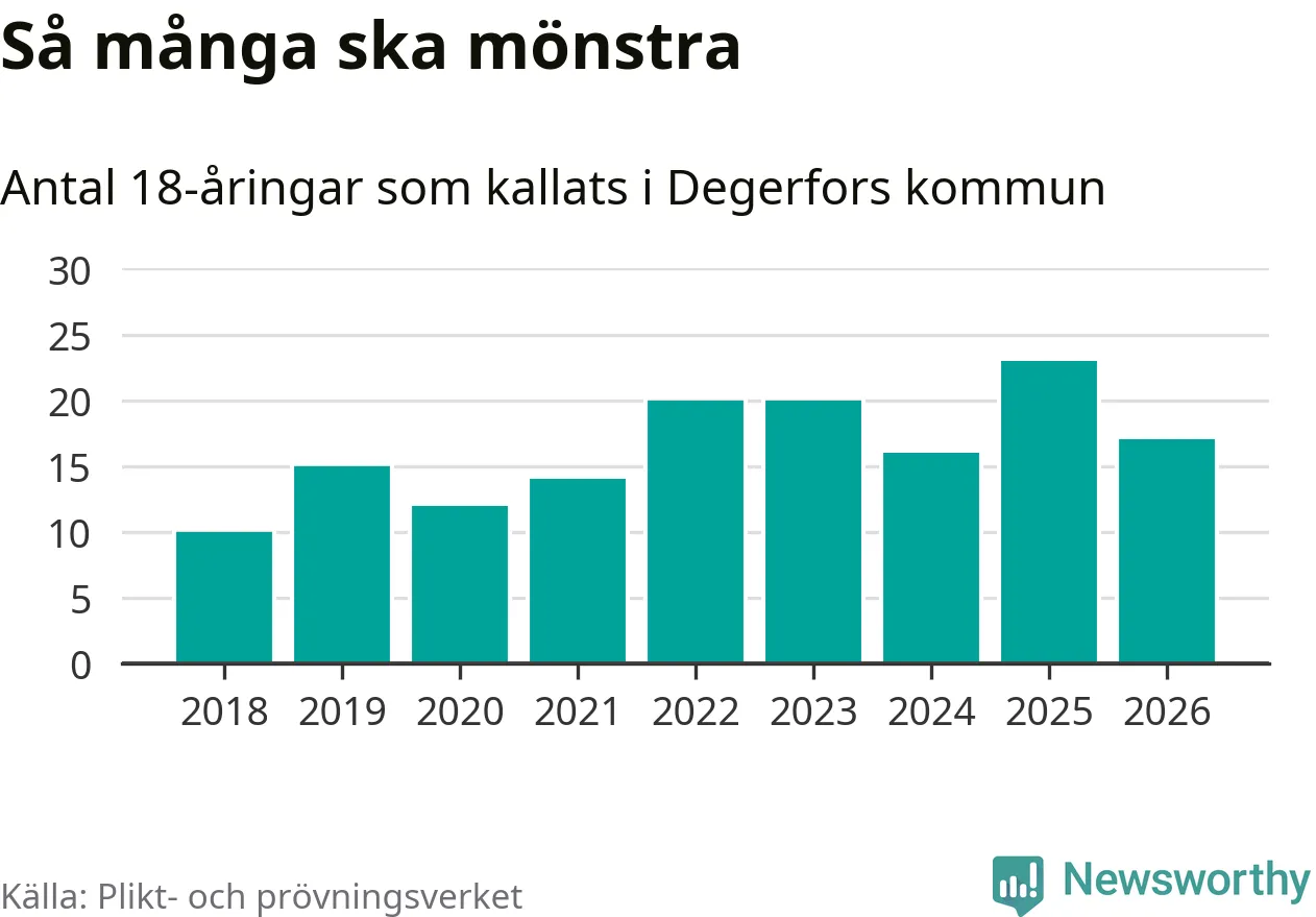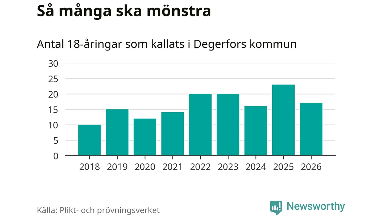 Nu kallas omkring 30 000 svenskar födda 2008 till mönstring. Och 17 av dem kommer från Degerfors, enligt ny statistik från Plikt- och prövningsverket. Det innebär att var sjunde invånare i åldersgruppen i kommunen kallas till mönstring. Det är en lägre andel än i Örebro län totalt. I riket som helhet kallas nästan var fjärde person i årskullen.