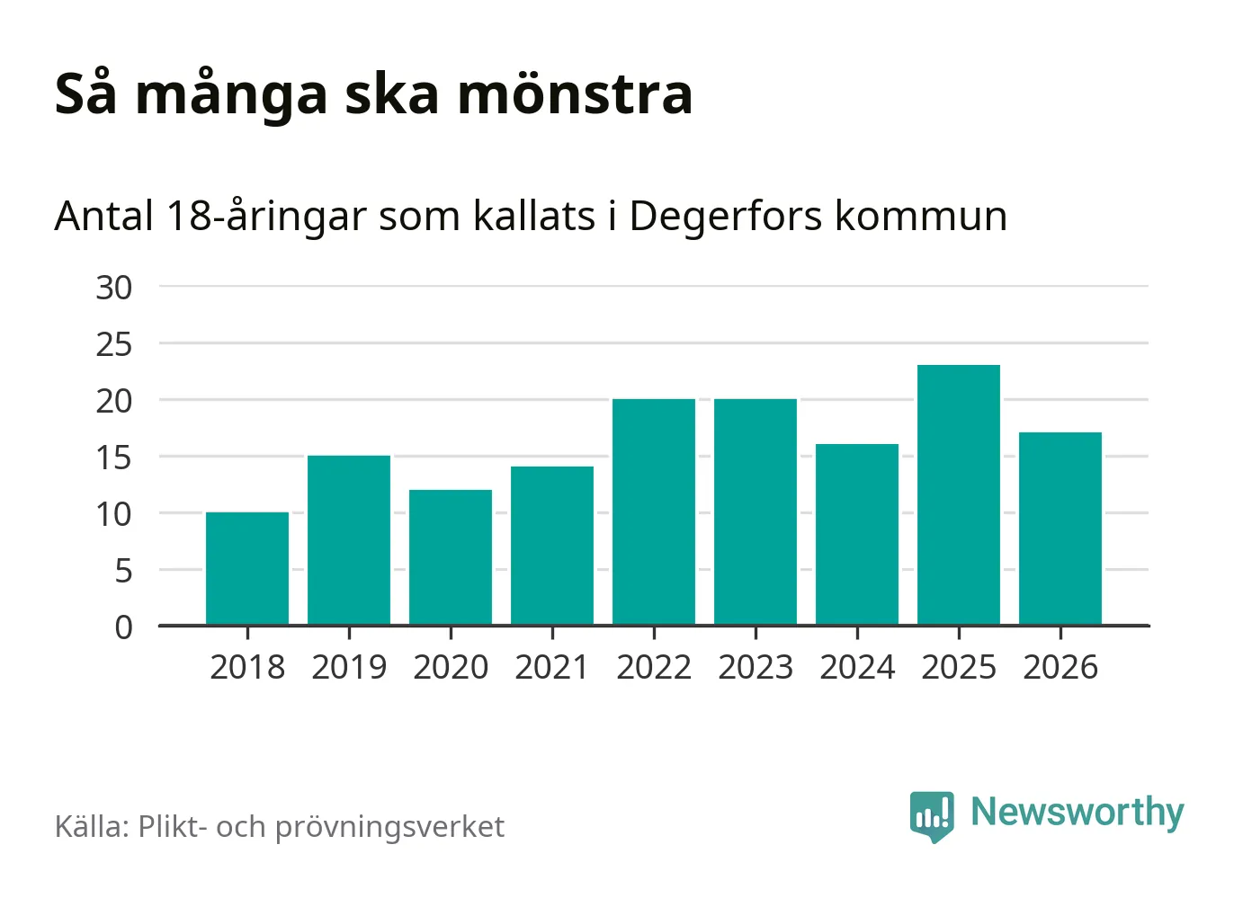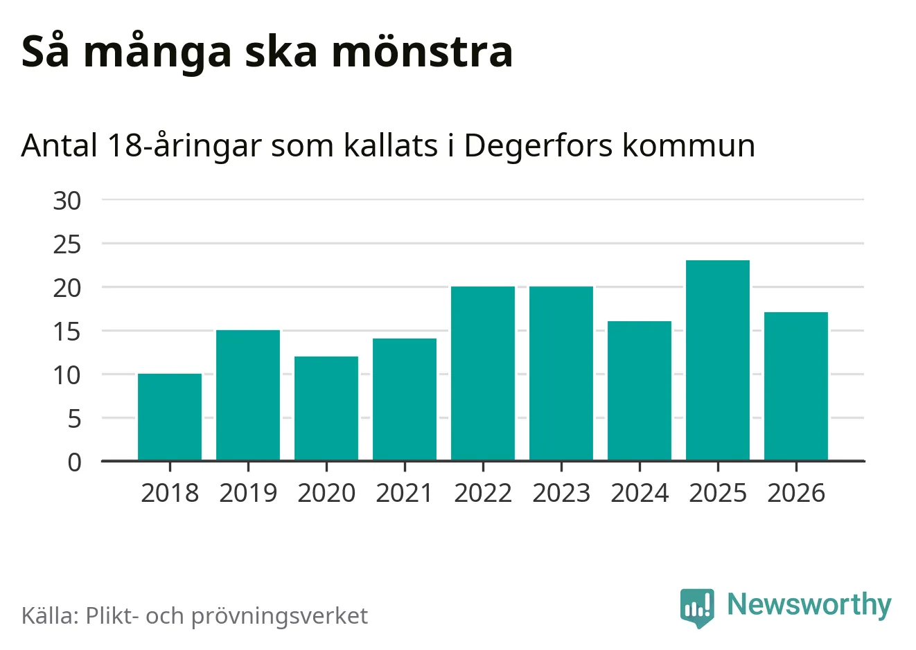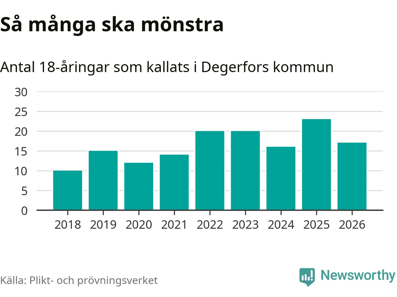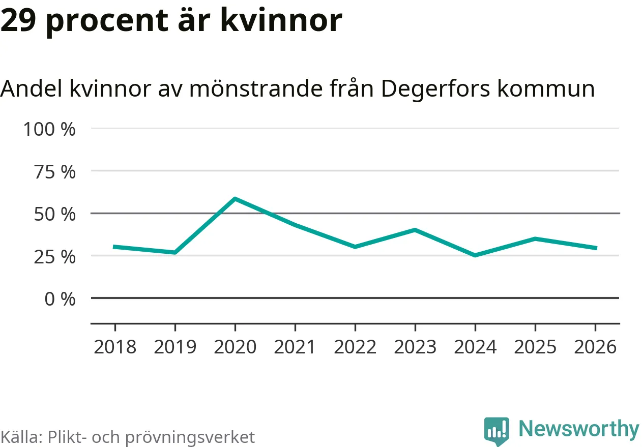 Nu kallas omkring 30 000 svenskar födda 2008 till mönstring. Och 17 av dem kommer från Degerfors, enligt ny statistik från Plikt- och prövningsverket. Det innebär att var sjunde invånare i åldersgruppen i kommunen kallas till mönstring. Det är en lägre andel än i Örebro län totalt. I riket som helhet kallas nästan var fjärde person i årskullen.