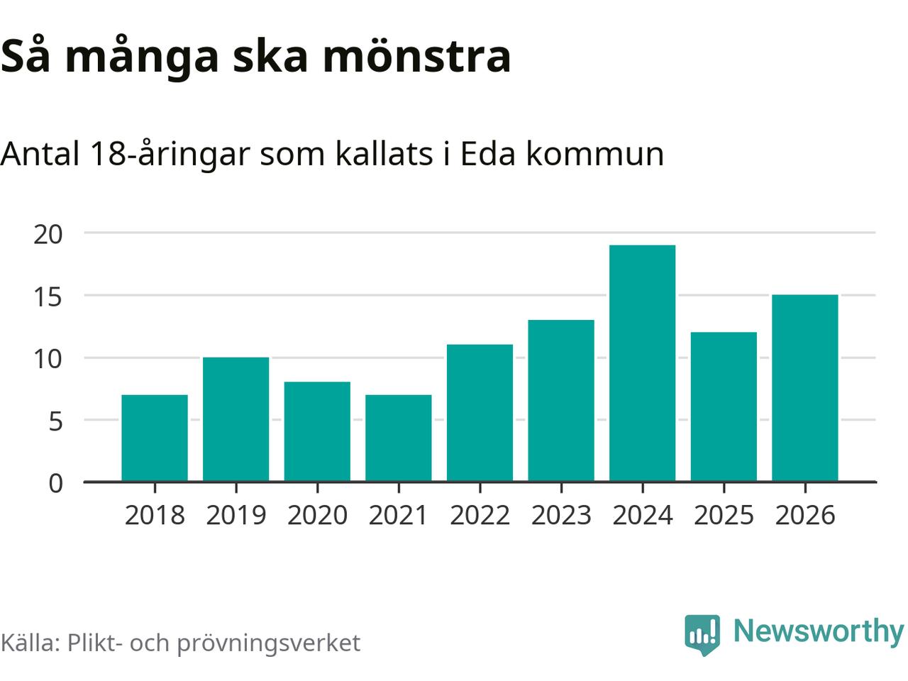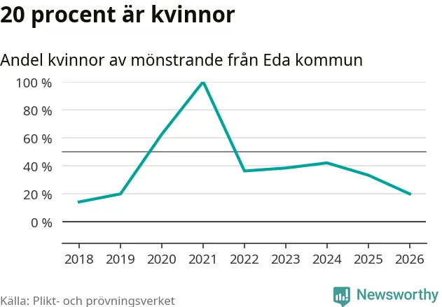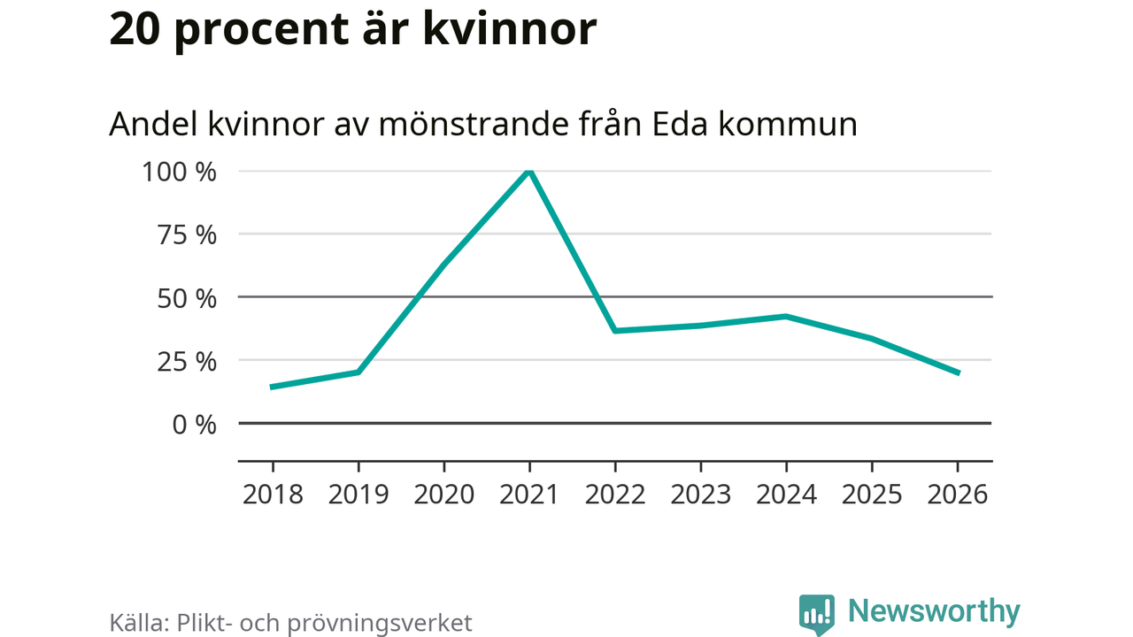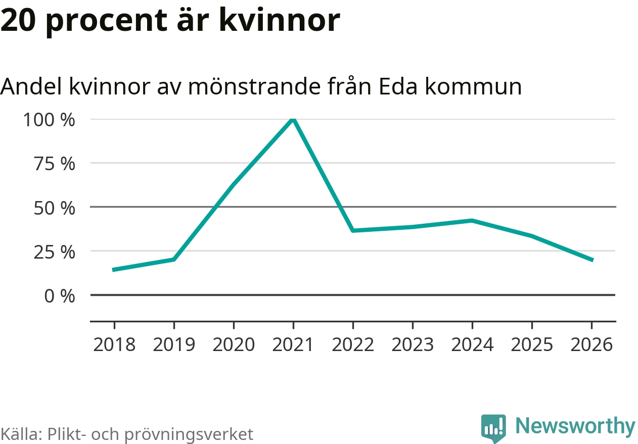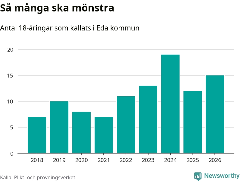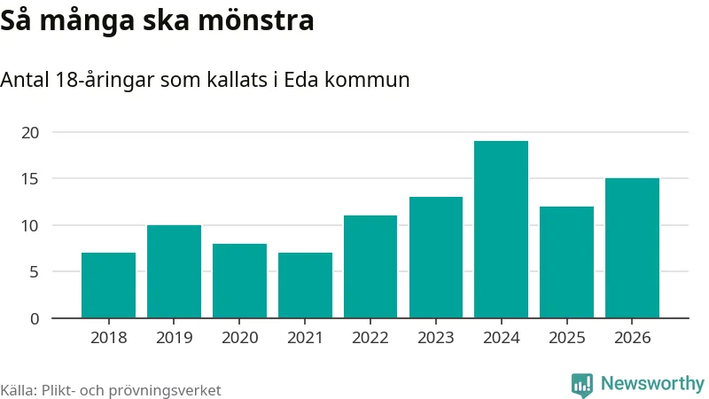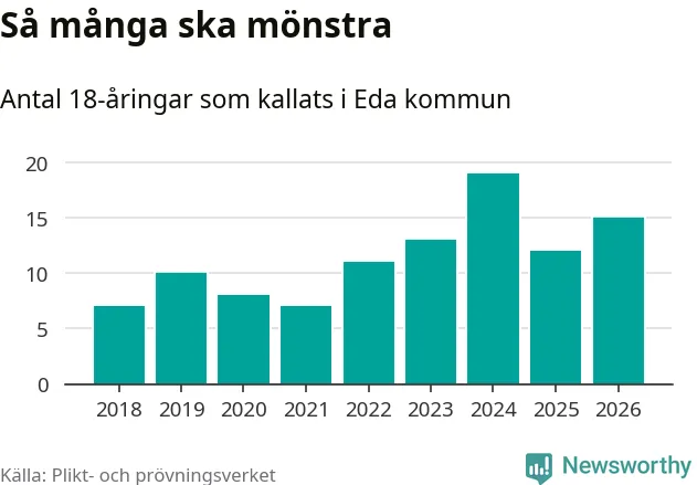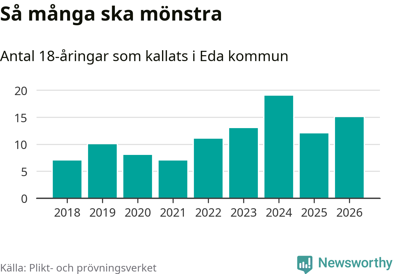 Nu kallas omkring 30 000 svenskar födda 2008 till mönstring. Och 15 av dem kommer från Eda, enligt ny statistik från Plikt- och prövningsverket. Det innebär att var sjätte invånare i åldersgruppen i kommunen kallas till mönstring. Det är en lägre andel än i Värmland totalt. I riket som helhet kallas nästan var fjärde person i årskullen.