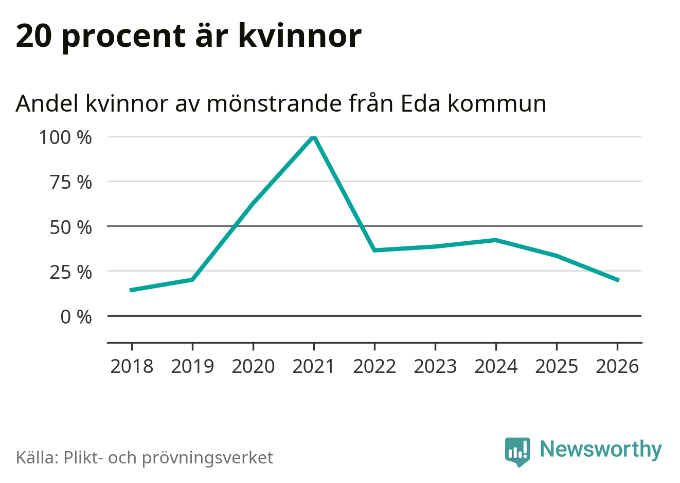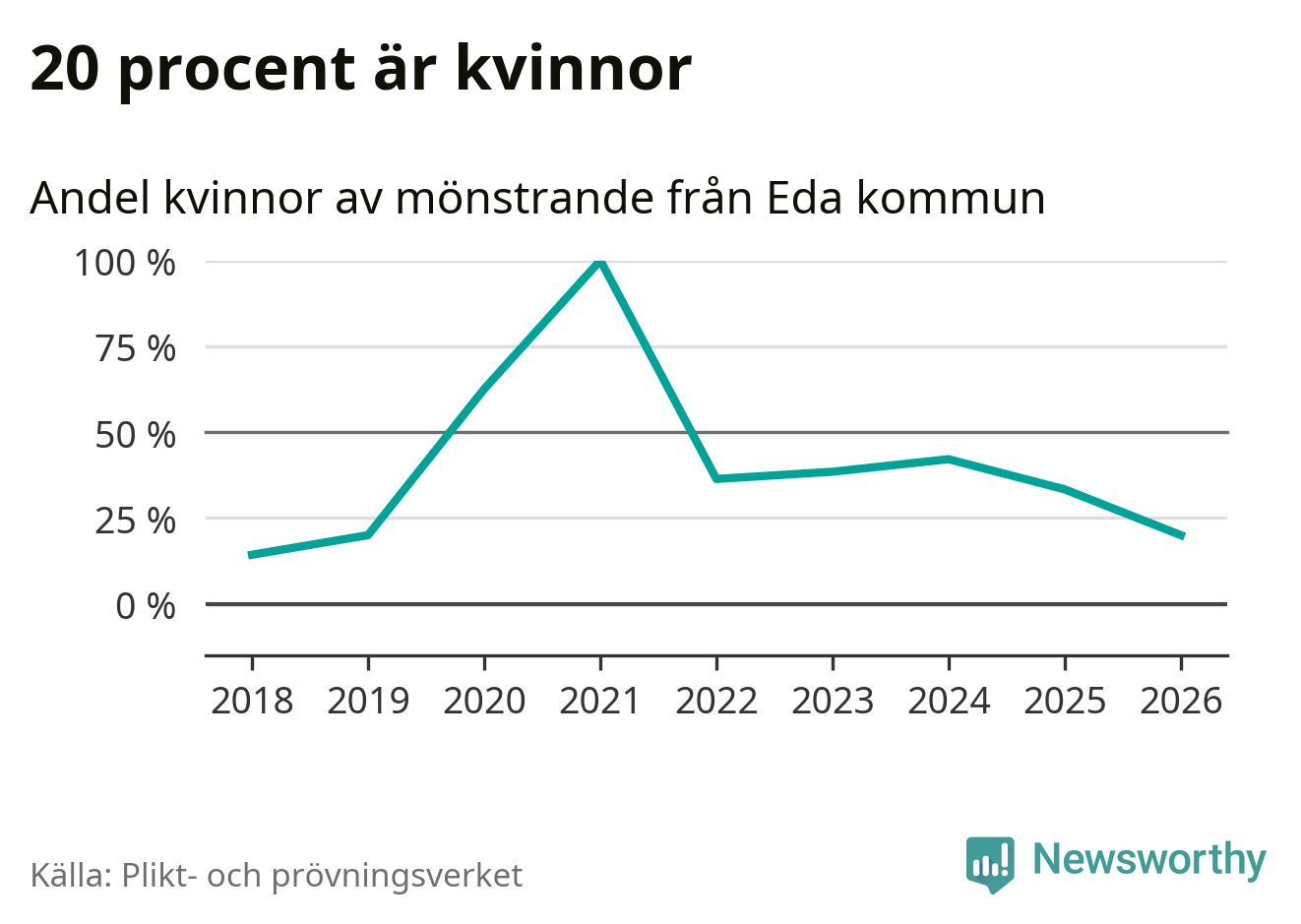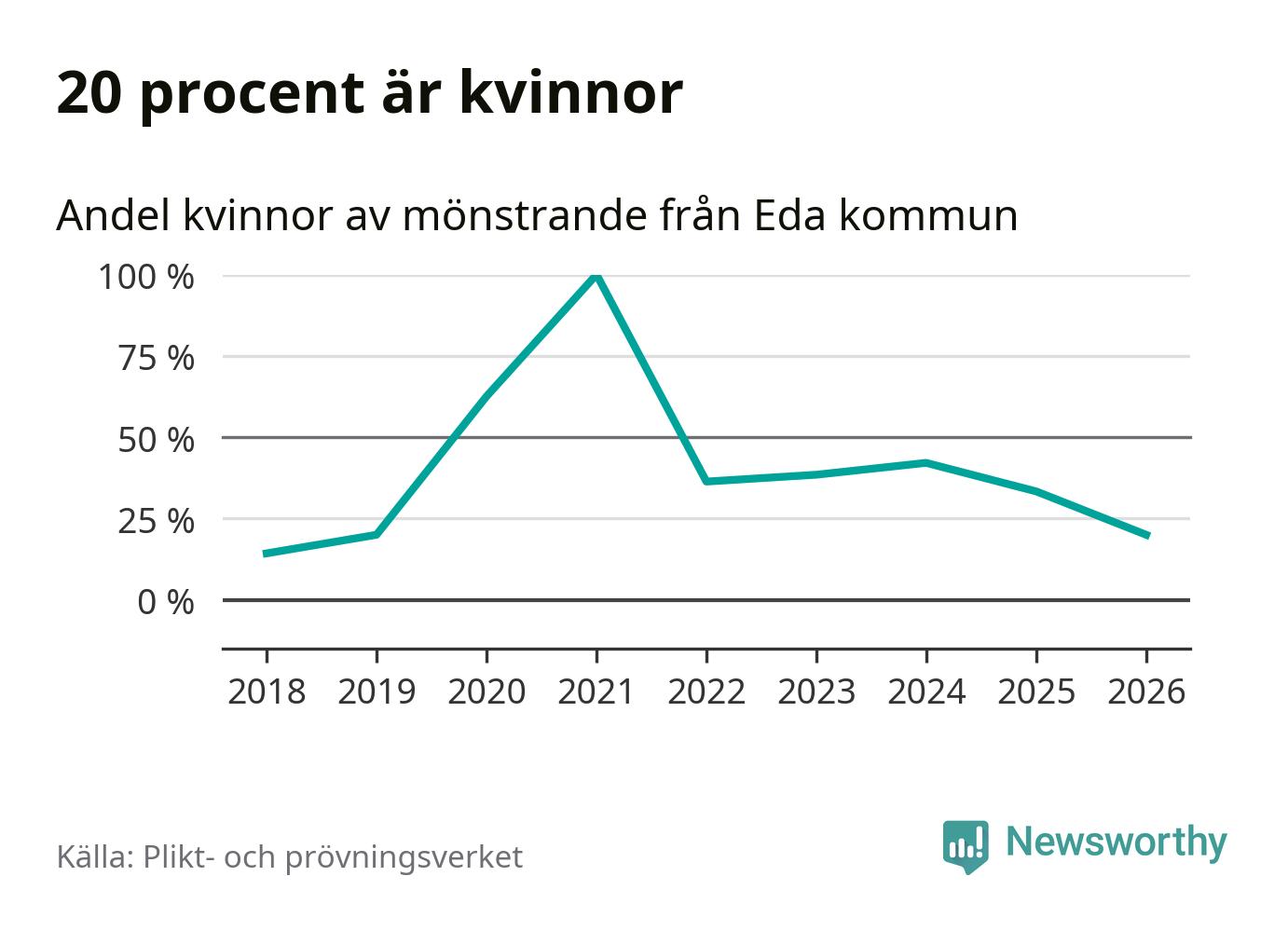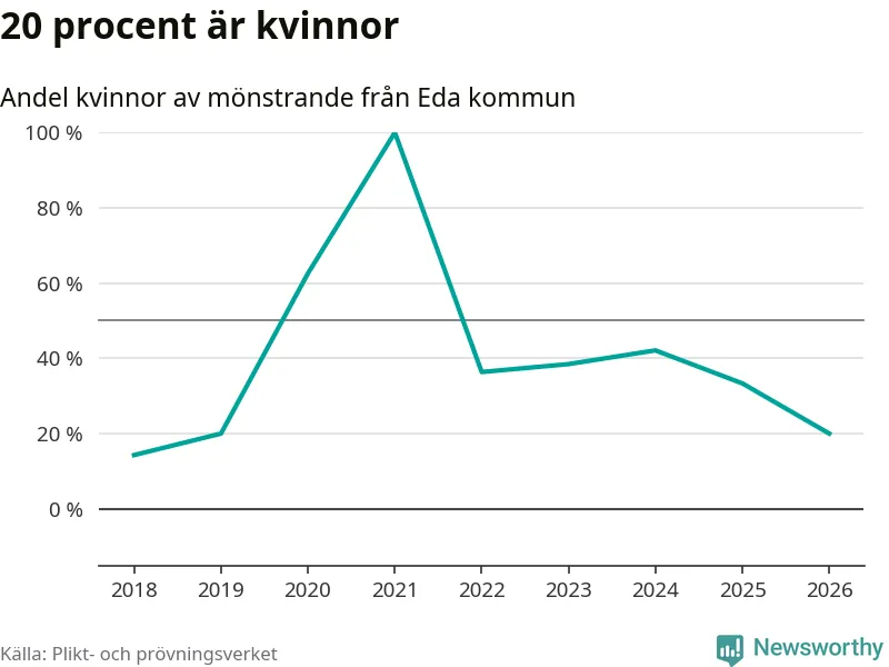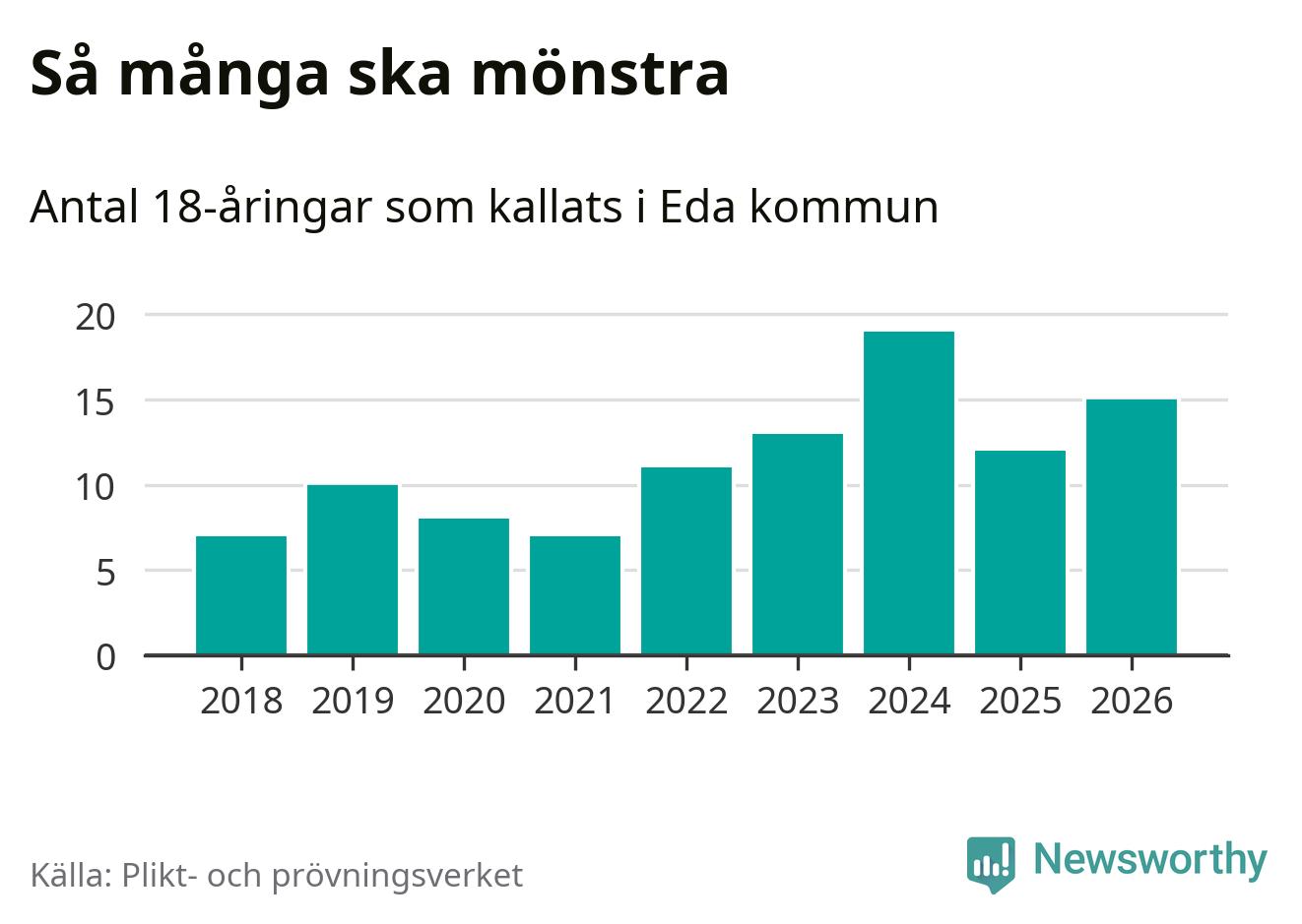 Nu kallas omkring 30 000 svenskar födda 2008 till mönstring. Och 15 av dem kommer från Eda, enligt ny statistik från Plikt- och prövningsverket. Det innebär att var sjätte invånare i åldersgruppen i kommunen kallas till mönstring. Det är en lägre andel än i Värmland totalt. I riket som helhet kallas nästan var fjärde person i årskullen.
