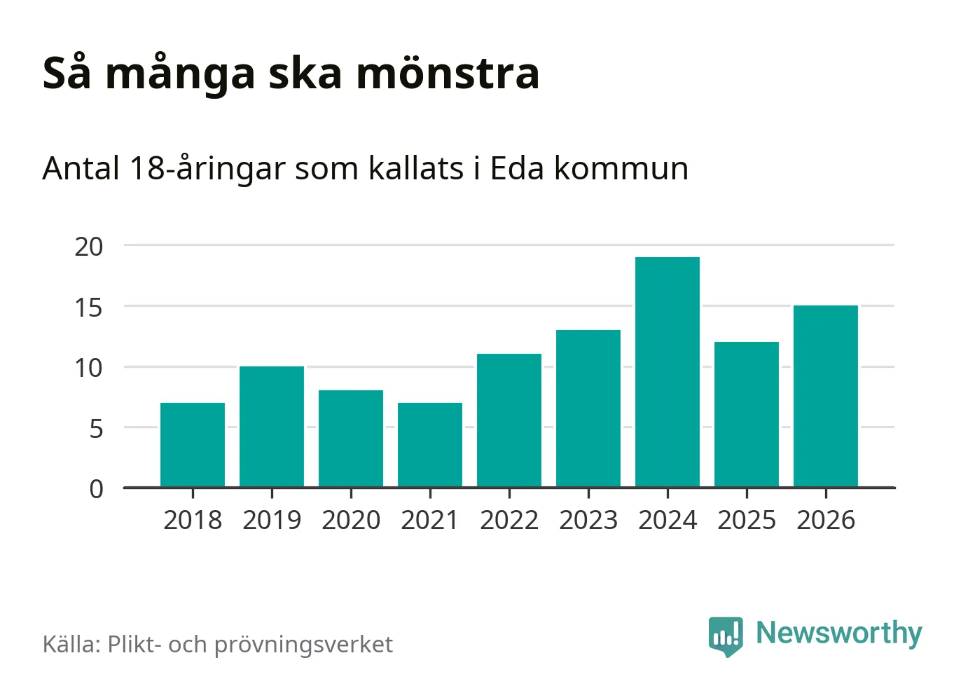15 personer är tre fler än 2025. Som mest har 19 personer från en årskull kommunen mönstrat (2024). Totalt från Värmlands län kallas 730 personer i år.