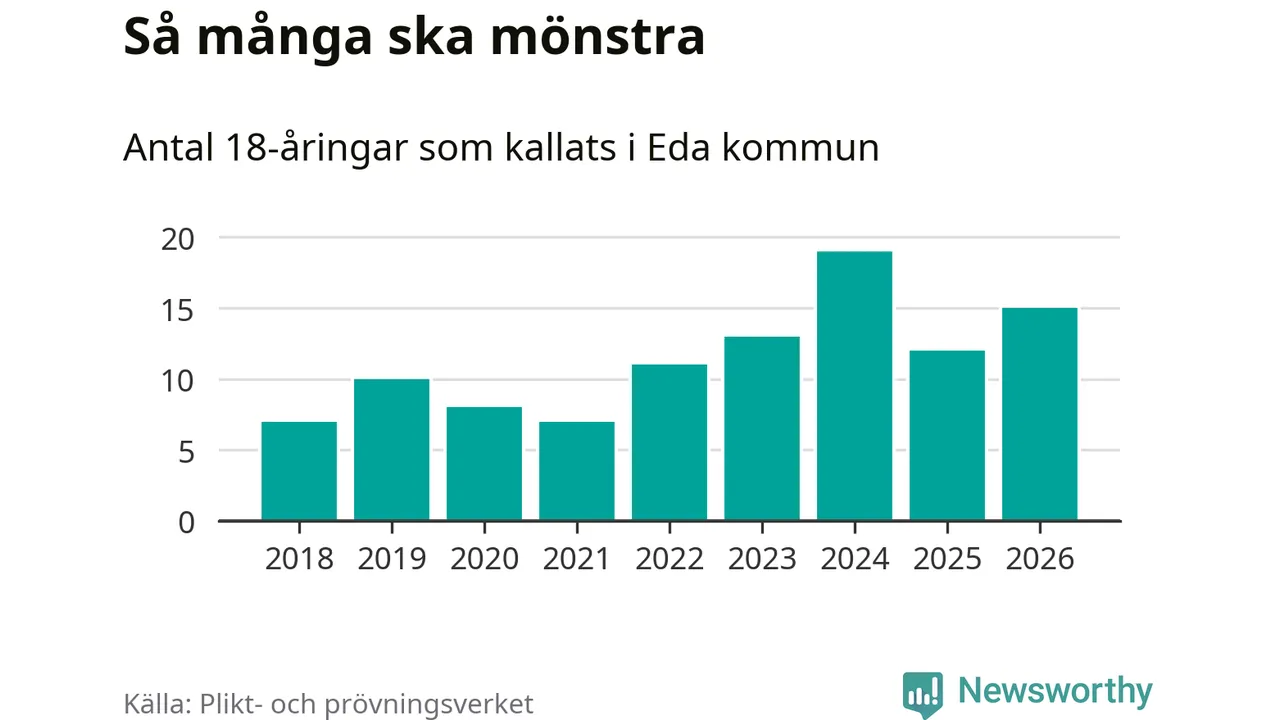Antalet 18-åringar som kallas till mönstring fortsätter att öka i Sverige i takt med att värnplikten byggs ut. Från Eda kallas tolv män och tre kvinnor.