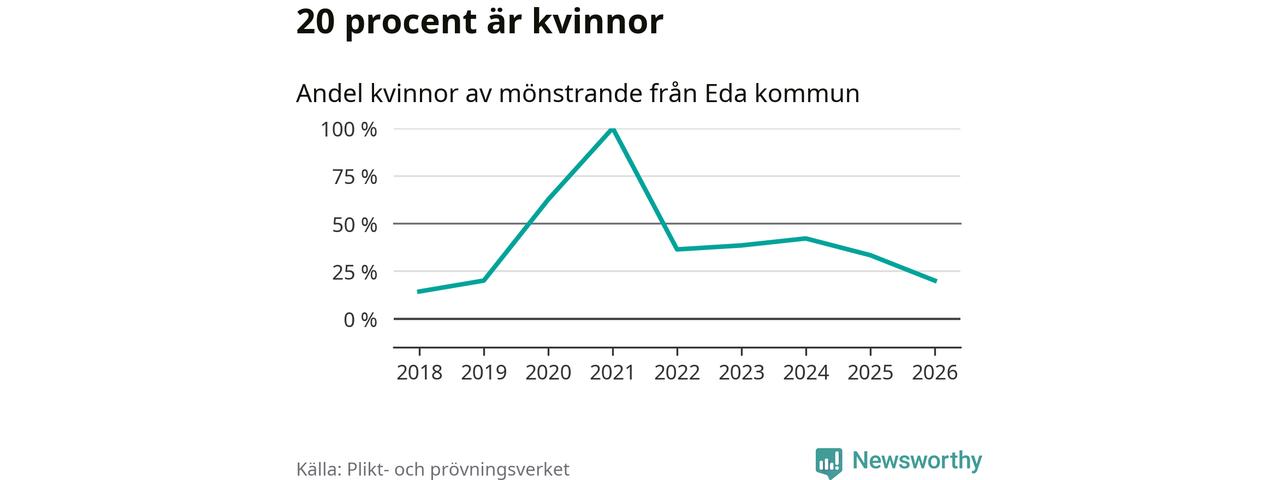 Tre av de som kallats till mönstring från Eda är kvinnor, vilket motsvarar 20 procent av de mönstrande. Som mest har åtta kvinnor kallats från kommunen (2024). I riket som helhet är 28 procent av de mönstrande tjejer.