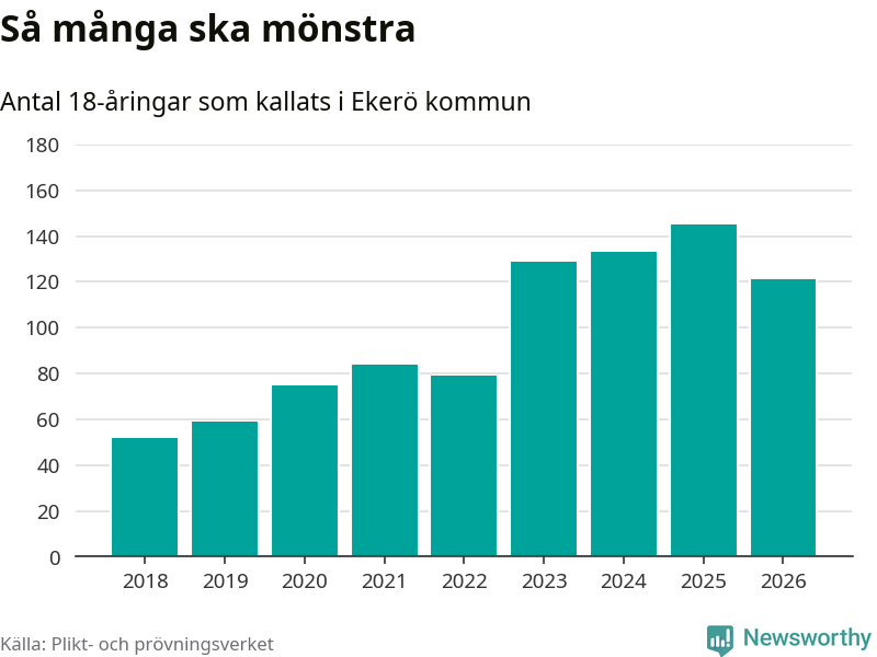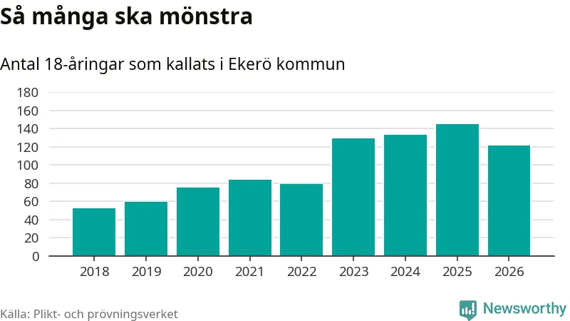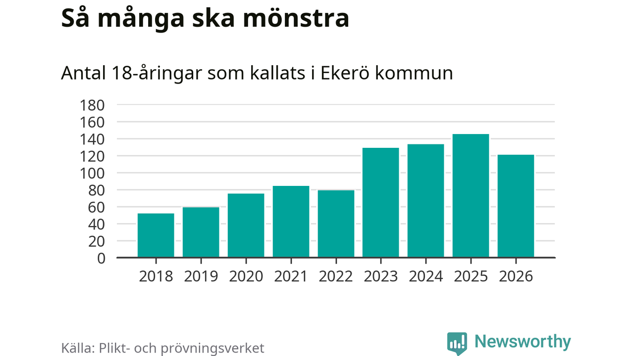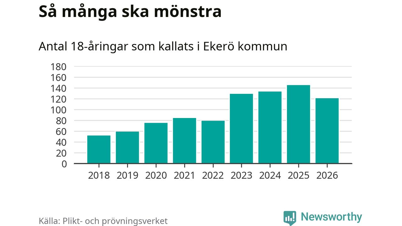 Nu kallas omkring 30 000 svenskar födda 2008 till mönstring. Och 121 av dem kommer från Ekerö, enligt ny statistik från Plikt- och prövningsverket. Det innebär att var fjärde invånare i åldersgruppen i kommunen kallas till mönstring. Det är en högre andel än i Stockholms län totalt. I riket som helhet kallas nästan var fjärde person i årskullen.