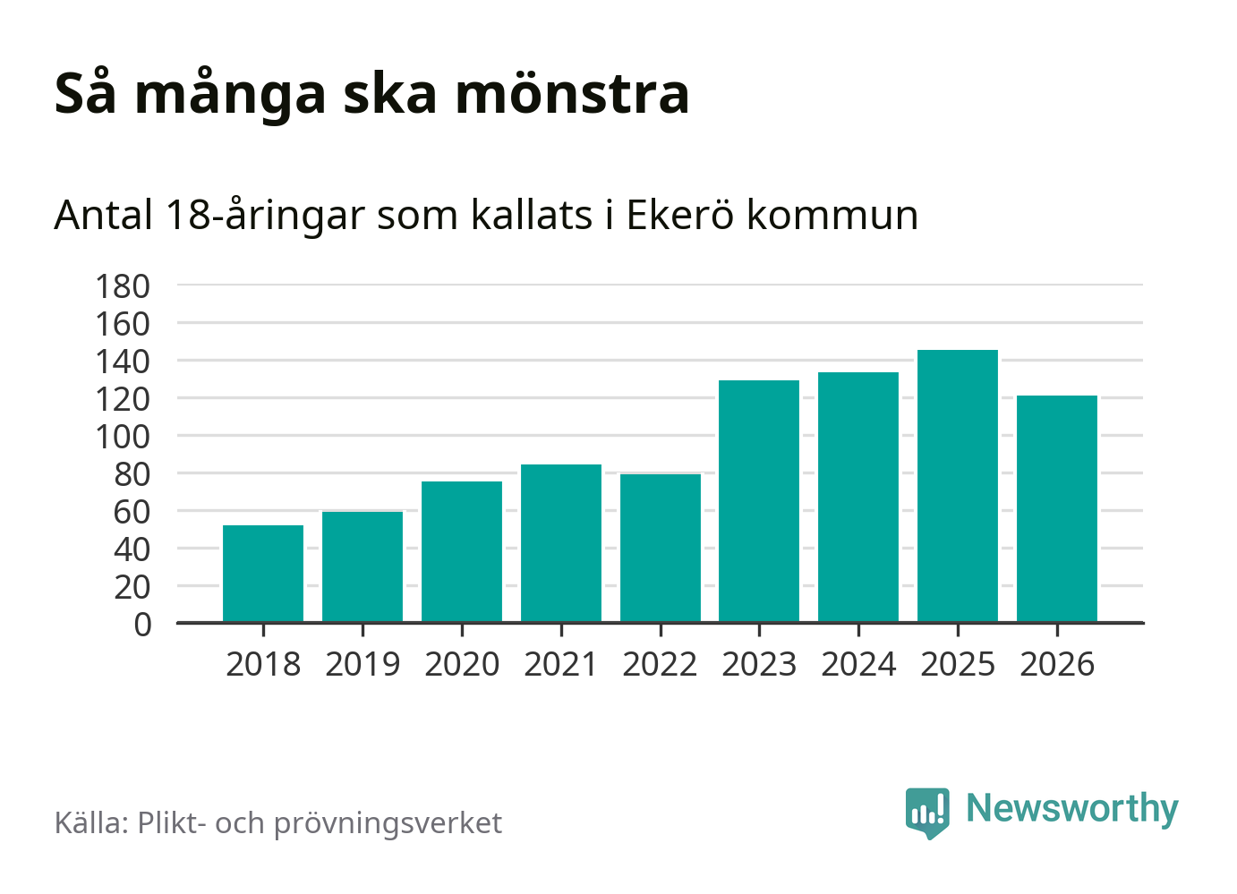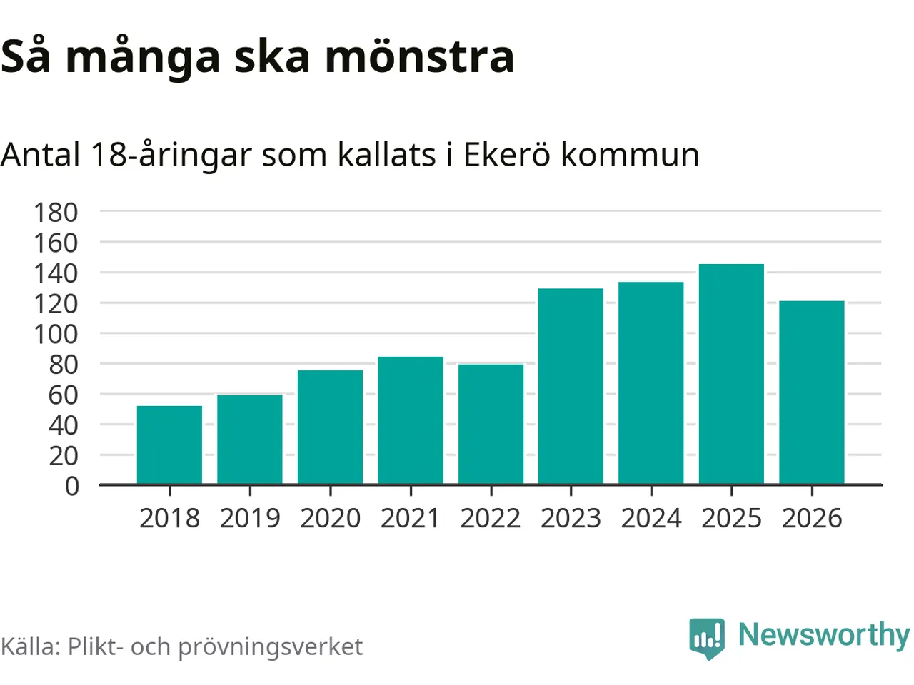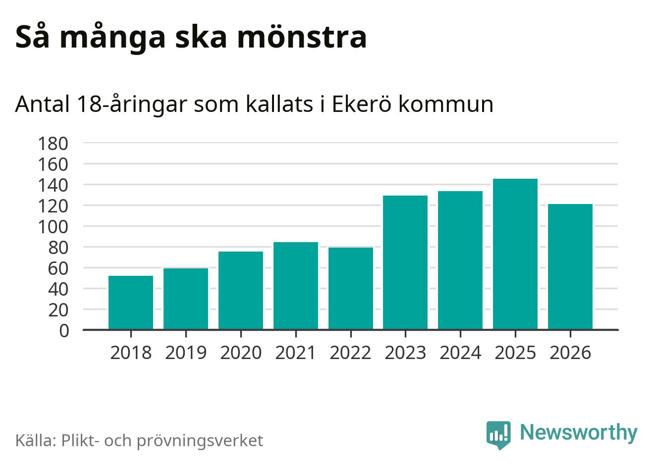 Nu kallas omkring 30 000 svenskar födda 2008 till mönstring. Och 121 av dem kommer från Ekerö, enligt ny statistik från Plikt- och prövningsverket. Det innebär att var fjärde invånare i åldersgruppen i kommunen kallas till mönstring. Det är en högre andel än i Stockholms län totalt. I riket som helhet kallas nästan var fjärde person i årskullen.