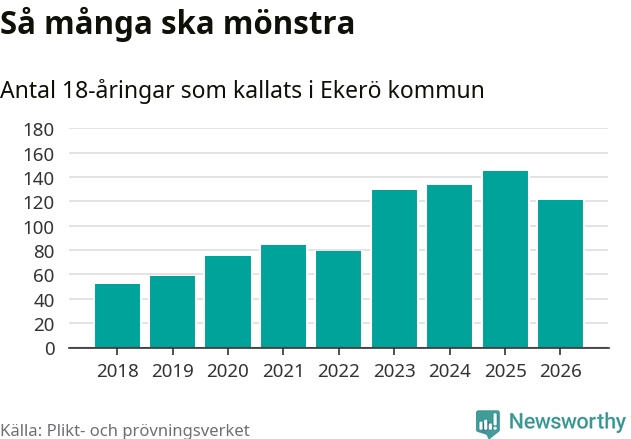 I takt med att värnplikten byggs ut ökar antalet 18-åringar som kallas till mönstring. Men från Ekerö kallas färre än i fjol, visar siffror från Plikt- och prövningsverket.