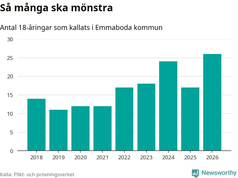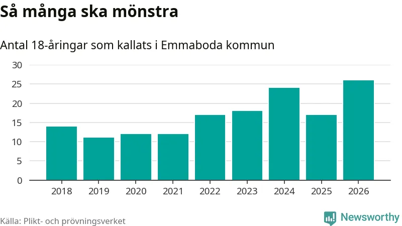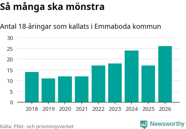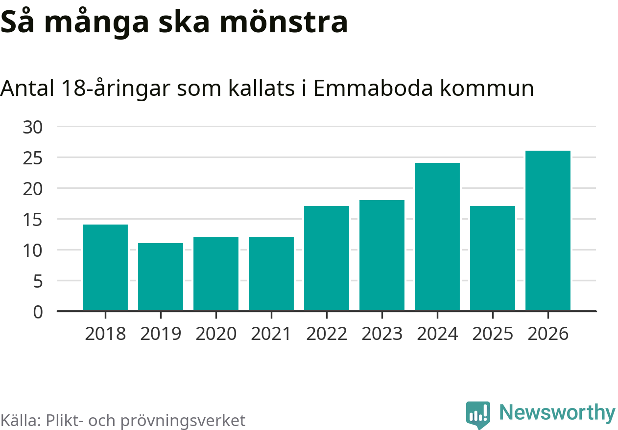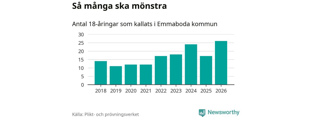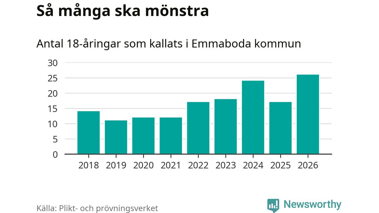 26 personer är det högsta antalet kallade i Emmaboda sedan 2018, som är första året med statistik på kommunnivå (värnplikten återinfördes 2017), och nio mönstrande fler än 2025. Totalt från Kalmar län kallas 650 personer i år.