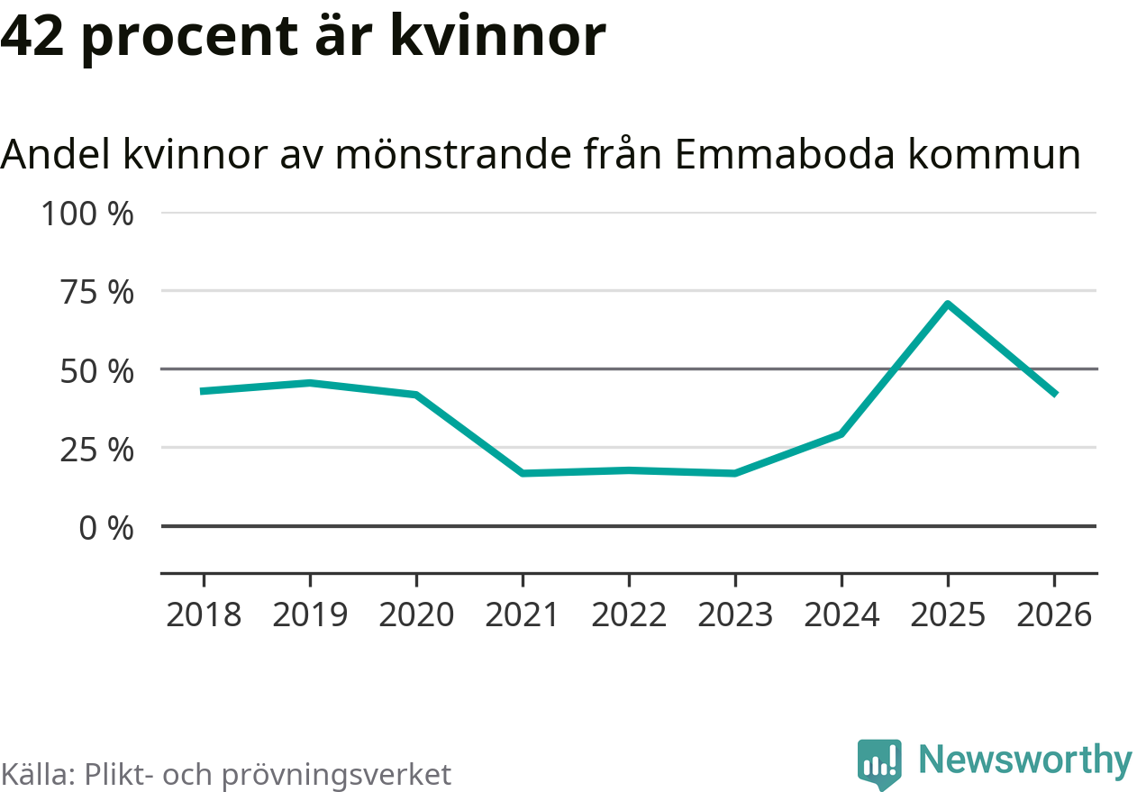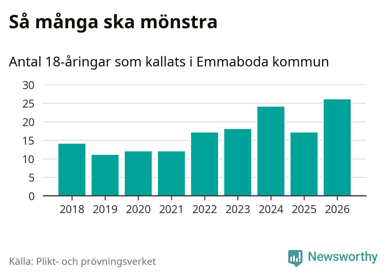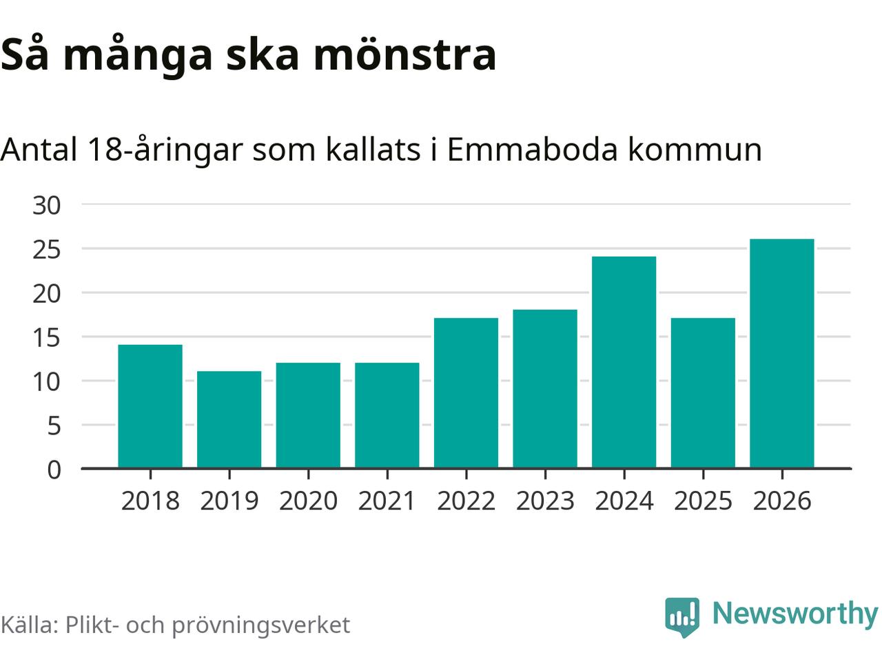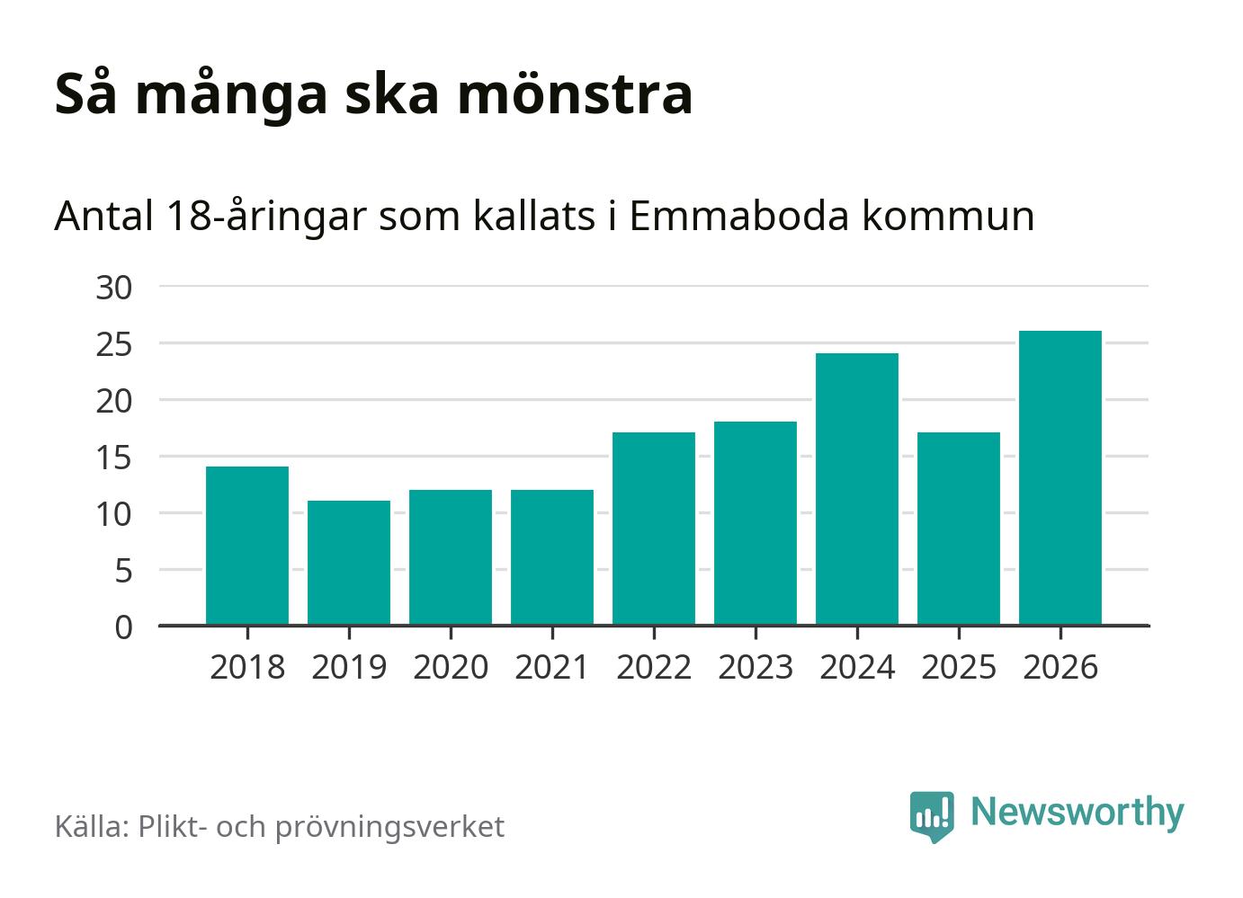 26 personer är det högsta antalet kallade i Emmaboda sedan 2018, som är första året med statistik på kommunnivå (värnplikten återinfördes 2017), och nio mönstrande fler än 2025. Totalt från Kalmar län kallas 650 personer i år.