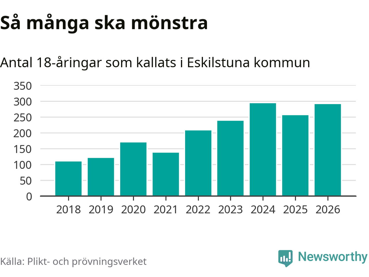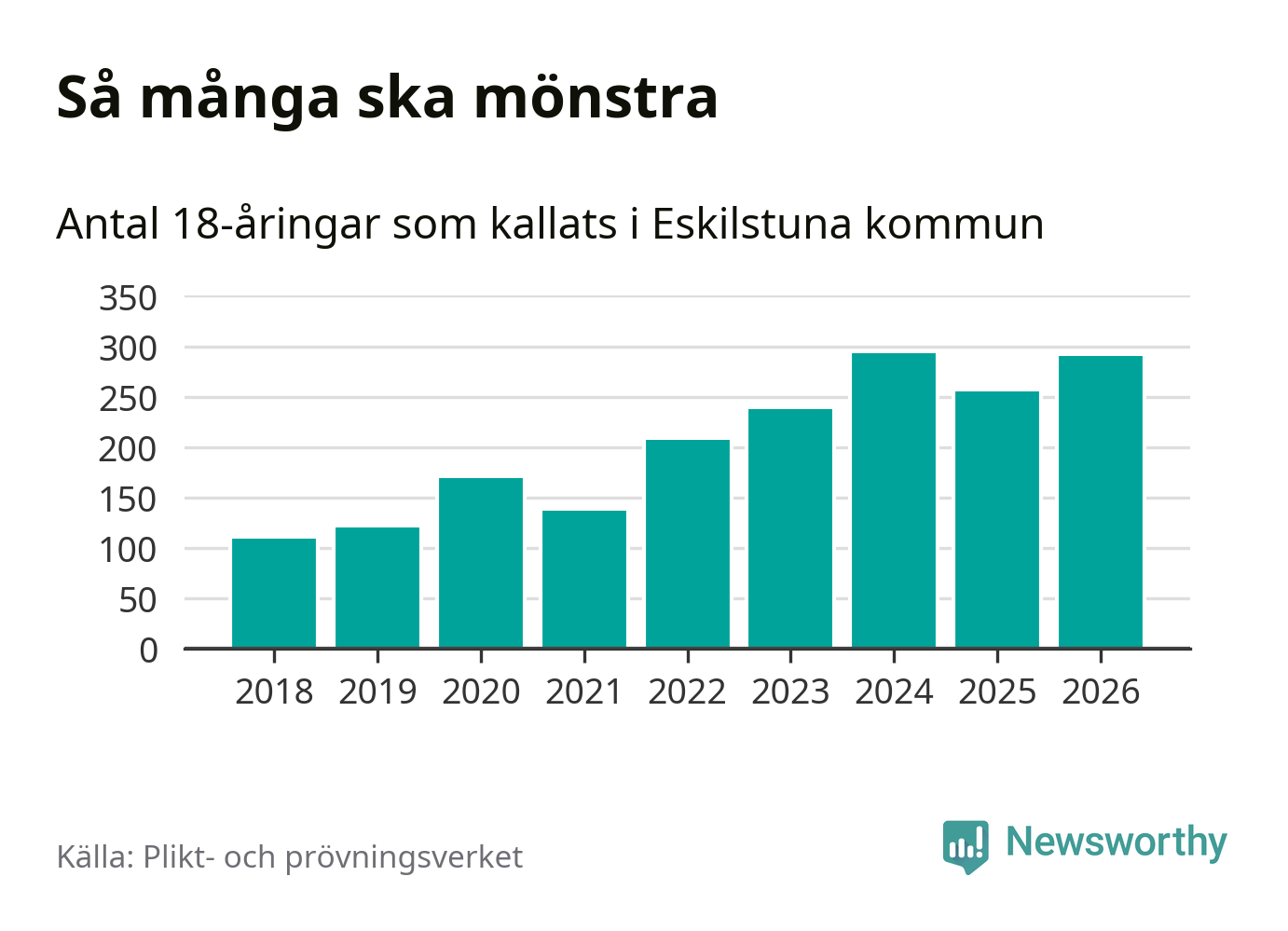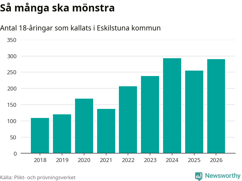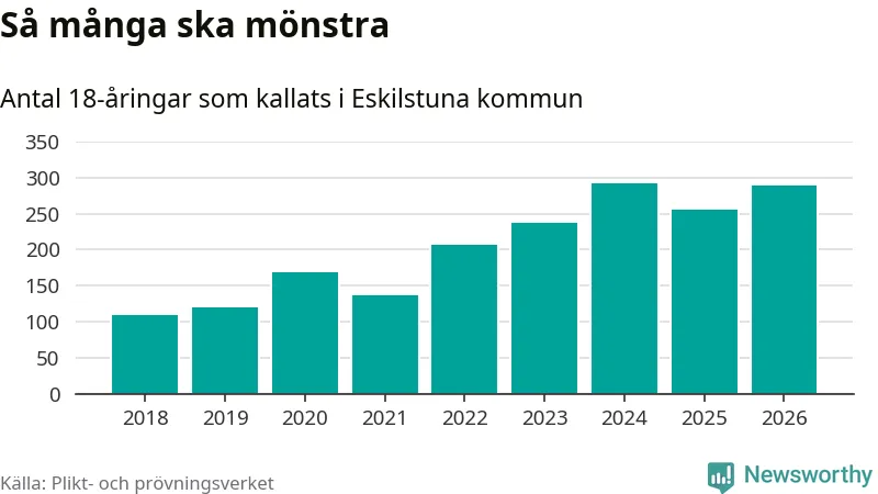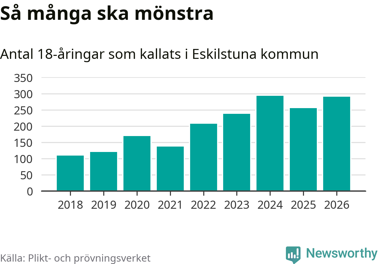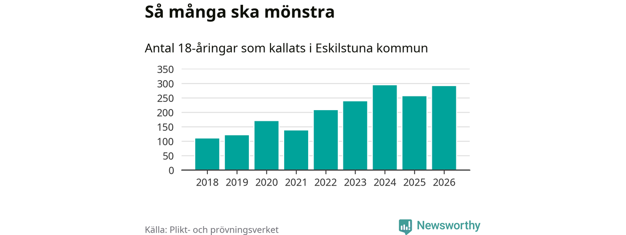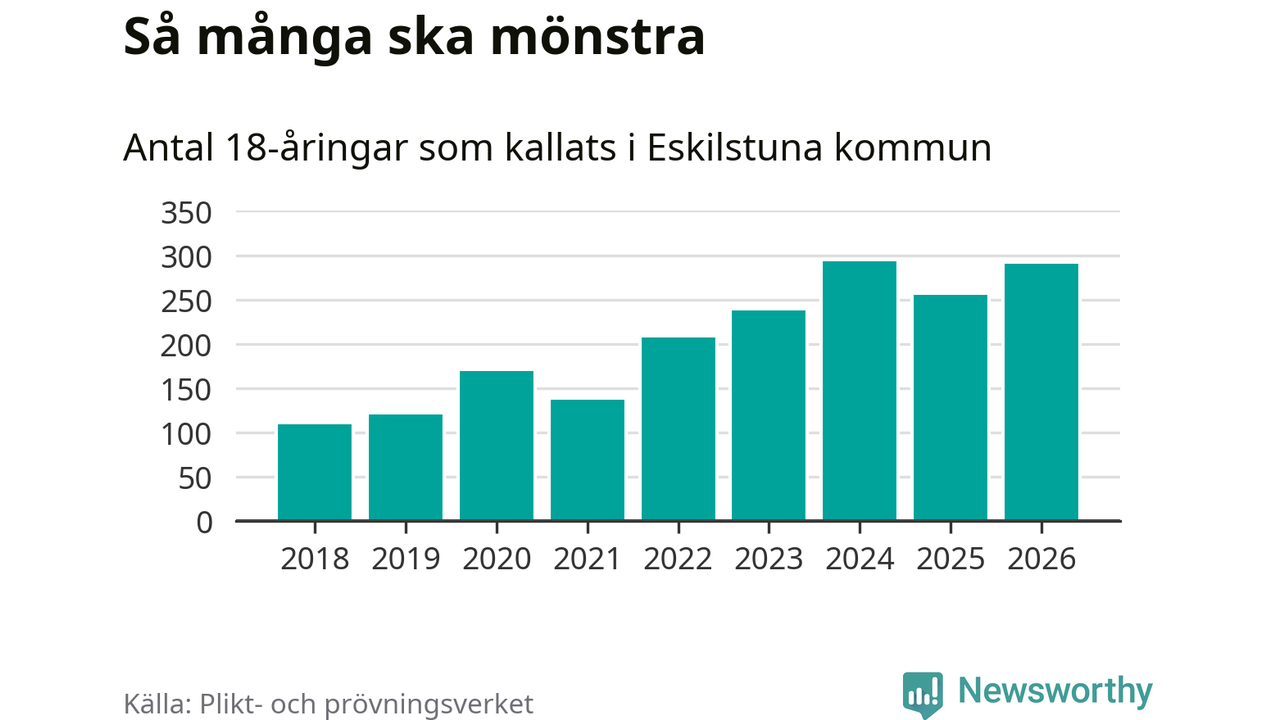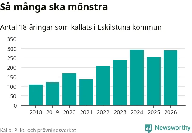290 personer är 35 fler än 2025. Som mest har 293 personer från en årskull kommunen mönstrat (2024). Totalt från Södermanlands län kallas 826 personer i år.