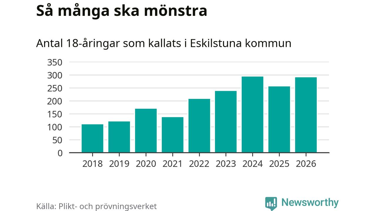 Nu kallas omkring 30 000 svenskar födda 2008 till mönstring. Och 290 av dem kommer från Eskilstuna, enligt ny statistik från Plikt- och prövningsverket. Det innebär att var femte invånare i åldersgruppen i kommunen kallas till mönstring. Det är ungefär lika stor andel som i Södermanland totalt. I riket som helhet kallas nästan var fjärde person i årskullen.