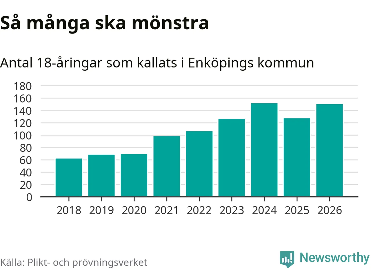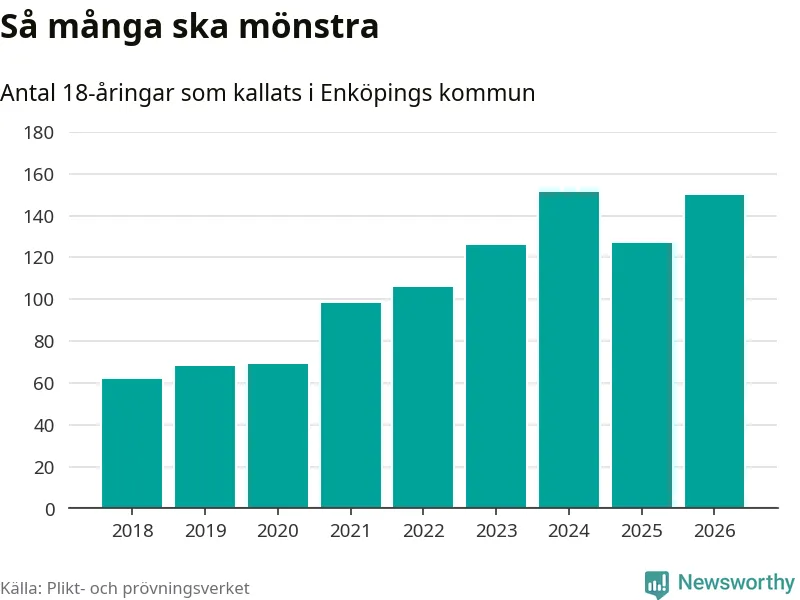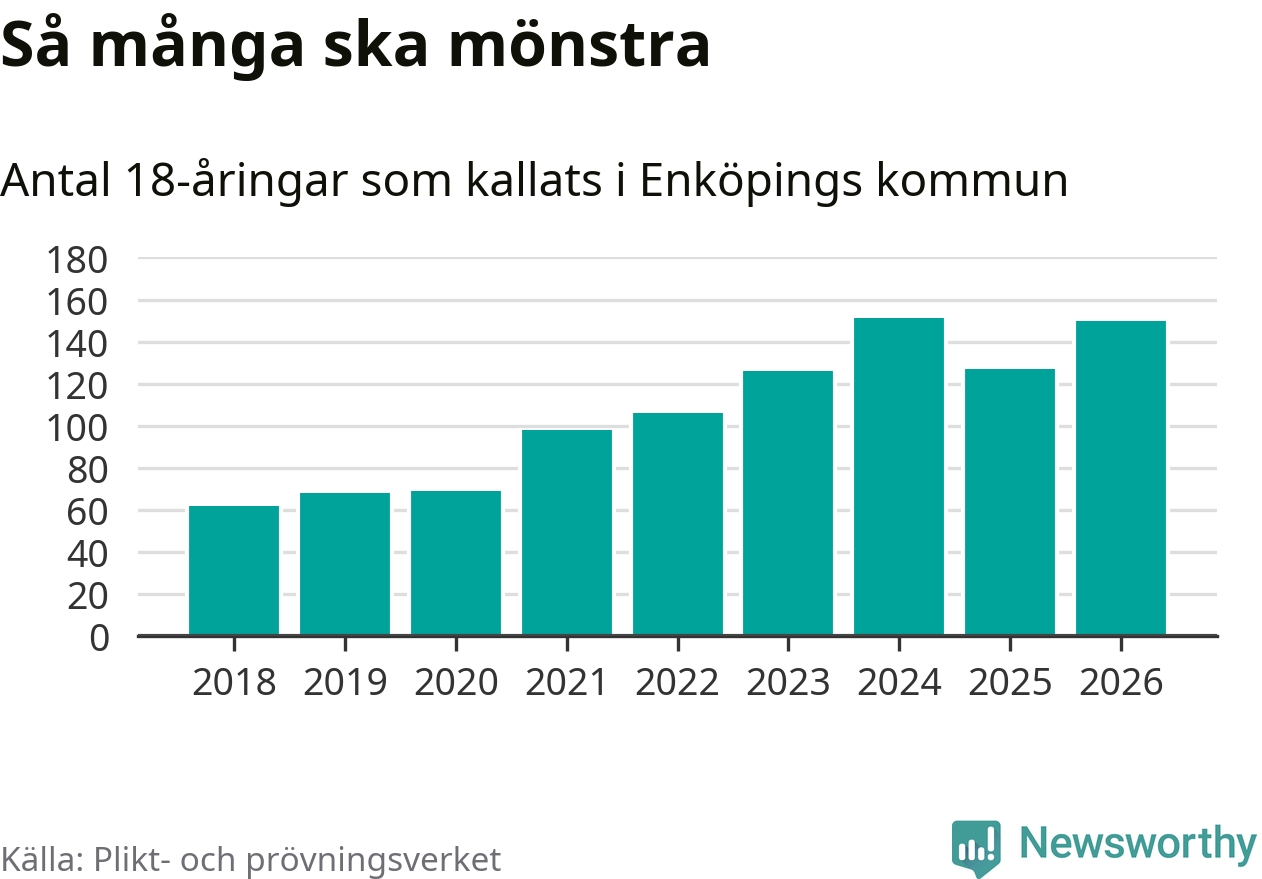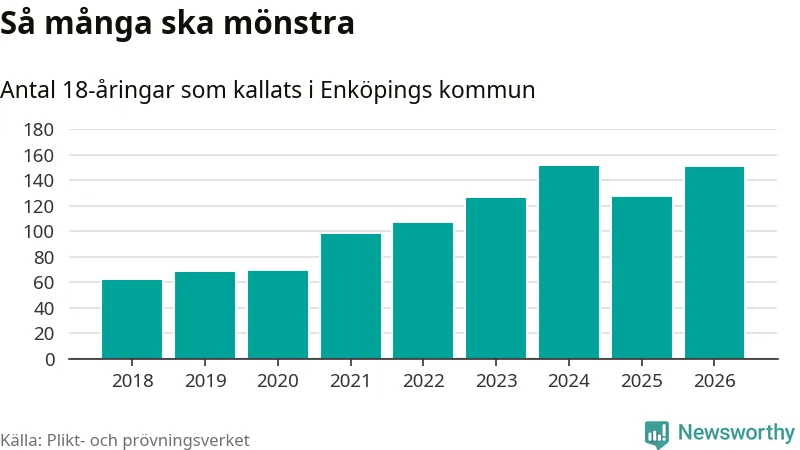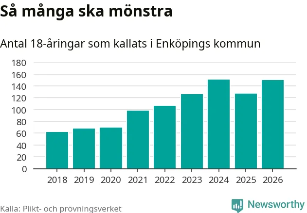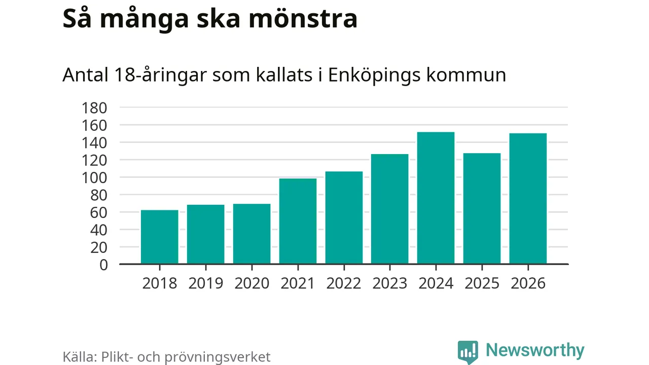 150 personer är 23 fler än 2025, men sett som andel av respektive åldersgrupp är skillnaden liten. Som mest har 151 personer från en årskull kommunen mönstrat (2024). Totalt från Uppsala län kallas 1 157 personer i år.