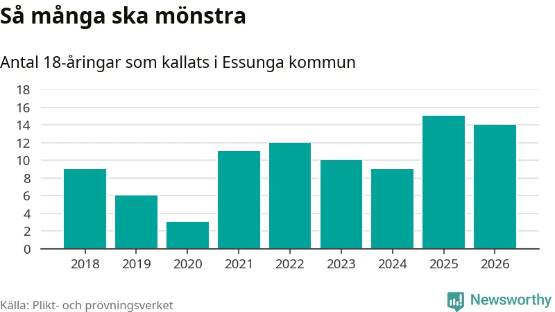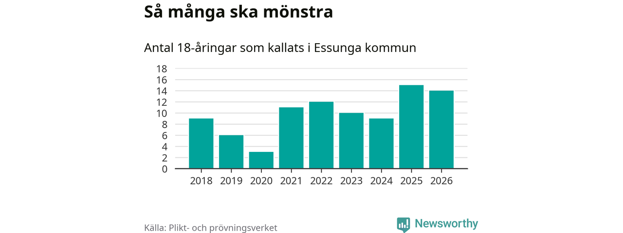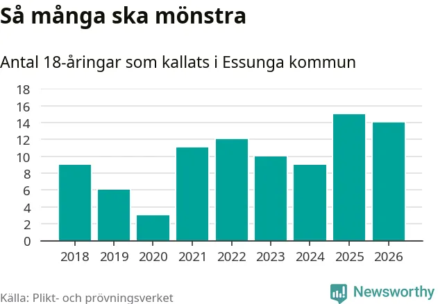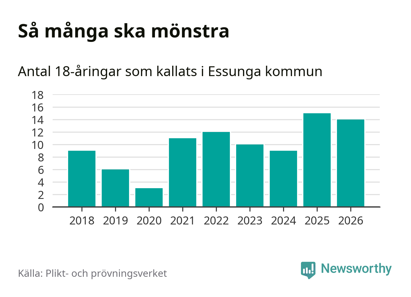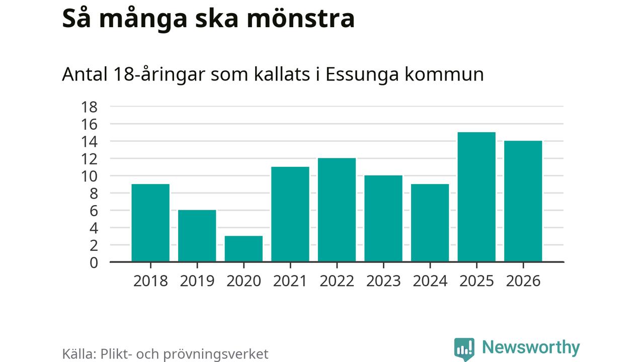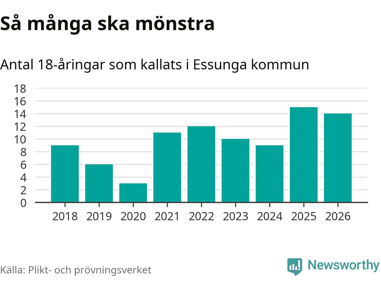 Nu kallas omkring 30 000 svenskar födda 2008 till mönstring. Och 14 av dem kommer från Essunga, enligt ny statistik från Plikt- och prövningsverket. Det innebär att var femte invånare i åldersgruppen i kommunen kallas till mönstring. Det är ungefär lika stor andel som i Västra Götaland totalt. I riket som helhet kallas nästan var fjärde person i årskullen.