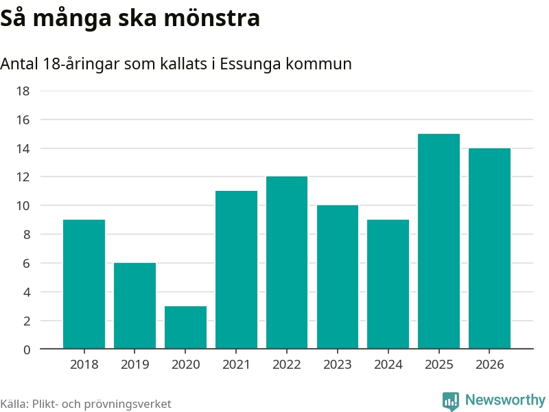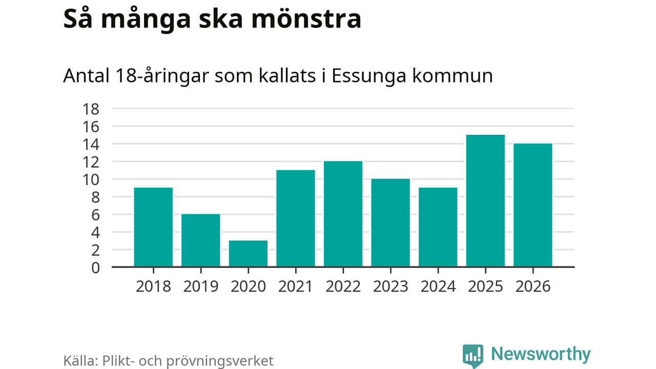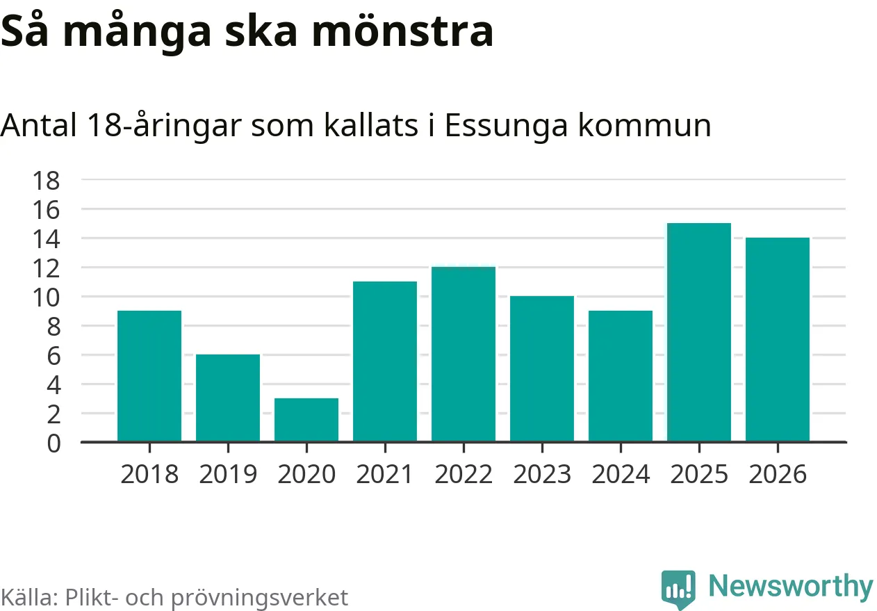 Antalet 18-åringar som kallas till mönstring fortsätter att öka i Sverige i takt med att värnplikten byggs ut. Från Essunga kallas nio män och fem kvinnor.