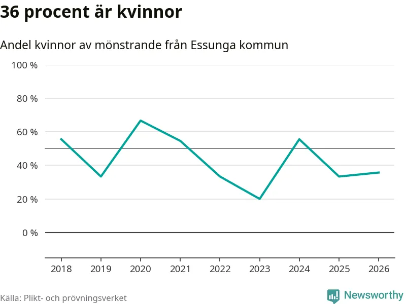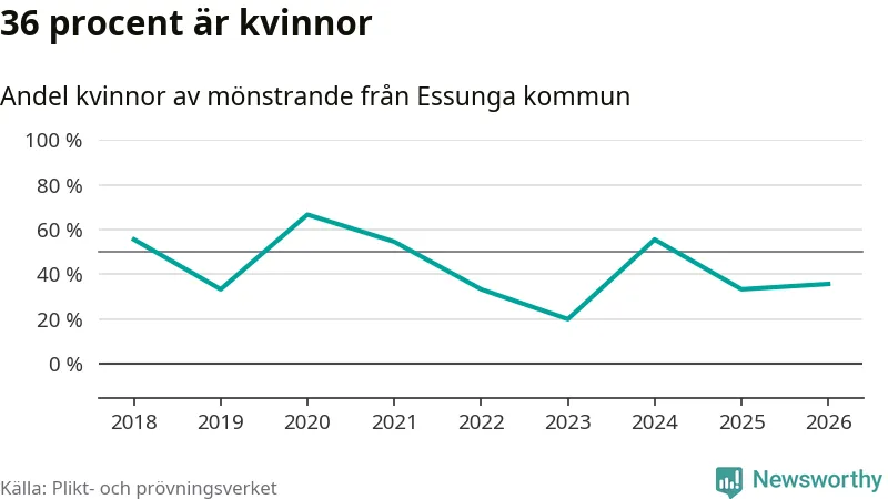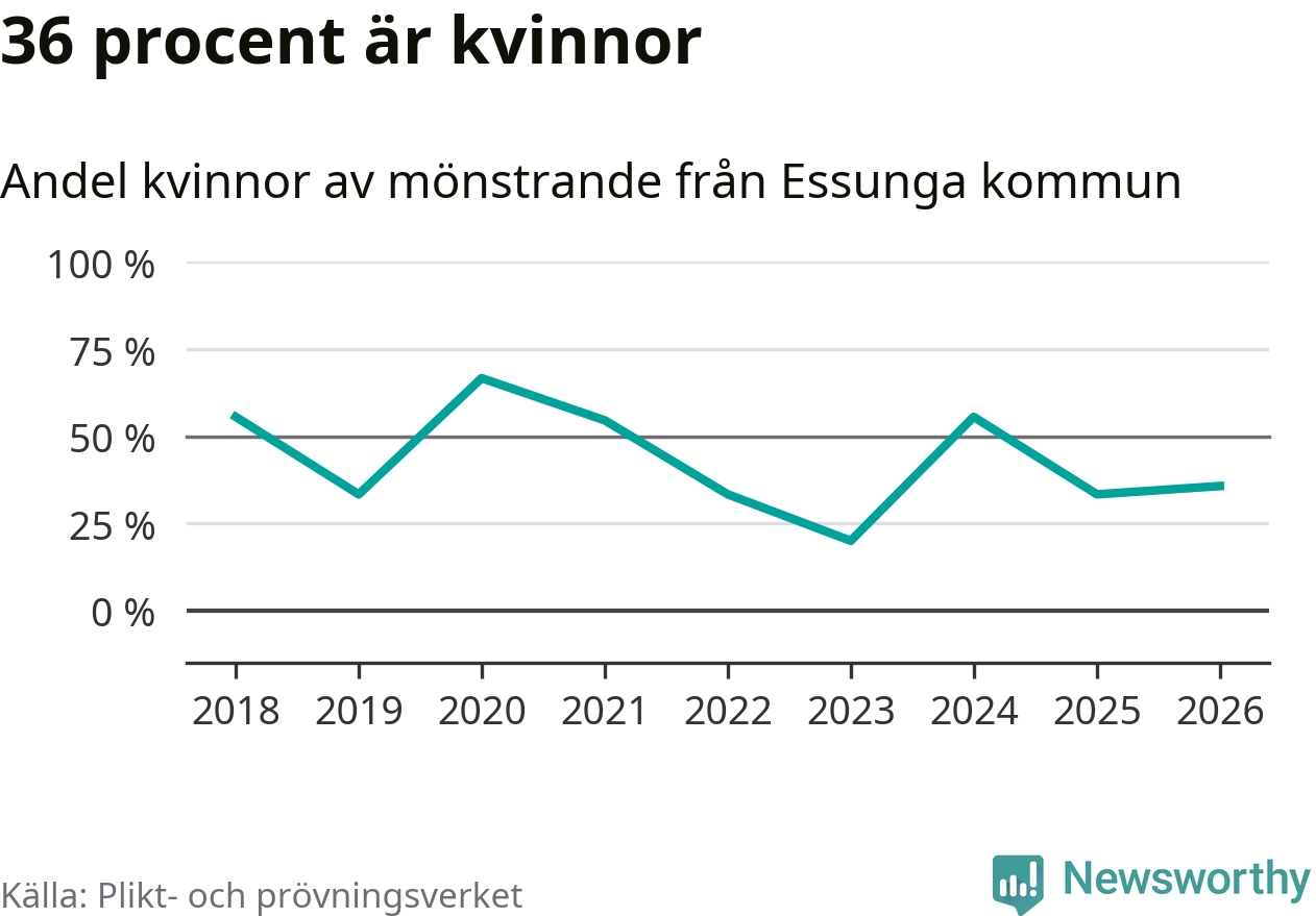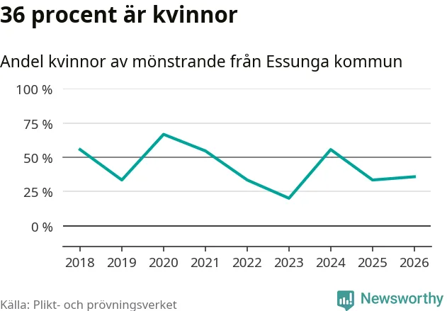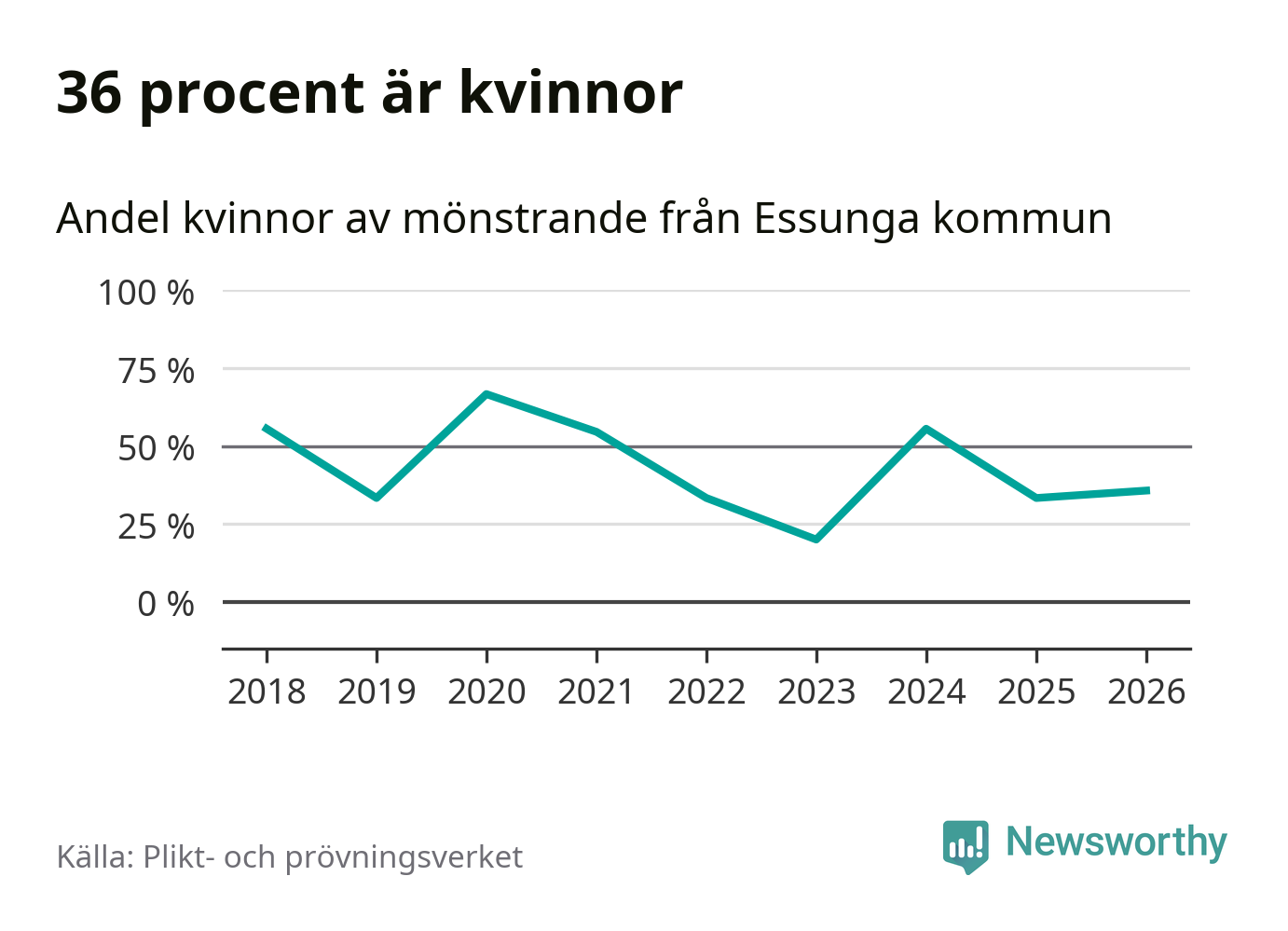 Fem av de som kallats till mönstring från Essunga är kvinnor, vilket motsvarar 36 procent av de mönstrande. Som mest har sex kvinnor kallats från kommunen (2021). I riket som helhet är 28 procent av de mönstrande tjejer.