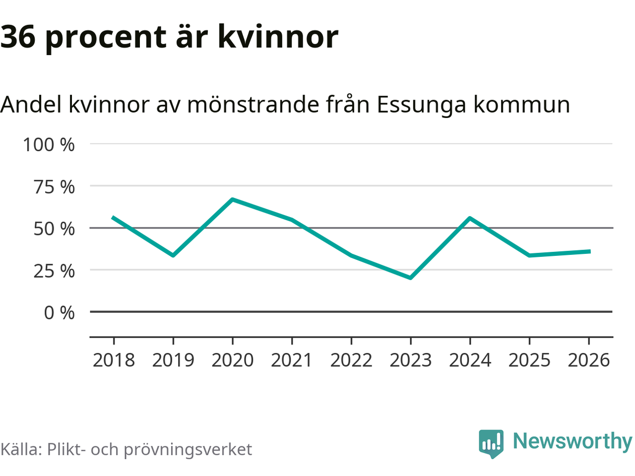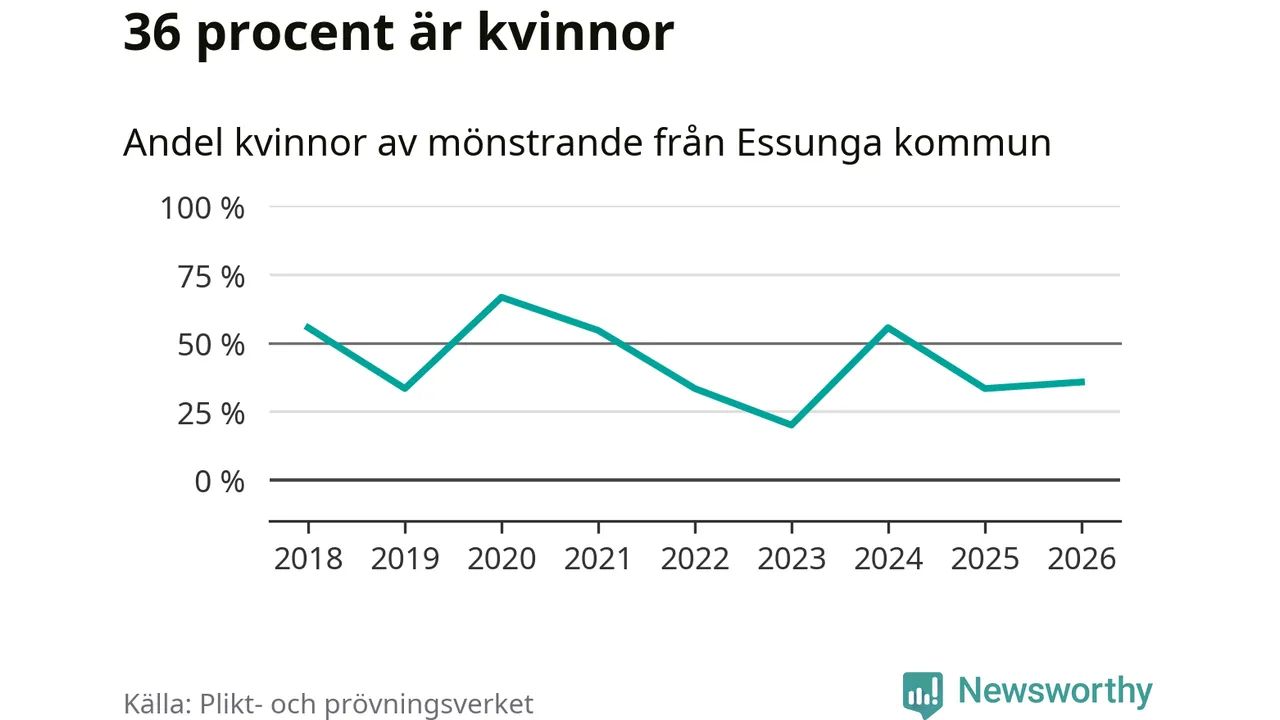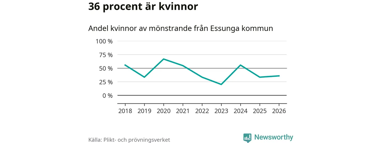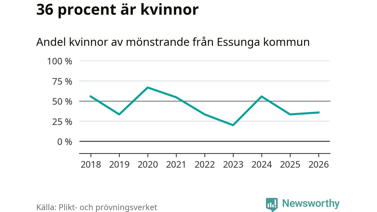 Av de som skrivits in till någon av Försvarmaktens grundutbildningar förra året, 2025, kommer fyra (två män och två kvinnor) från Essunga. Tre av dessa antogs efter att ha kallats till mönstring.