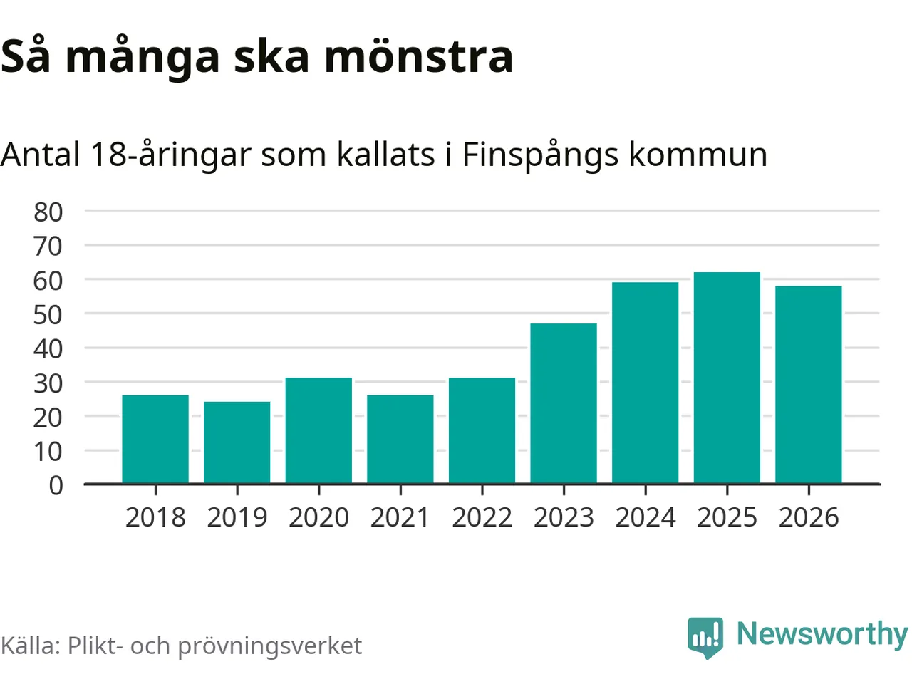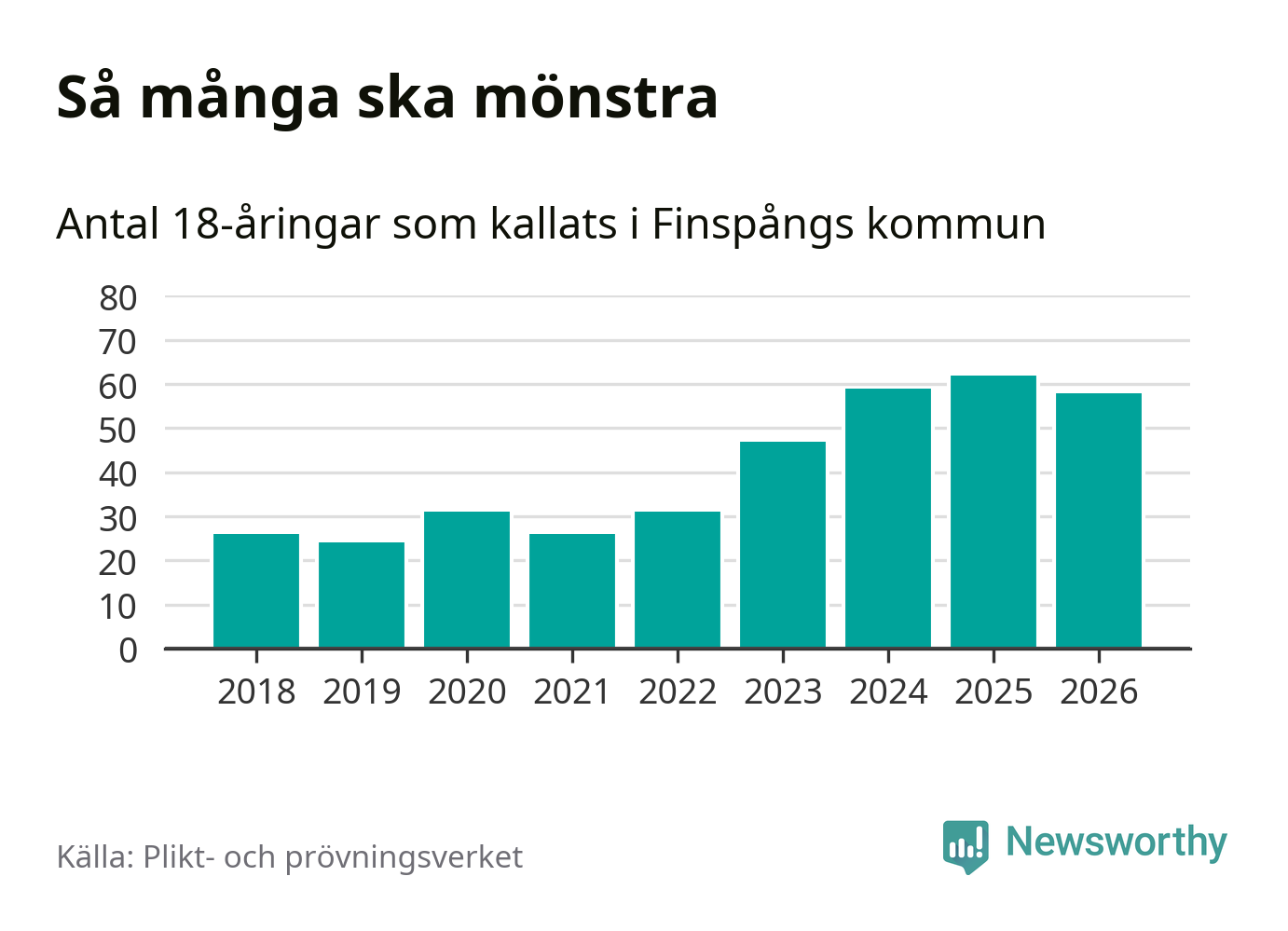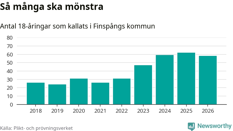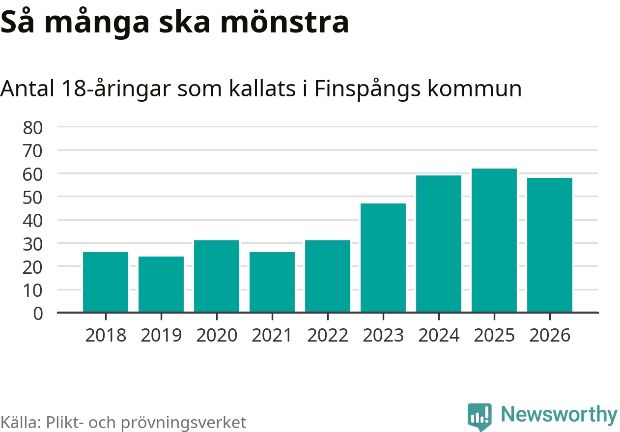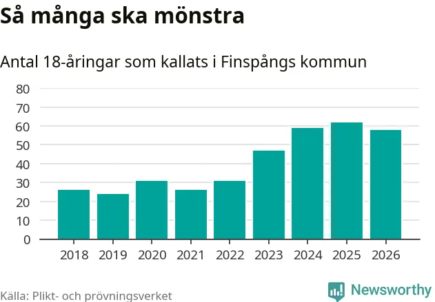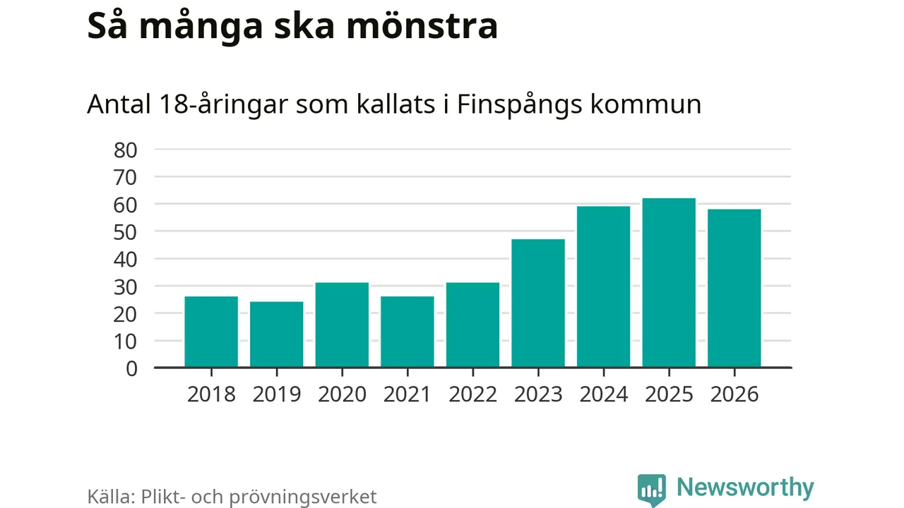 Nu kallas omkring 30 000 svenskar födda 2008 till mönstring. Och 58 av dem kommer från Finspång, enligt ny statistik från Plikt- och prövningsverket. Det innebär att nästan var fjärde invånare i åldersgruppen i kommunen kallas till mönstring. Det är ungefär lika stor andel som i Östergötland totalt. Även i riket som helhet kallas nästan var fjärde person i årskullen.