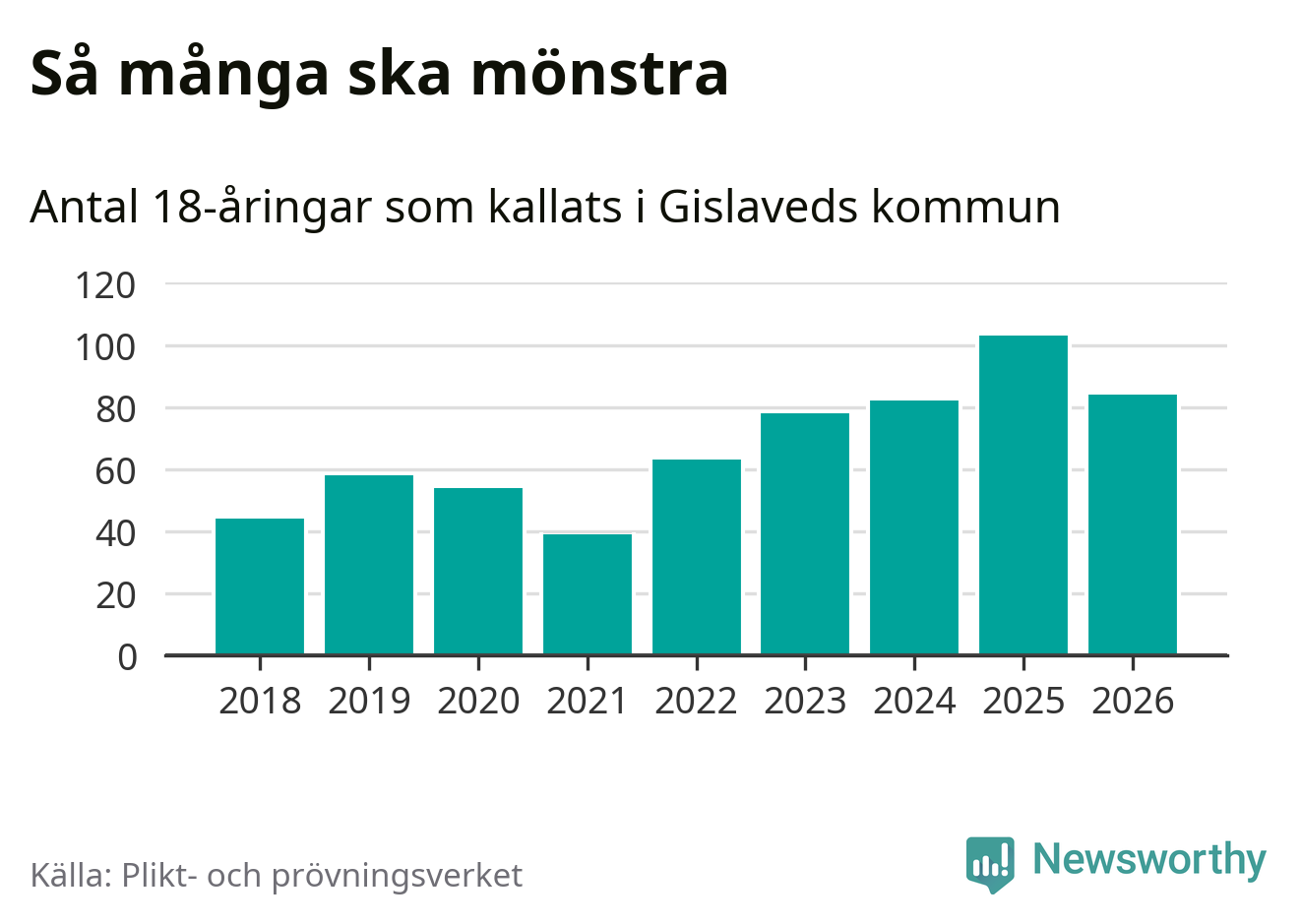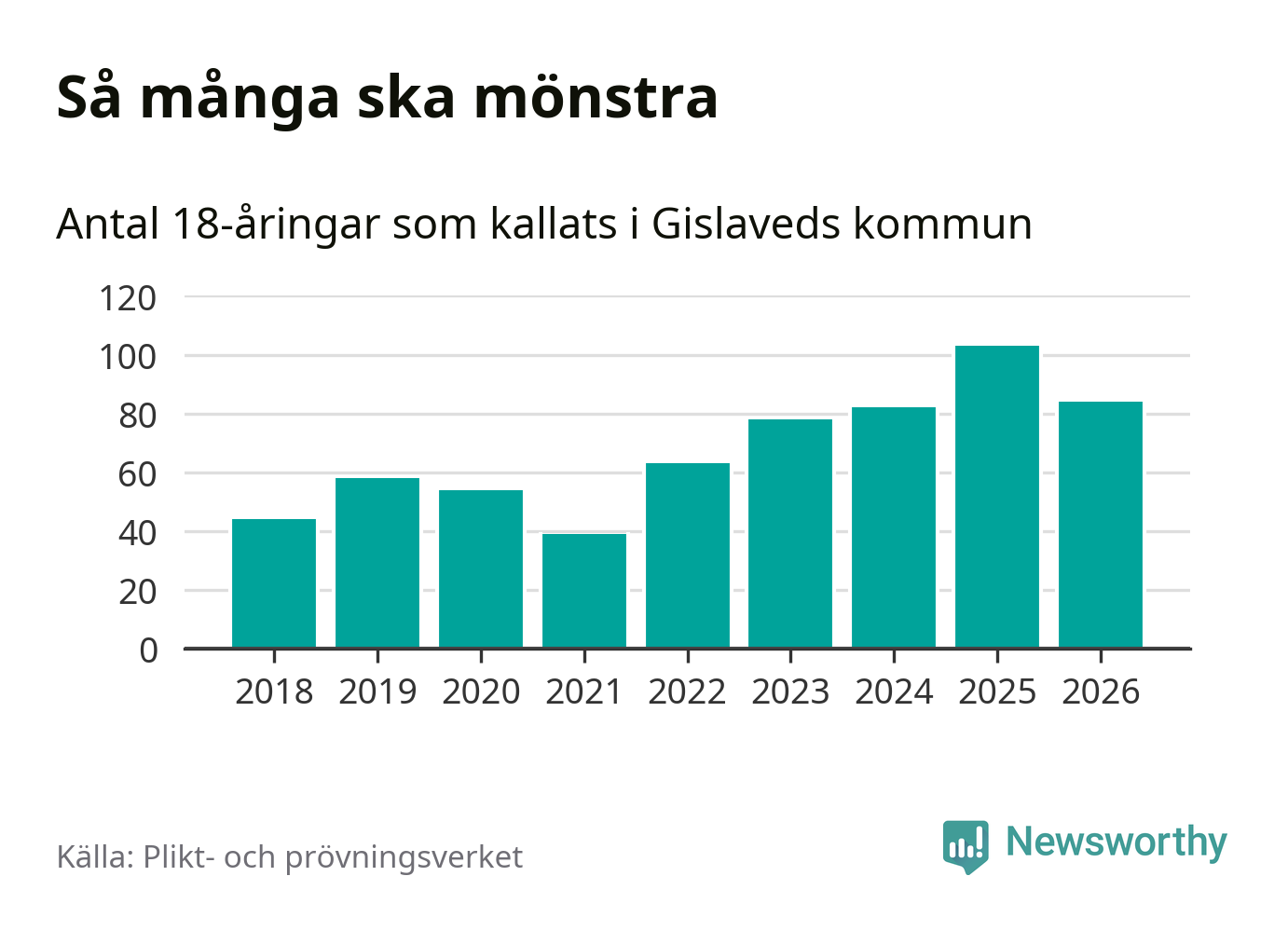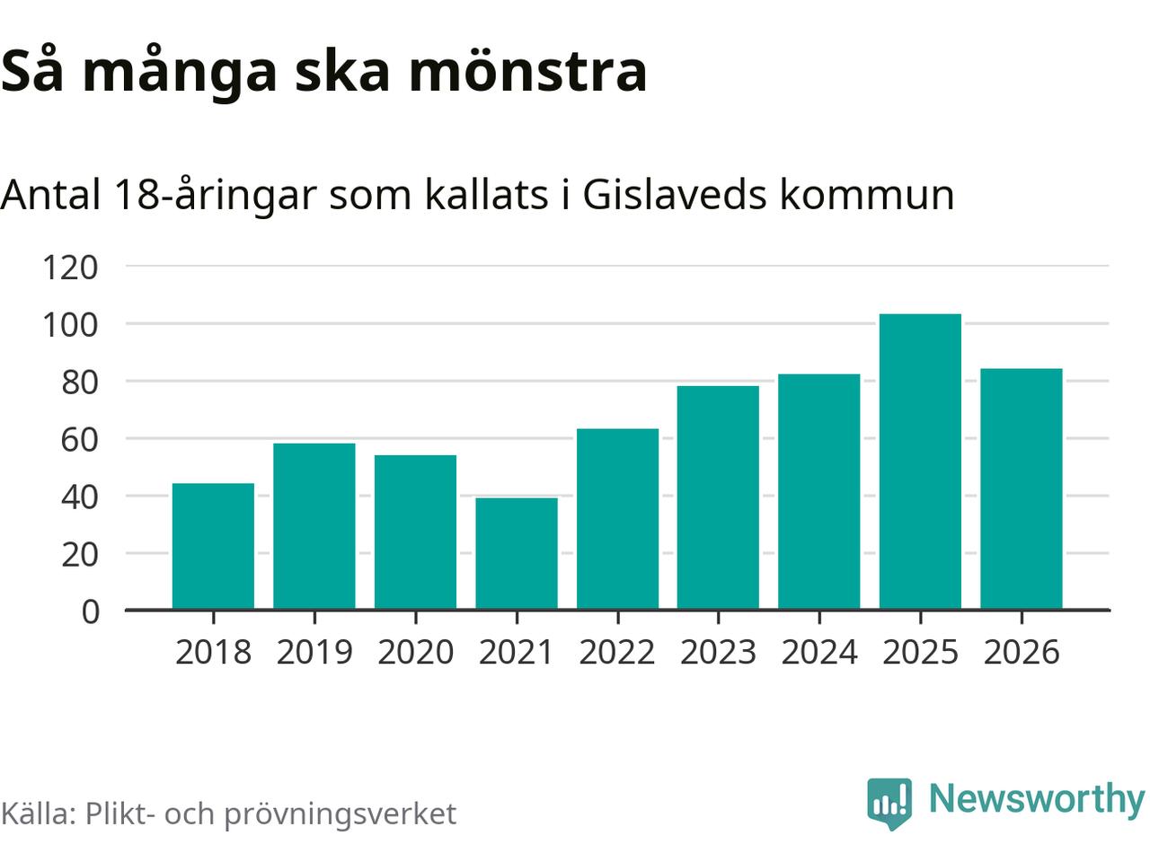 Nu kallas omkring 30 000 svenskar födda 2008 till mönstring. Och 84 av dem kommer från Gislaved, enligt ny statistik från Plikt- och prövningsverket. Det innebär att var femte invånare i åldersgruppen i kommunen kallas till mönstring. Det är en lägre andel än i Jönköpings län totalt. I riket som helhet kallas nästan var fjärde person i årskullen.