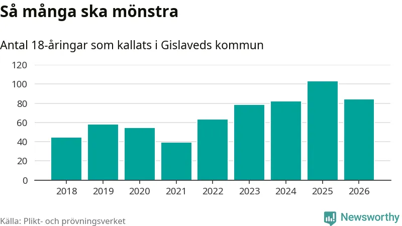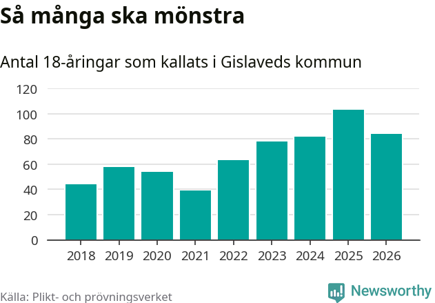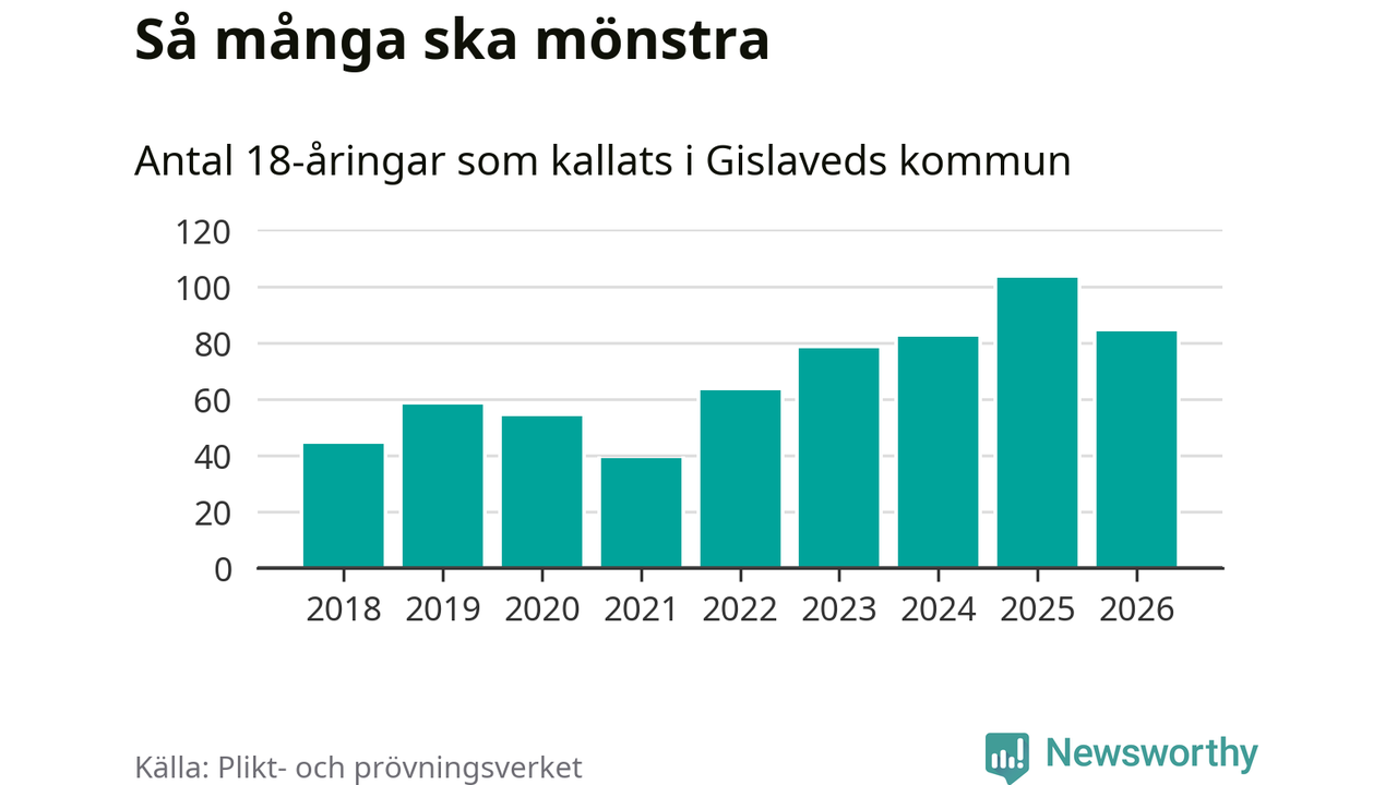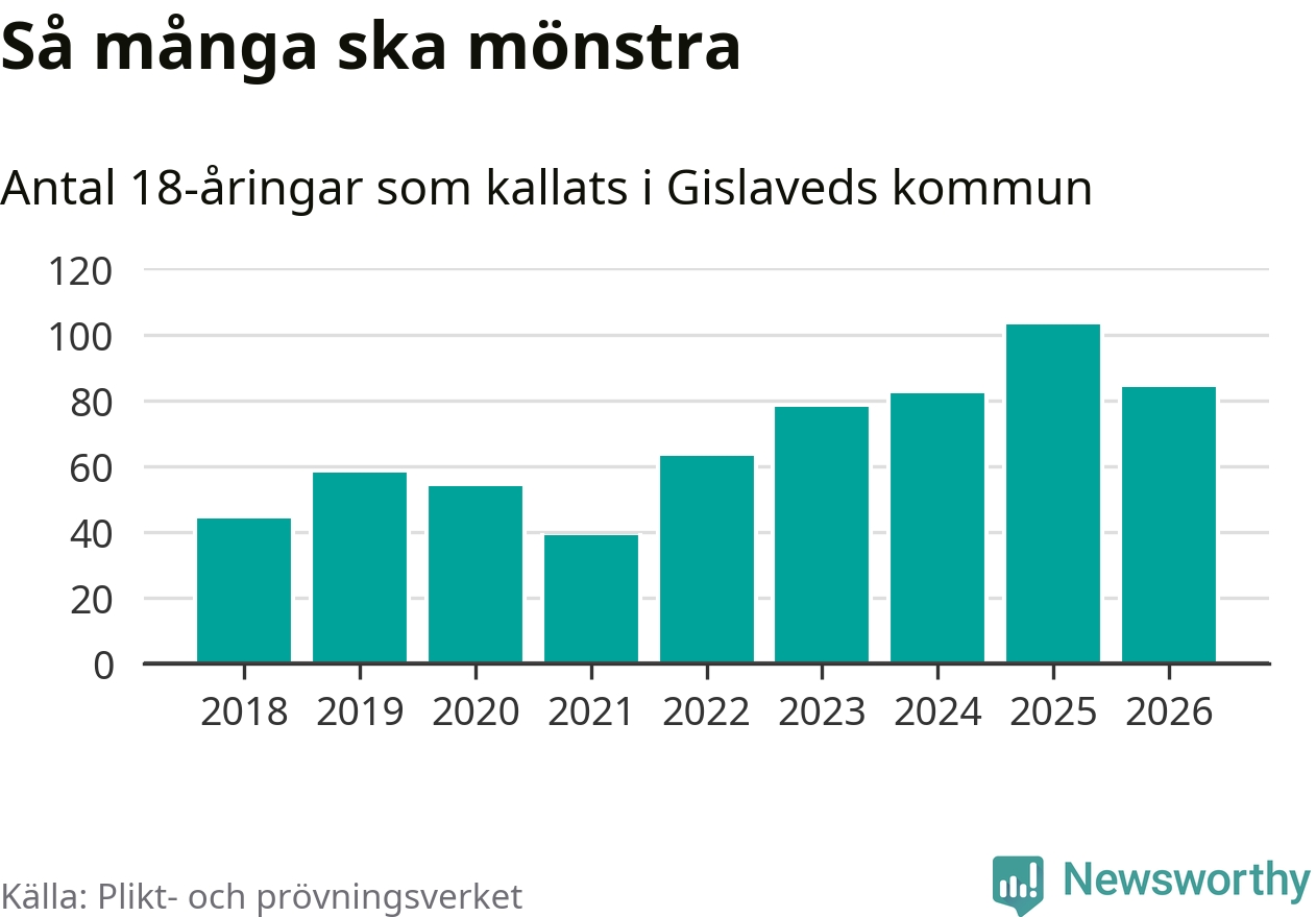 Nu kallas omkring 30 000 svenskar födda 2008 till mönstring. Och 84 av dem kommer från Gislaved, enligt ny statistik från Plikt- och prövningsverket. Det innebär att var femte invånare i åldersgruppen i kommunen kallas till mönstring. Det är en lägre andel än i Jönköpings län totalt. I riket som helhet kallas nästan var fjärde person i årskullen.