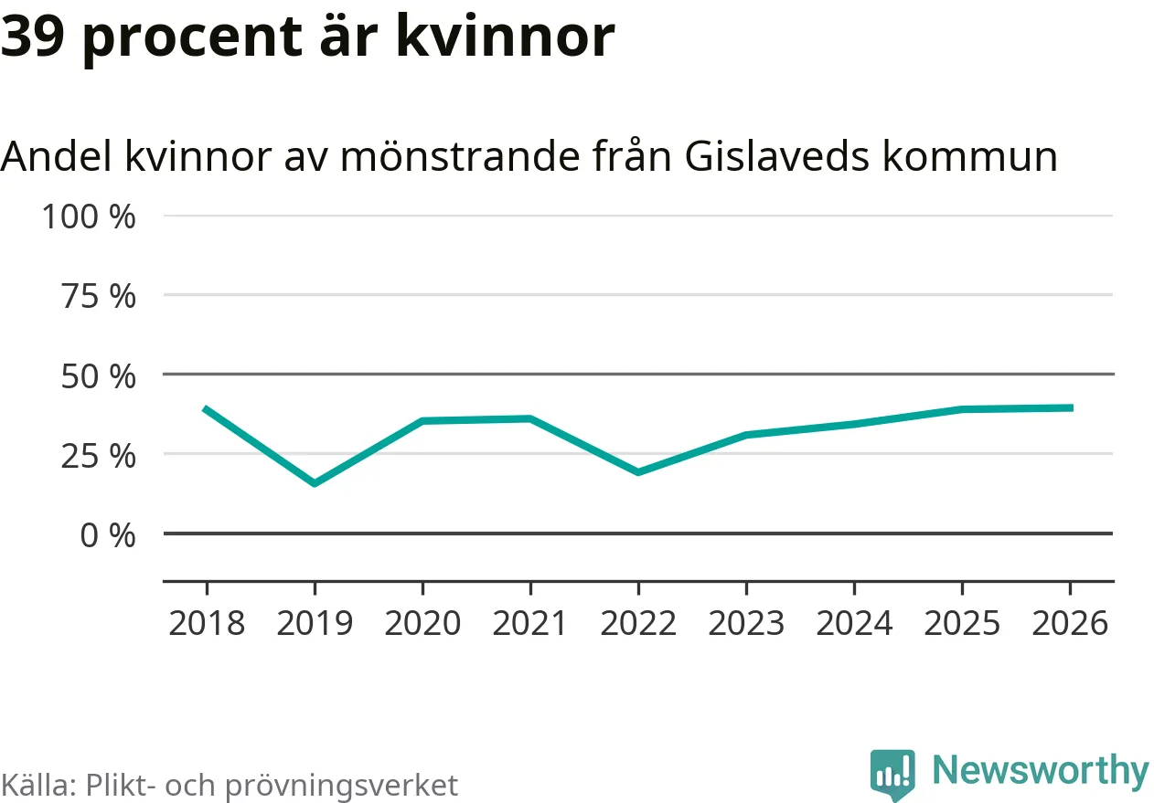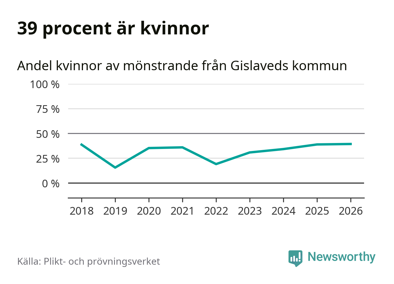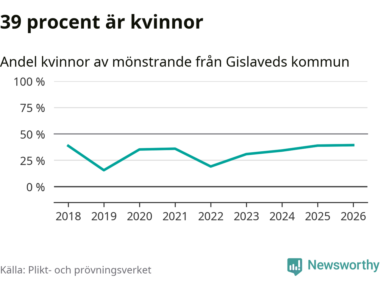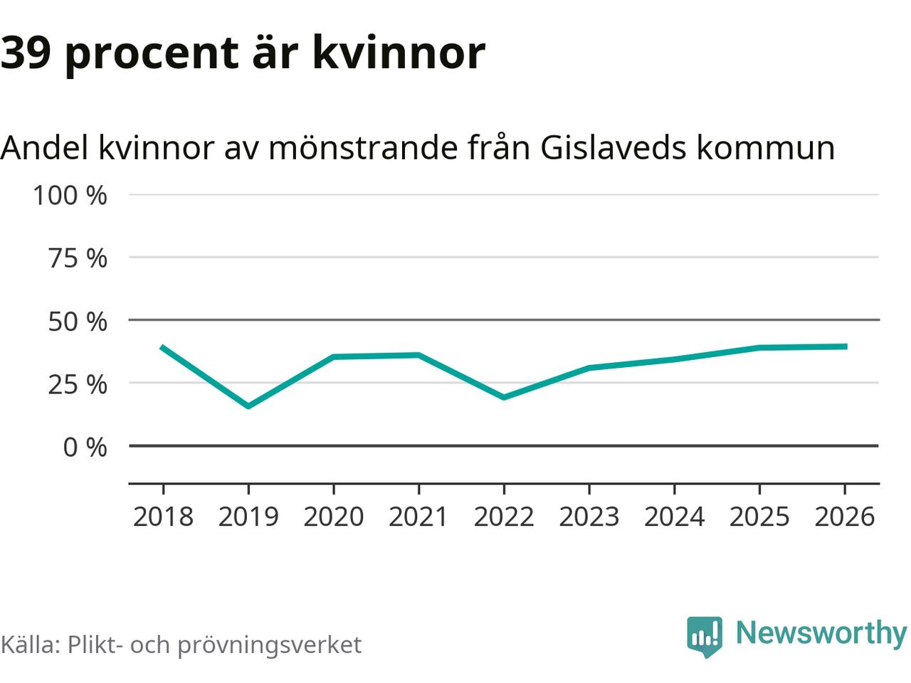 33 av de som kallats till mönstring från Gislaved är kvinnor, vilket motsvarar 39 procent av de mönstrande. Det är en rekordstor andel av de mönstrande, men 2025 var det fler kvinnor från kommunen – 40 stycken – som mönstrade. I riket som helhet är 28 procent av de mönstrande tjejer.