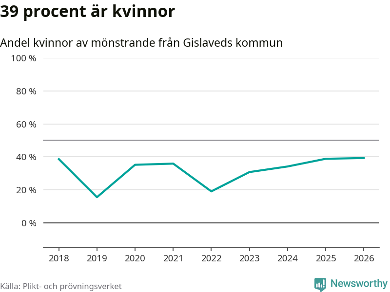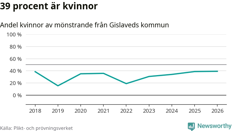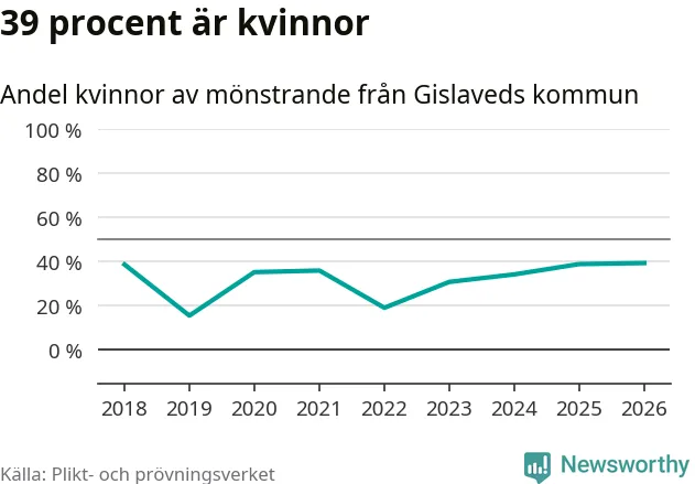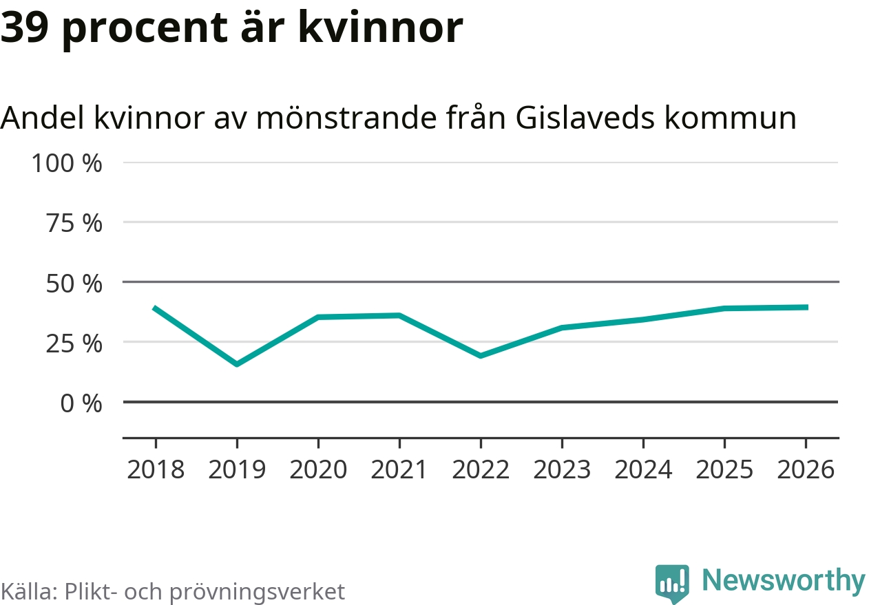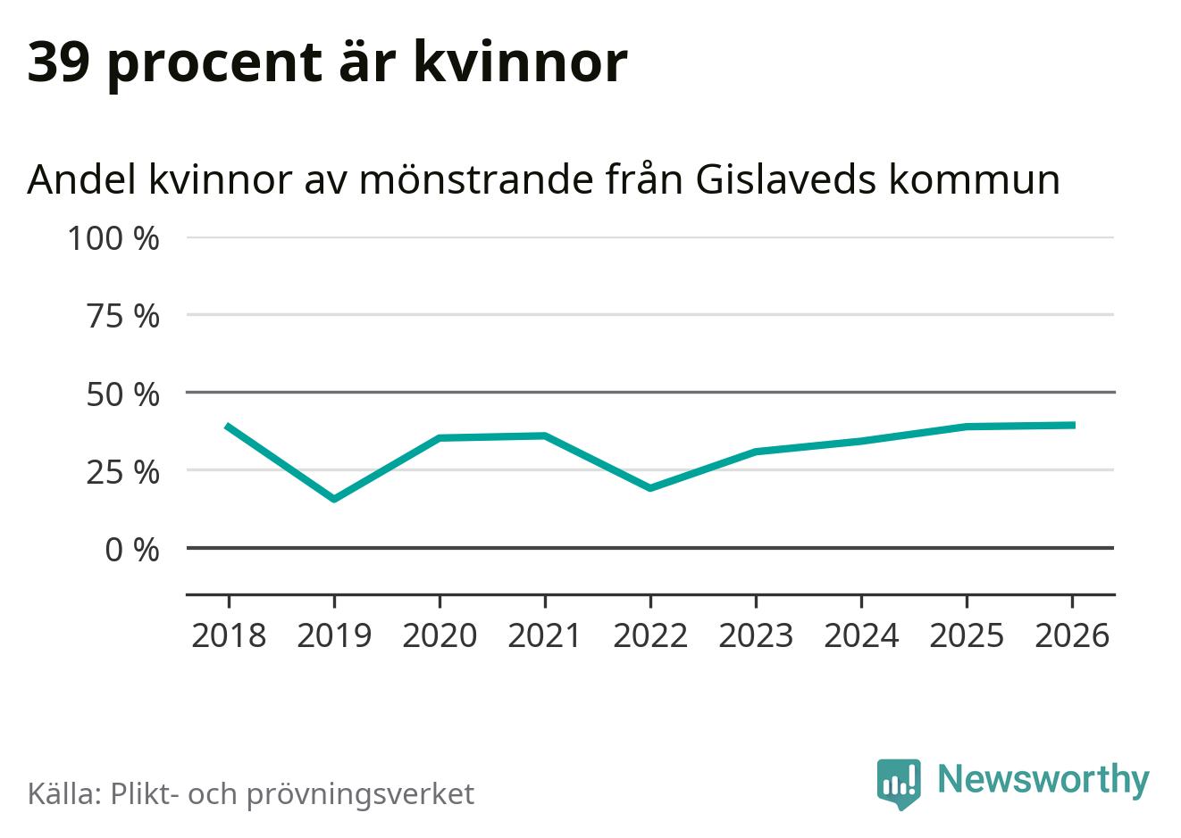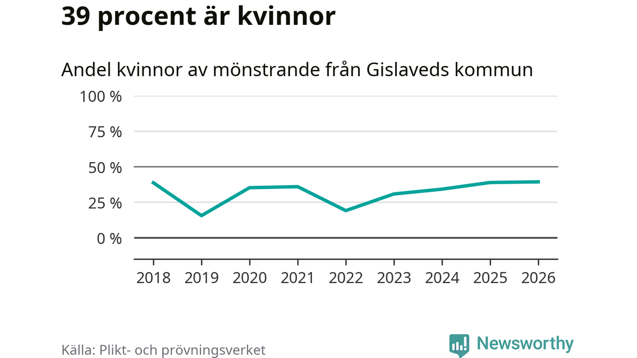 33 av de som kallats till mönstring från Gislaved är kvinnor, vilket motsvarar 39 procent av de mönstrande. Det är en rekordstor andel av de mönstrande, men 2025 var det fler kvinnor från kommunen – 40 stycken – som mönstrade. I riket som helhet är 28 procent av de mönstrande tjejer.