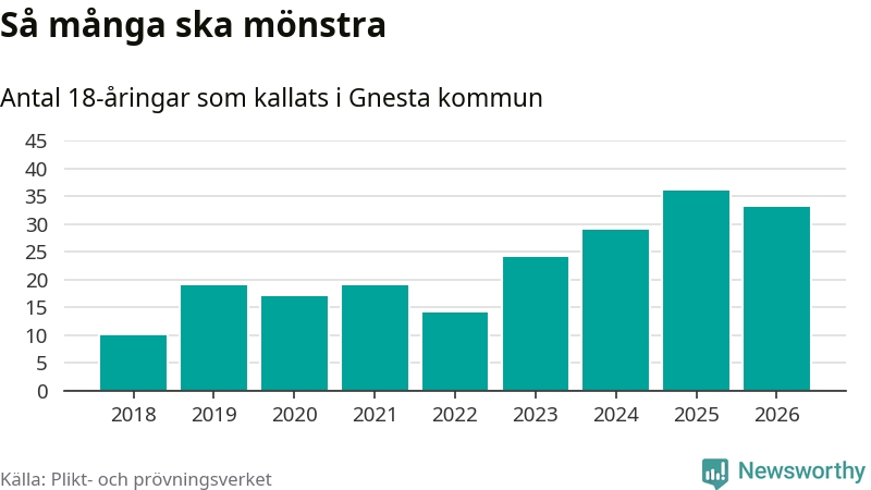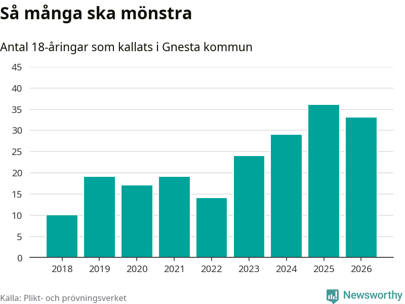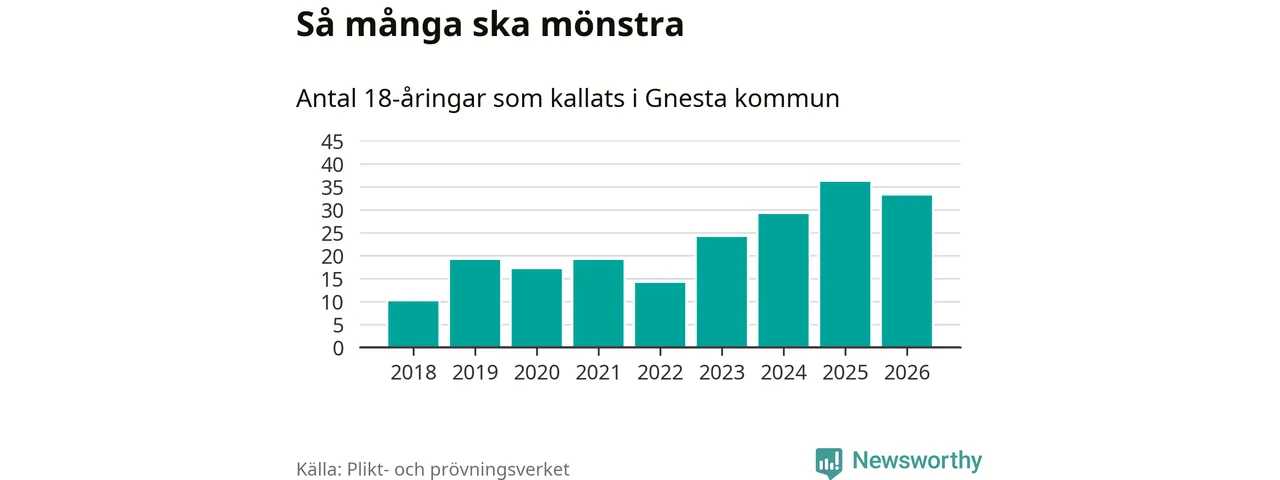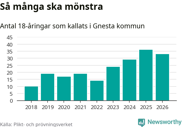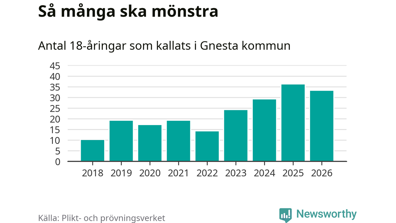 Nu kallas omkring 30 000 svenskar födda 2008 till mönstring. Och 33 av dem kommer från Gnesta, enligt ny statistik från Plikt- och prövningsverket. Det innebär att nästan var fjärde invånare i åldersgruppen i kommunen kallas till mönstring. Det är ungefär lika stor andel som i Södermanland totalt. Även i riket som helhet kallas nästan var fjärde person i årskullen.