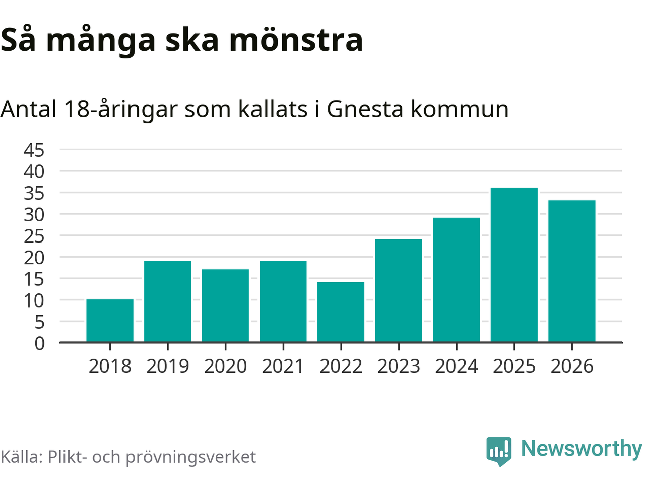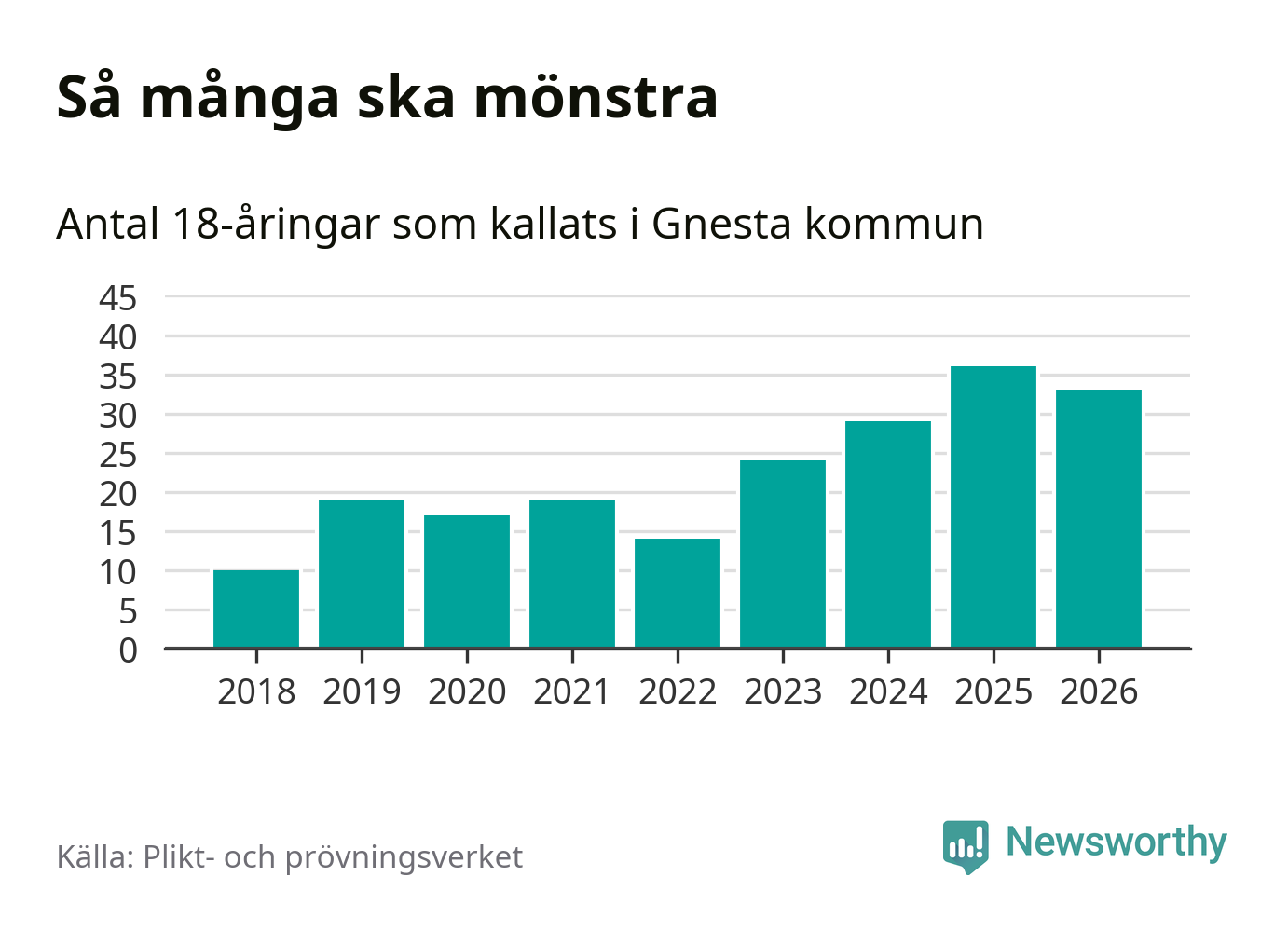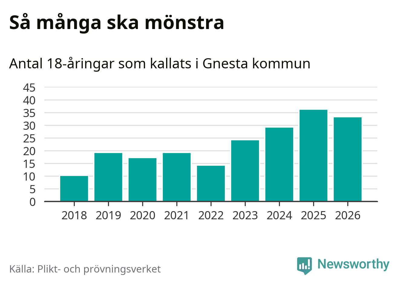 Nu kallas omkring 30 000 svenskar födda 2008 till mönstring. Och 33 av dem kommer från Gnesta, enligt ny statistik från Plikt- och prövningsverket. Det innebär att nästan var fjärde invånare i åldersgruppen i kommunen kallas till mönstring. Det är ungefär lika stor andel som i Södermanland totalt. Även i riket som helhet kallas nästan var fjärde person i årskullen.