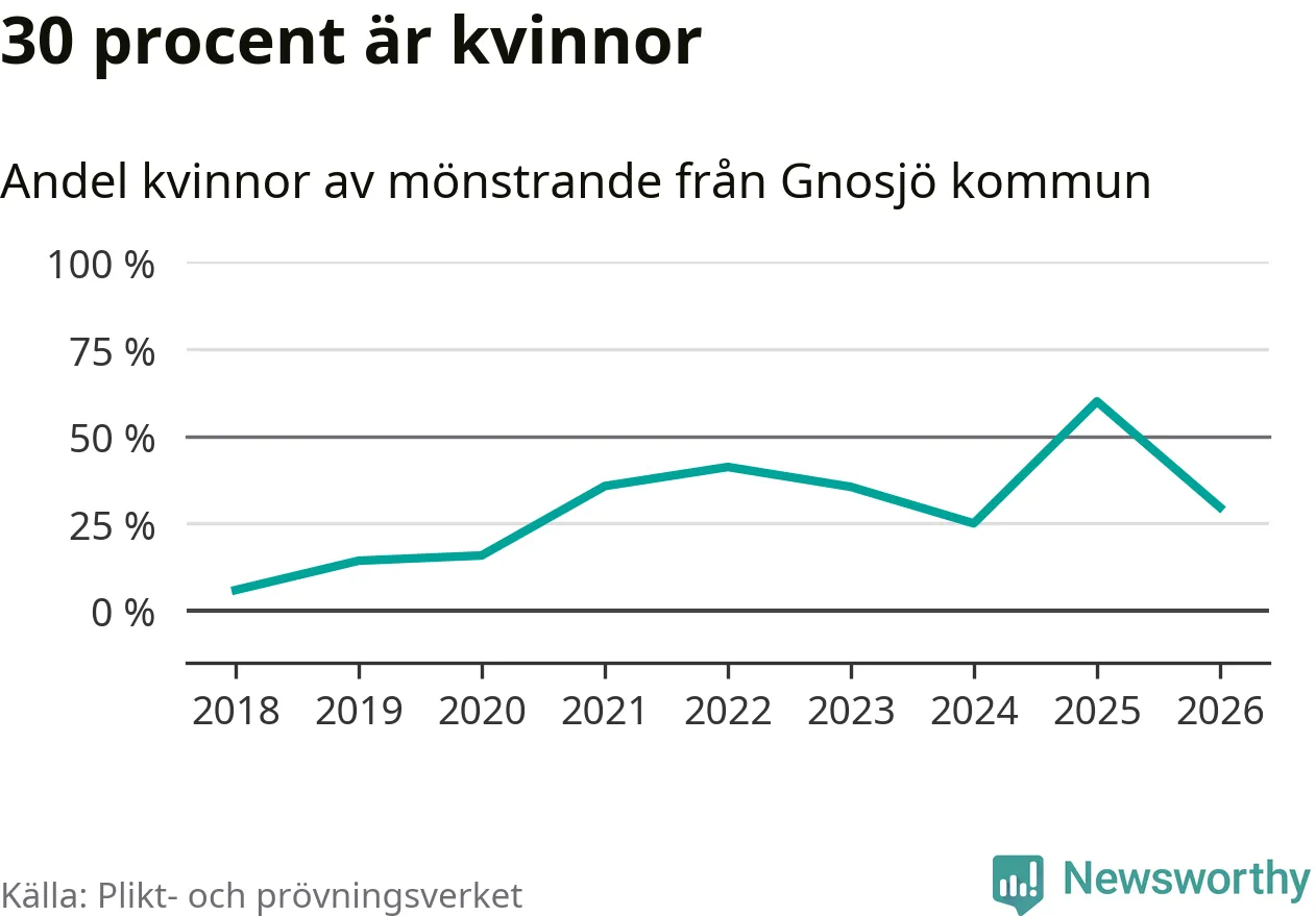 Åtta av de som kallats till mönstring från Gnosjö är kvinnor, vilket motsvarar 30 procent av de mönstrande. Som mest har 15 kvinnor kallats från kommunen (2025). I riket som helhet är 28 procent av de mönstrande tjejer.
