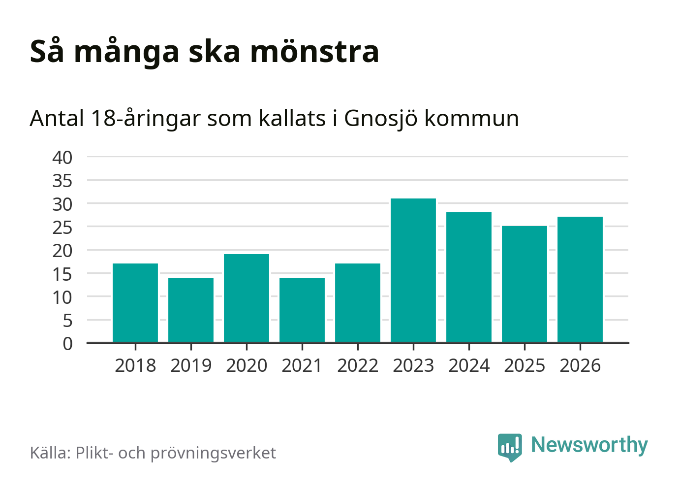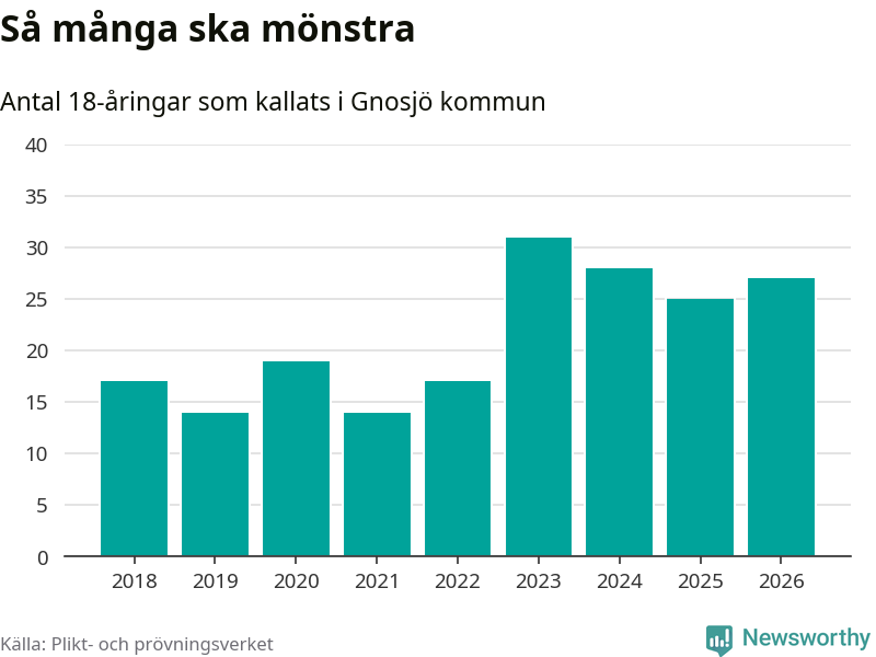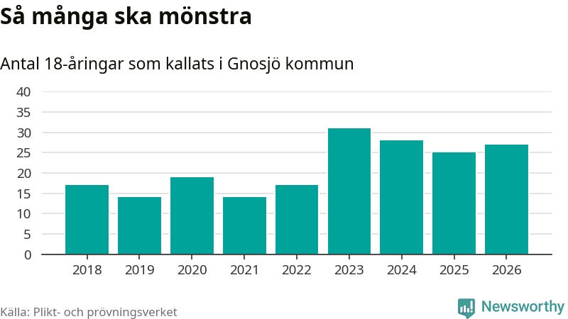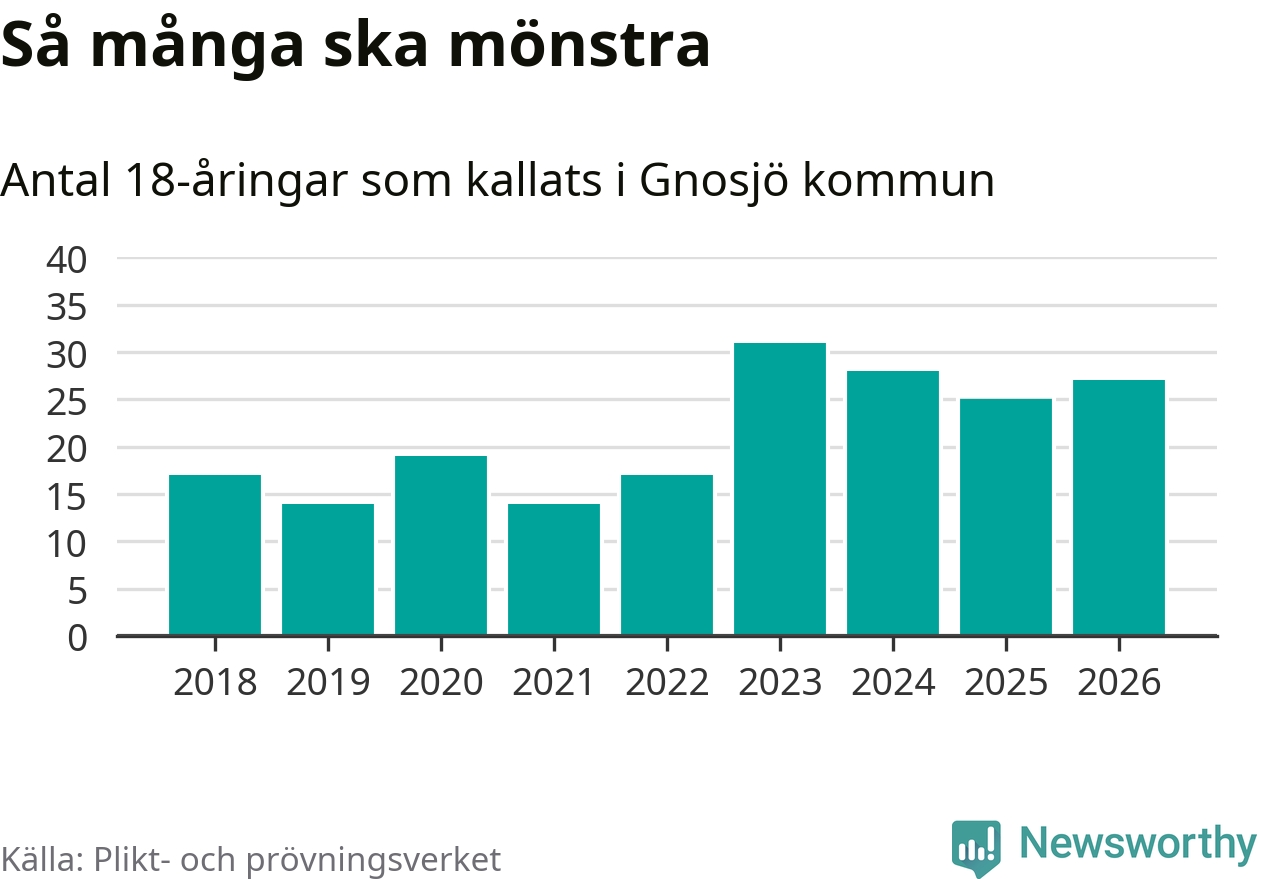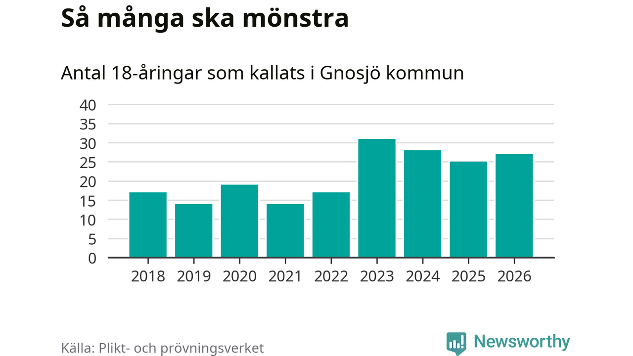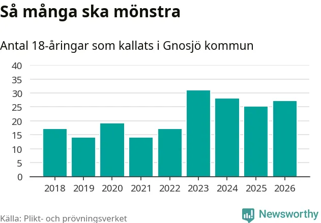 27 personer är två fler än 2025. Som mest har 31 personer från en årskull kommunen mönstrat (2023). Totalt från Jönköpings län kallas 1 124 personer i år.