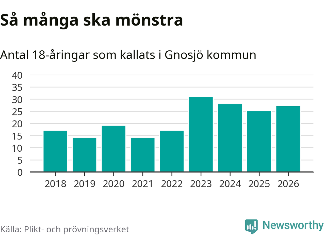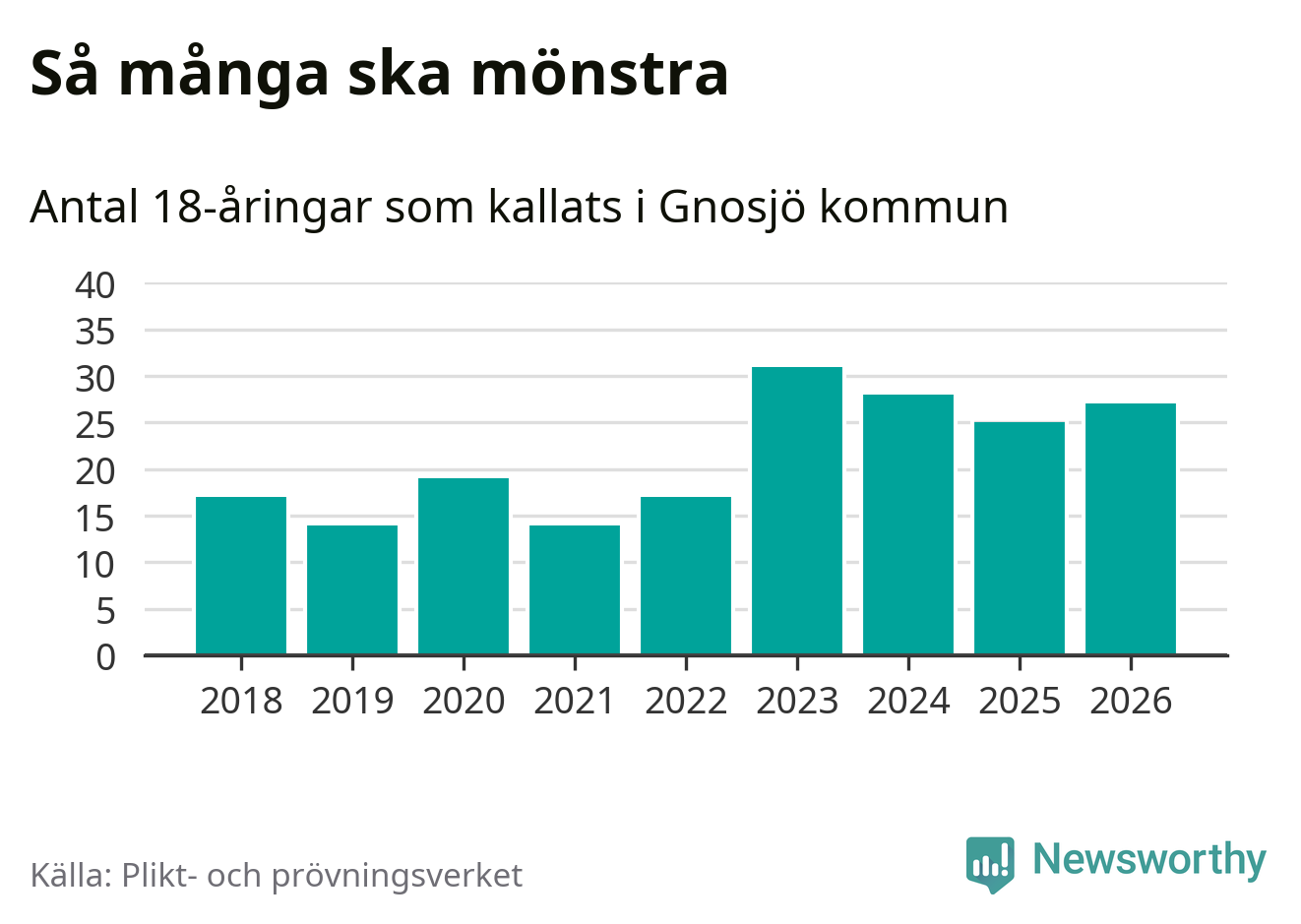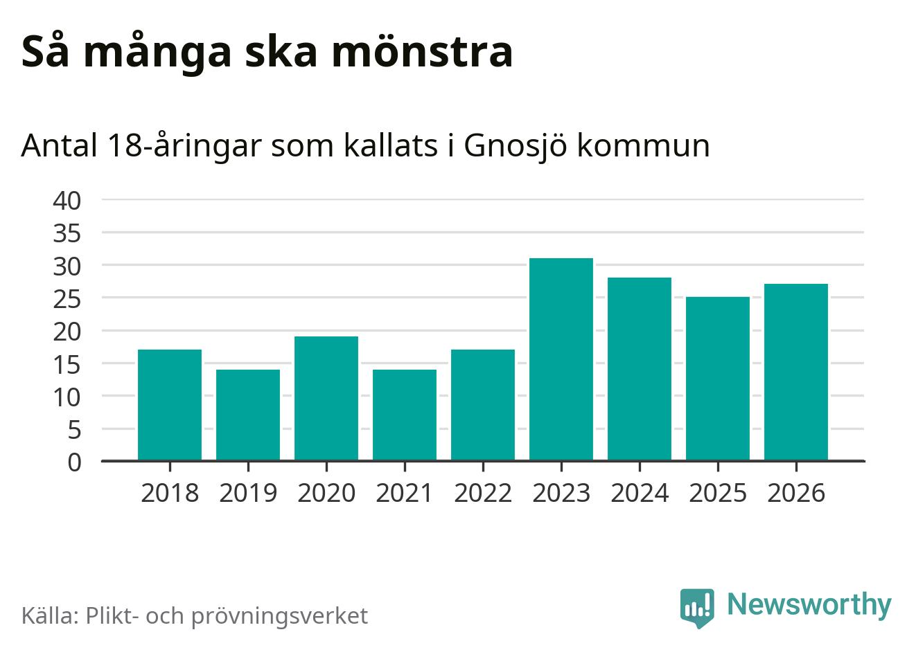 27 personer är två fler än 2025. Som mest har 31 personer från en årskull kommunen mönstrat (2023). Totalt från Jönköpings län kallas 1 124 personer i år.