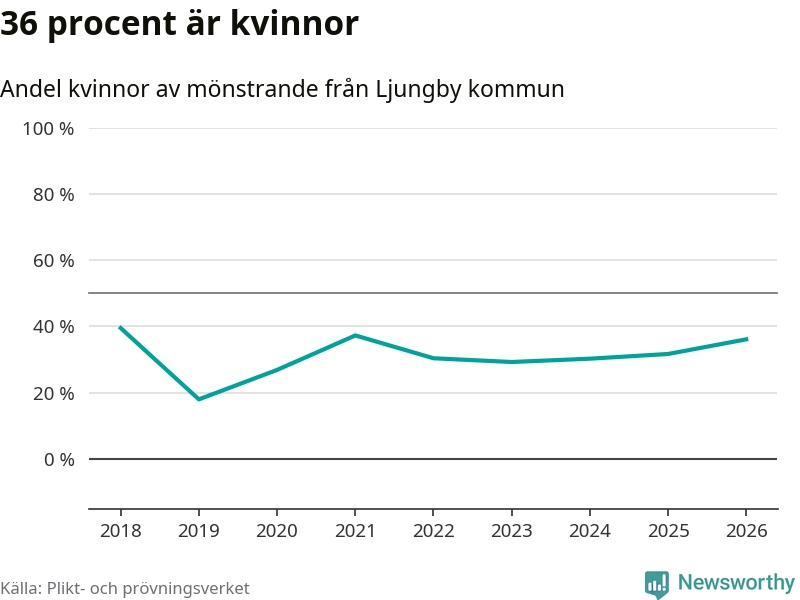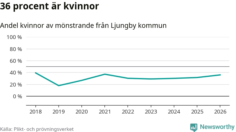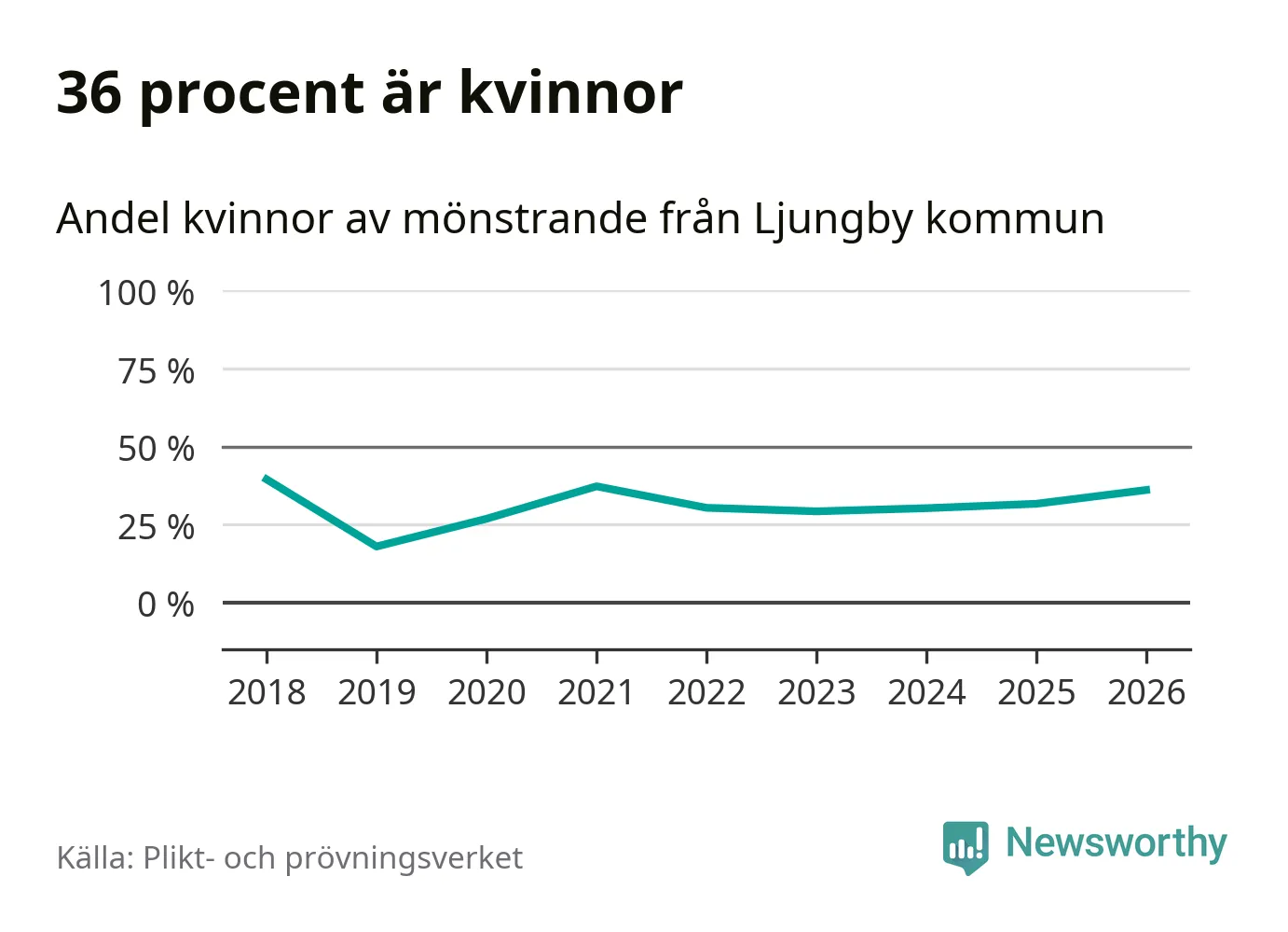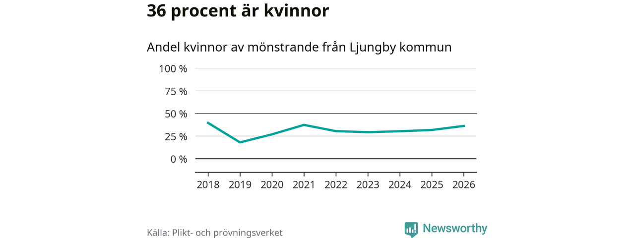 22 av de som kallats till mönstring från Ljungby är kvinnor, vilket motsvarar 36 procent av de mönstrande. Som mest har 26 kvinnor kallats från kommunen (2024). I riket som helhet är 28 procent av de mönstrande tjejer.