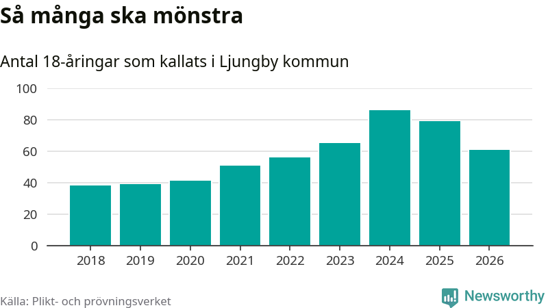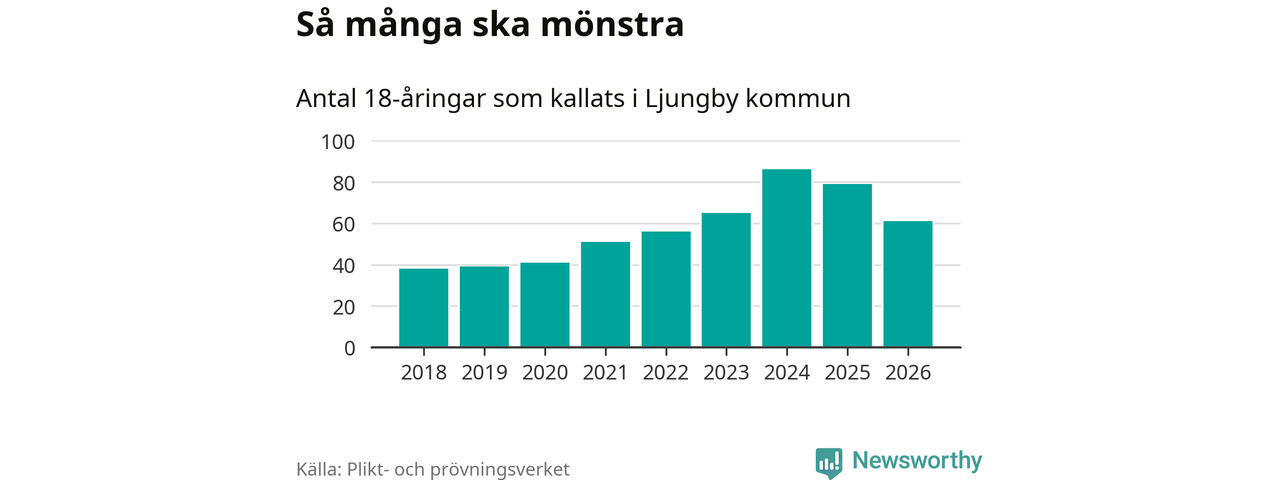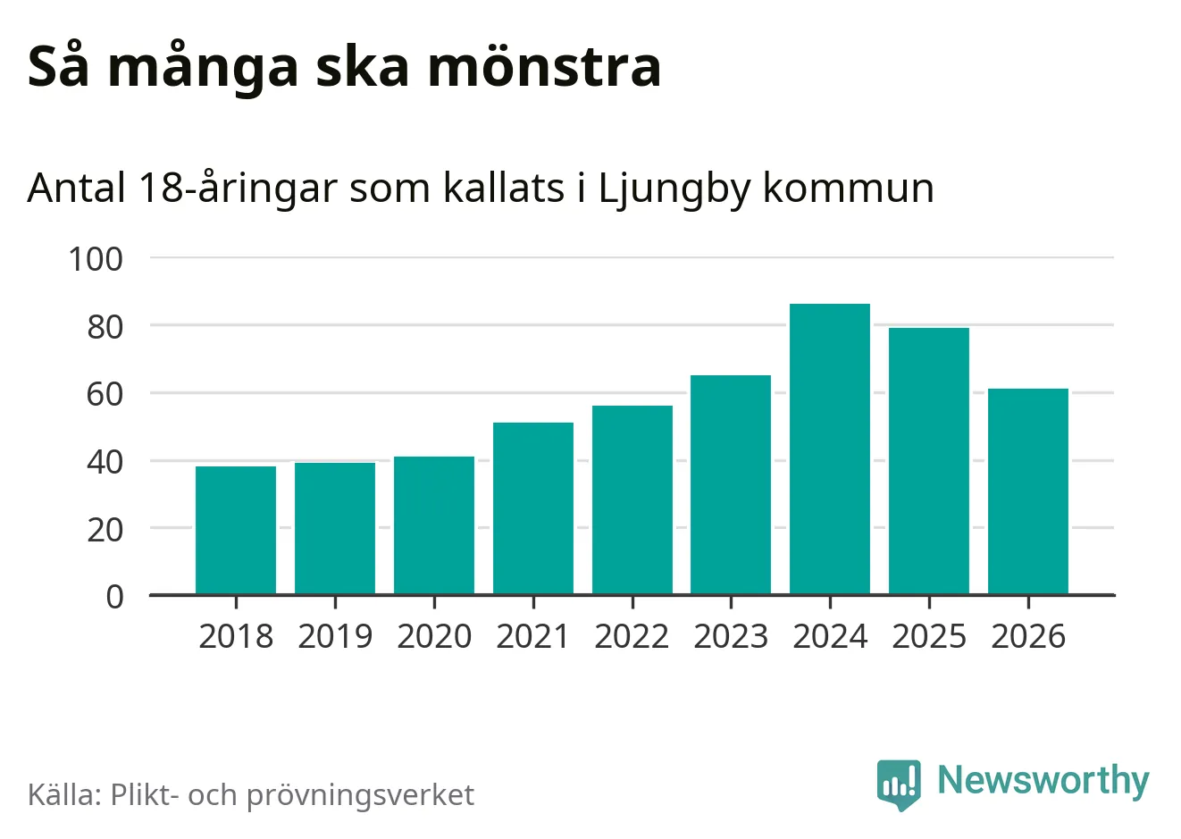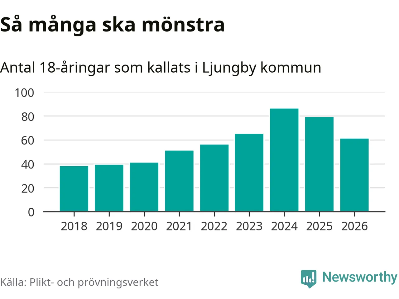 Nu kallas omkring 30 000 svenskar födda 2008 till mönstring. Och 61 av dem kommer från Ljungby, enligt ny statistik från Plikt- och prövningsverket. Det innebär att var sjätte invånare i åldersgruppen i kommunen kallas till mönstring. Det är en lägre andel än i Kronoberg totalt. I riket som helhet kallas nästan var fjärde person i årskullen.