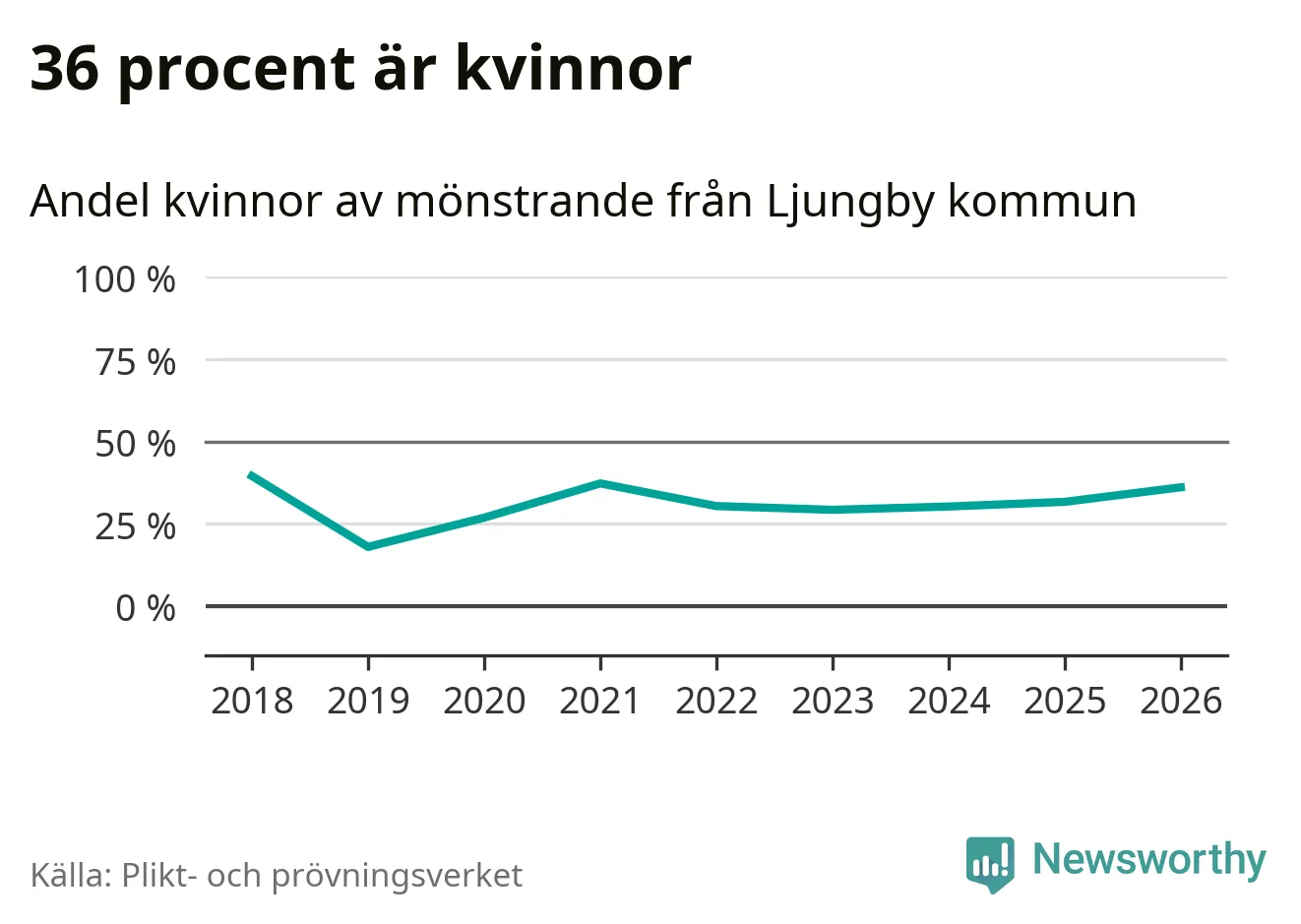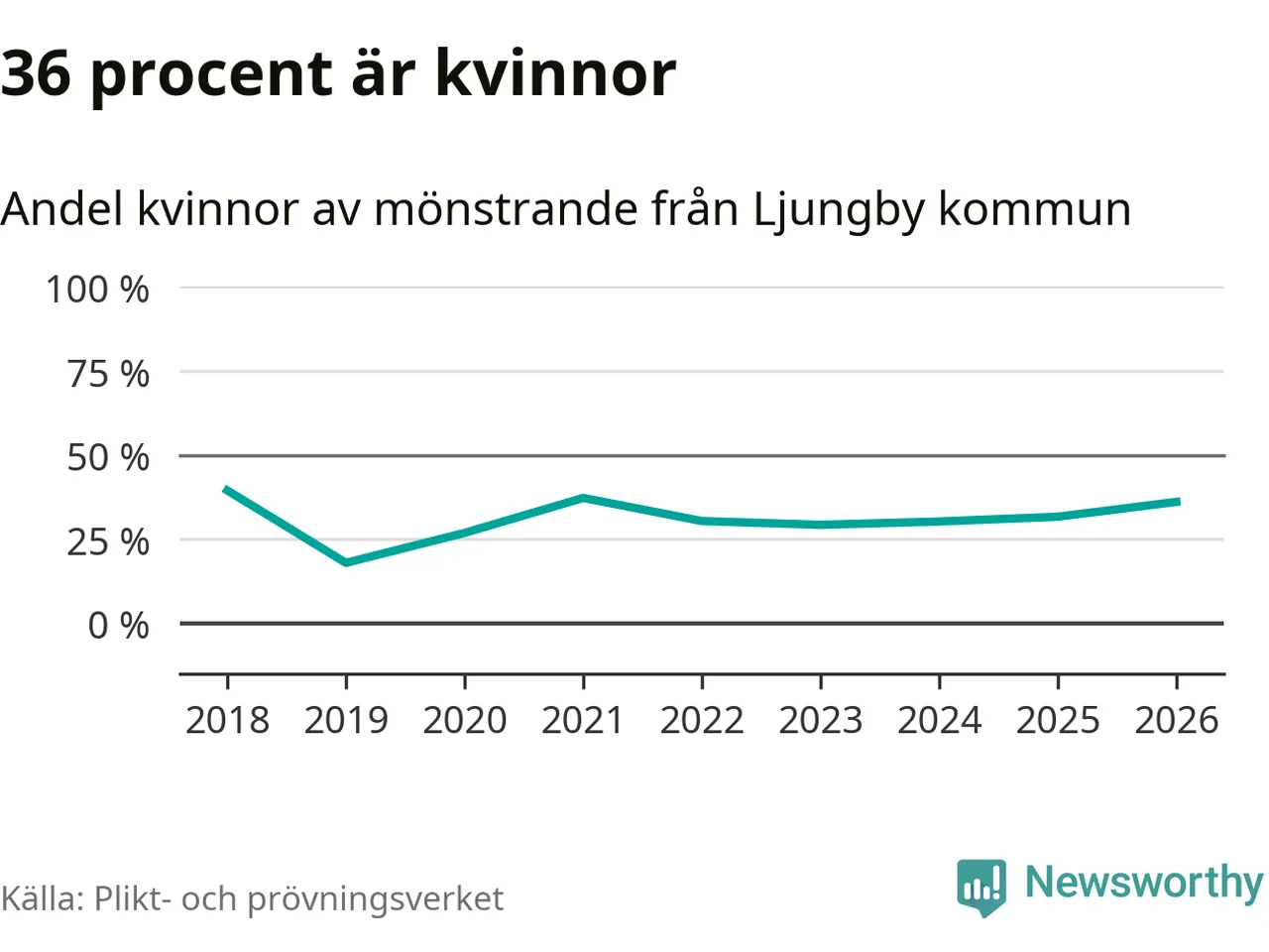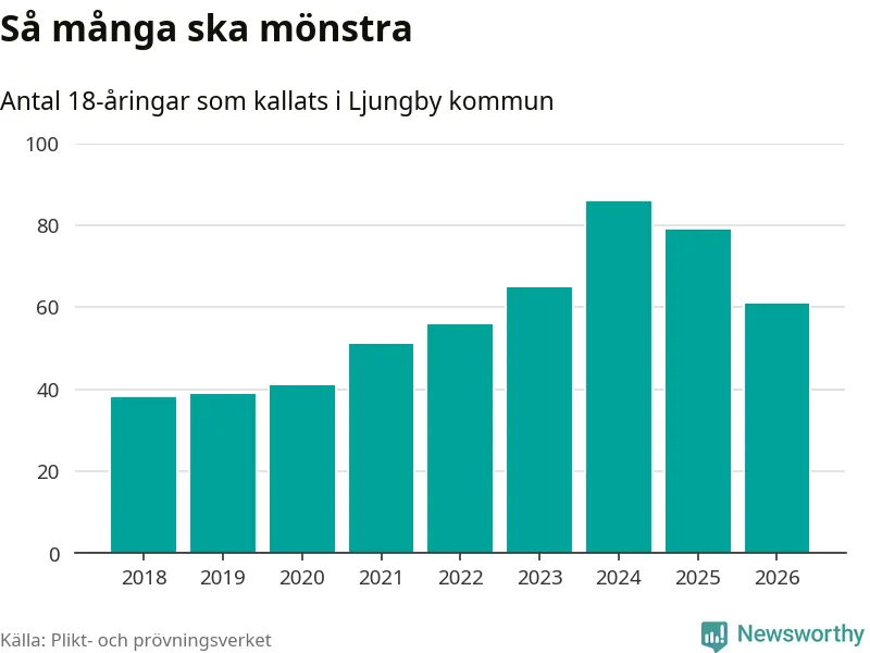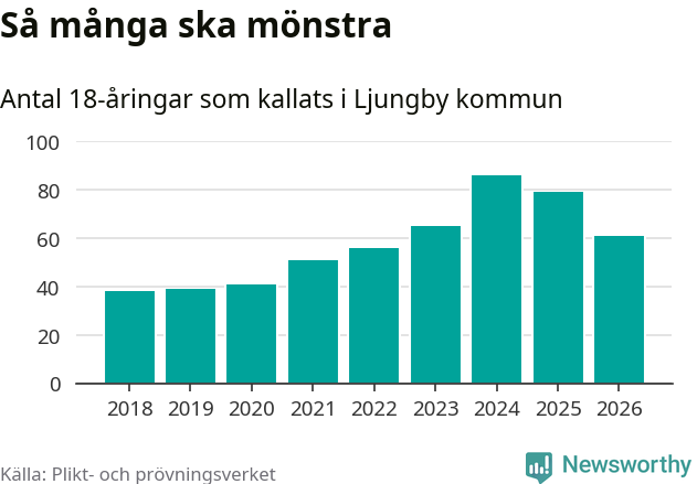 Nu kallas omkring 30 000 svenskar födda 2008 till mönstring. Och 61 av dem kommer från Ljungby, enligt ny statistik från Plikt- och prövningsverket. Det innebär att var sjätte invånare i åldersgruppen i kommunen kallas till mönstring. Det är en lägre andel än i Kronoberg totalt. I riket som helhet kallas nästan var fjärde person i årskullen.