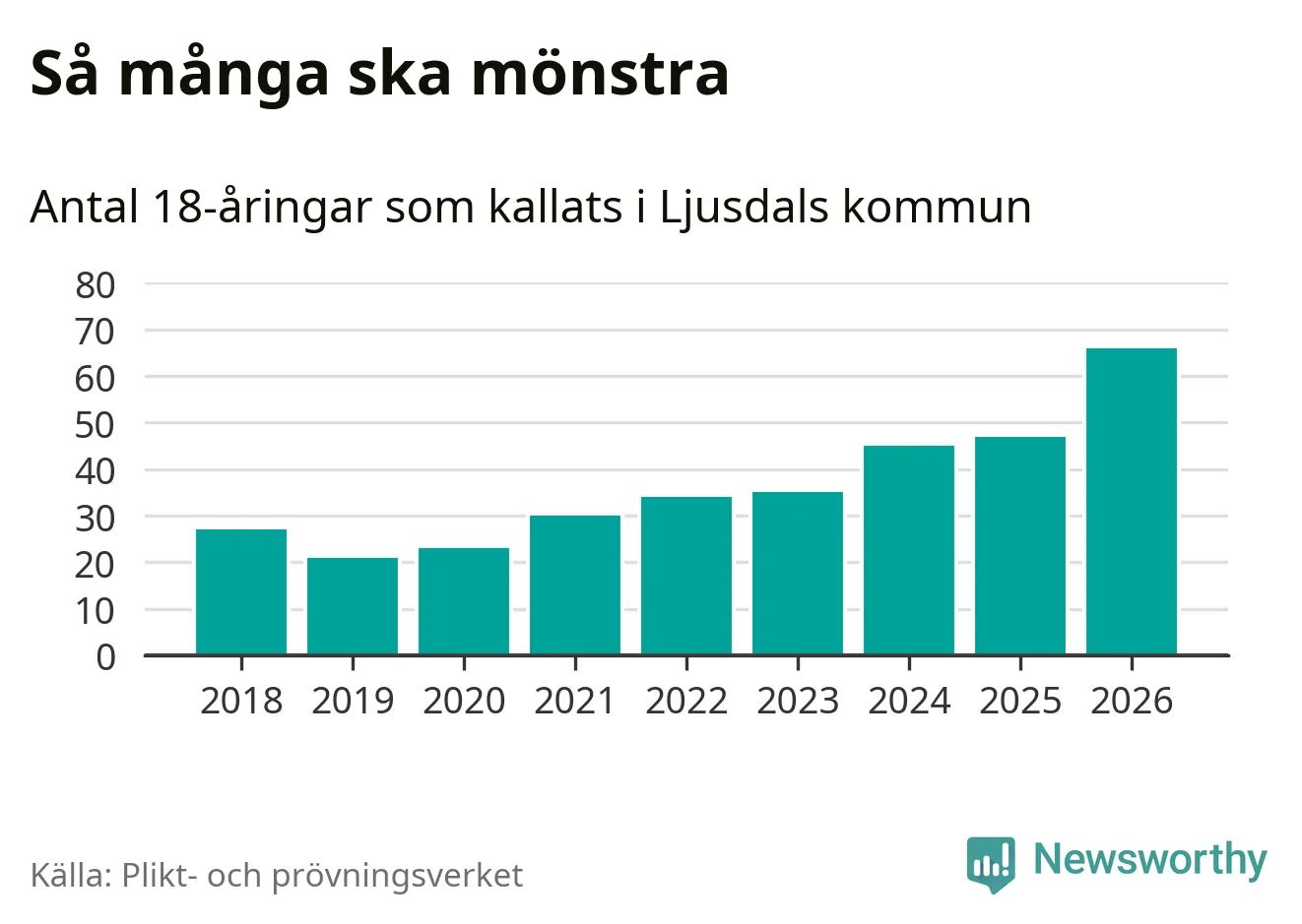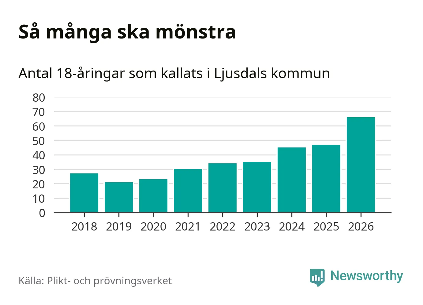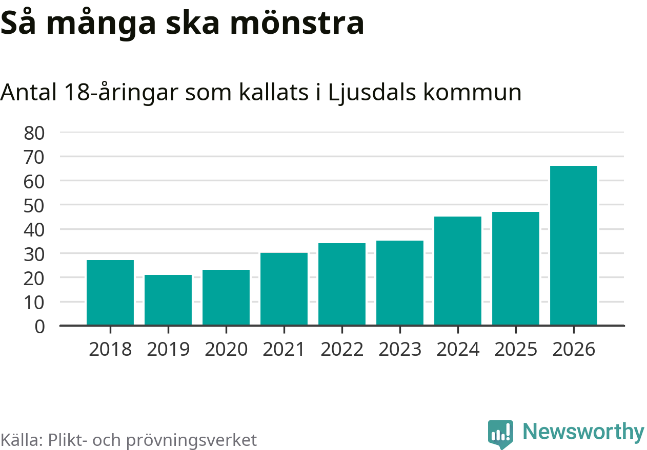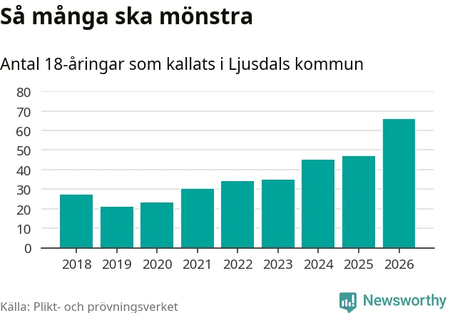 66 personer är det högsta antalet kallade i Ljusdal sedan 2018, som är första året med statistik på kommunnivå (värnplikten återinfördes 2017), och 19 mönstrande fler än 2025. Totalt från Gävleborgs län kallas 929 personer i år.