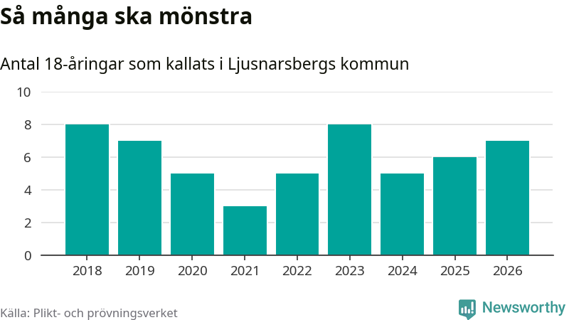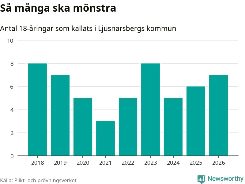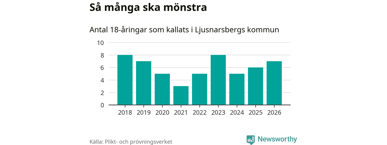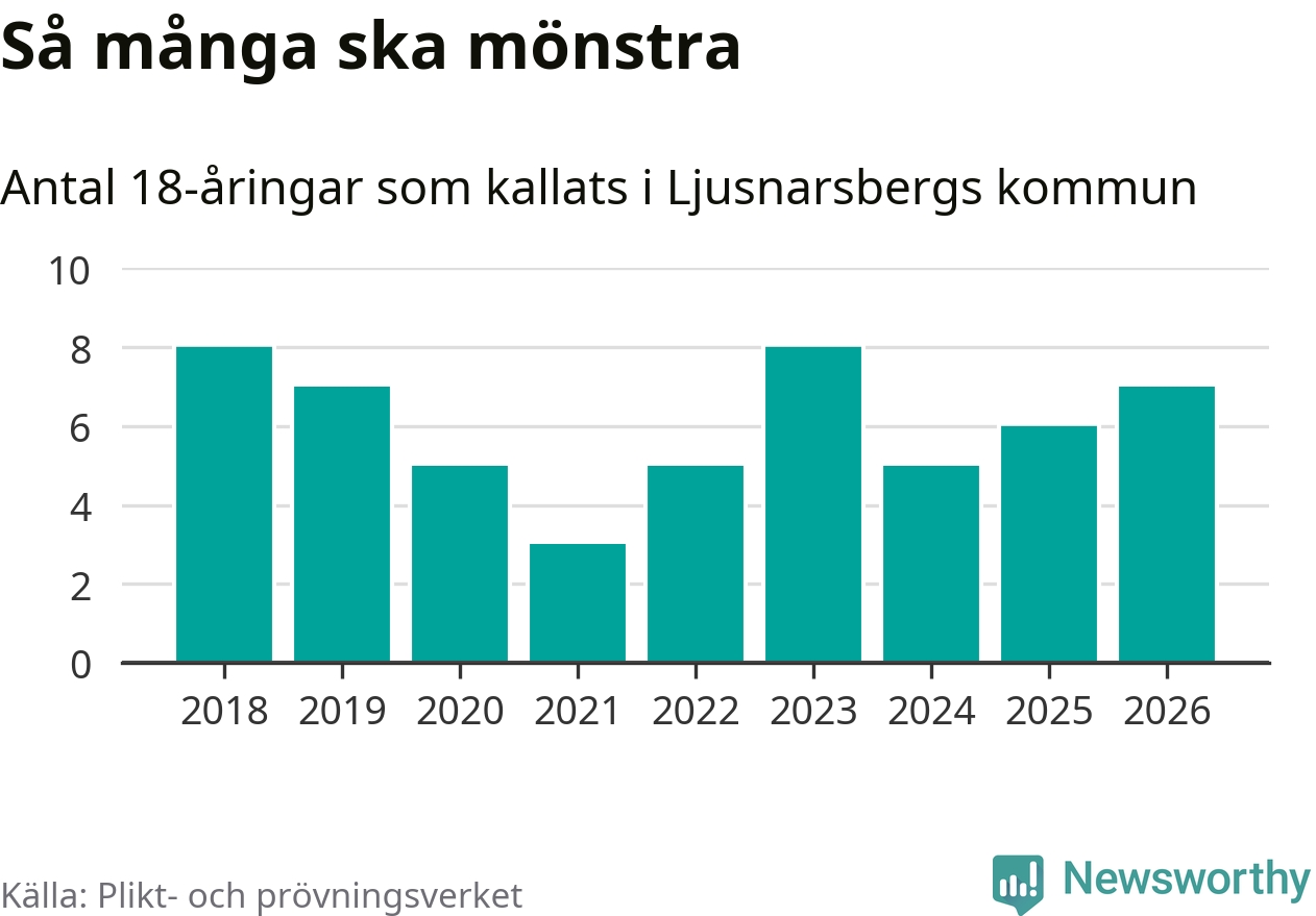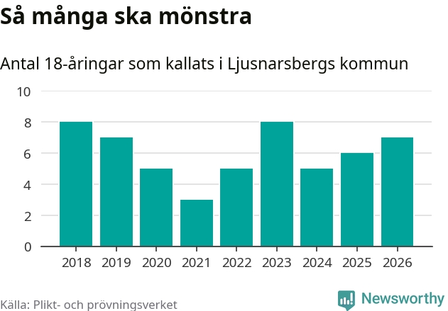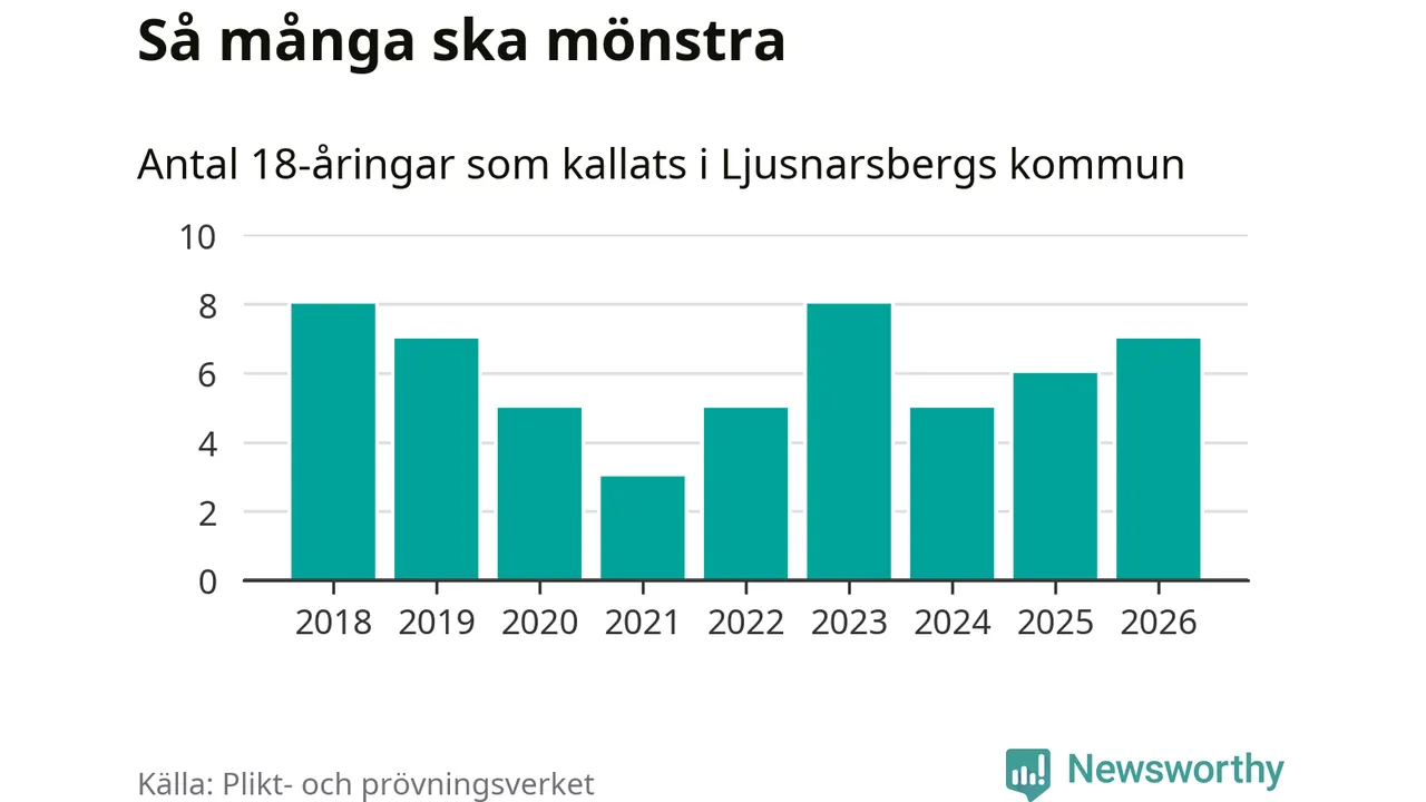 Sju personer är en fler än 2025. Som mest har åtta personer från en årskull kommunen mönstrat (2023 och 2018). Totalt från Örebro län kallas 850 personer i år.
